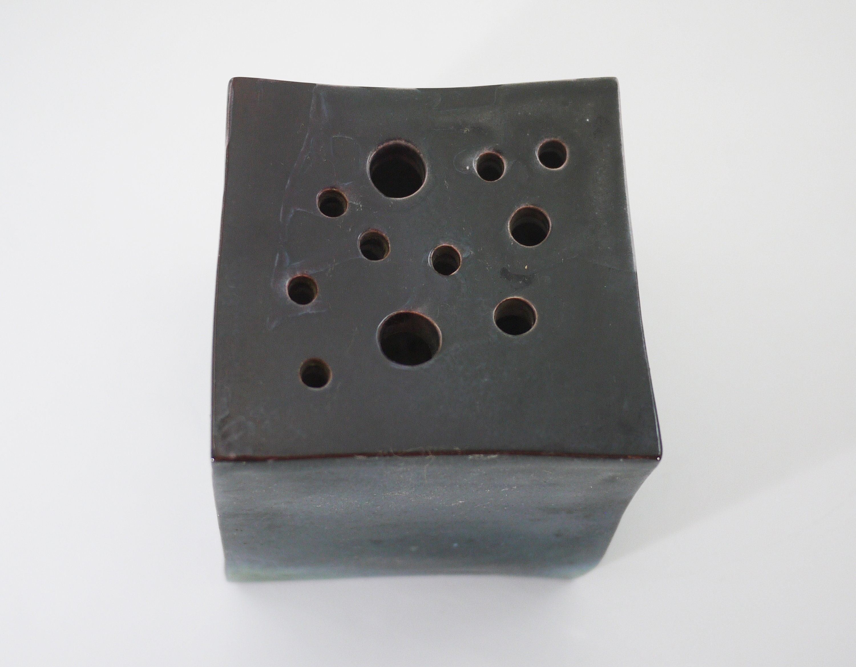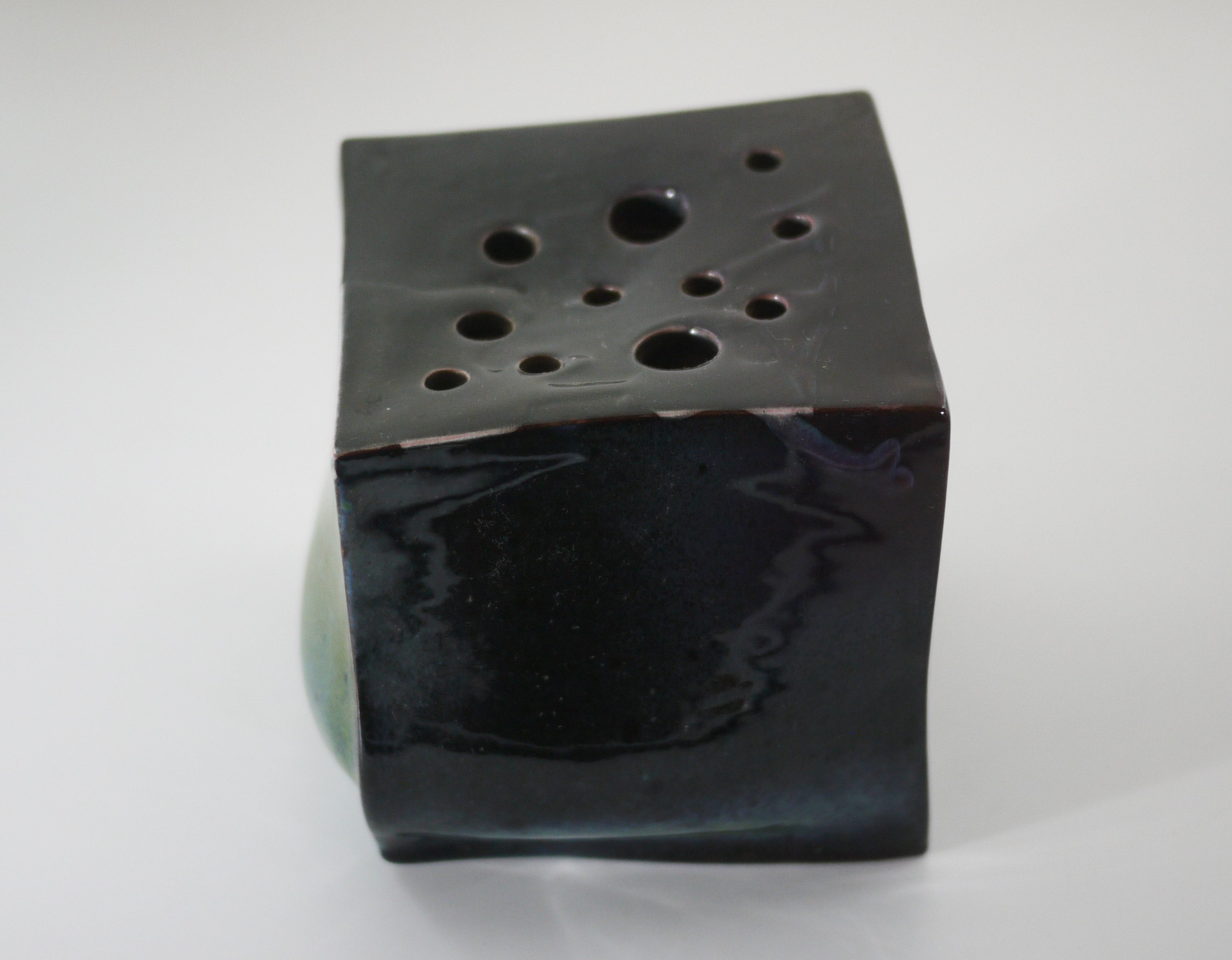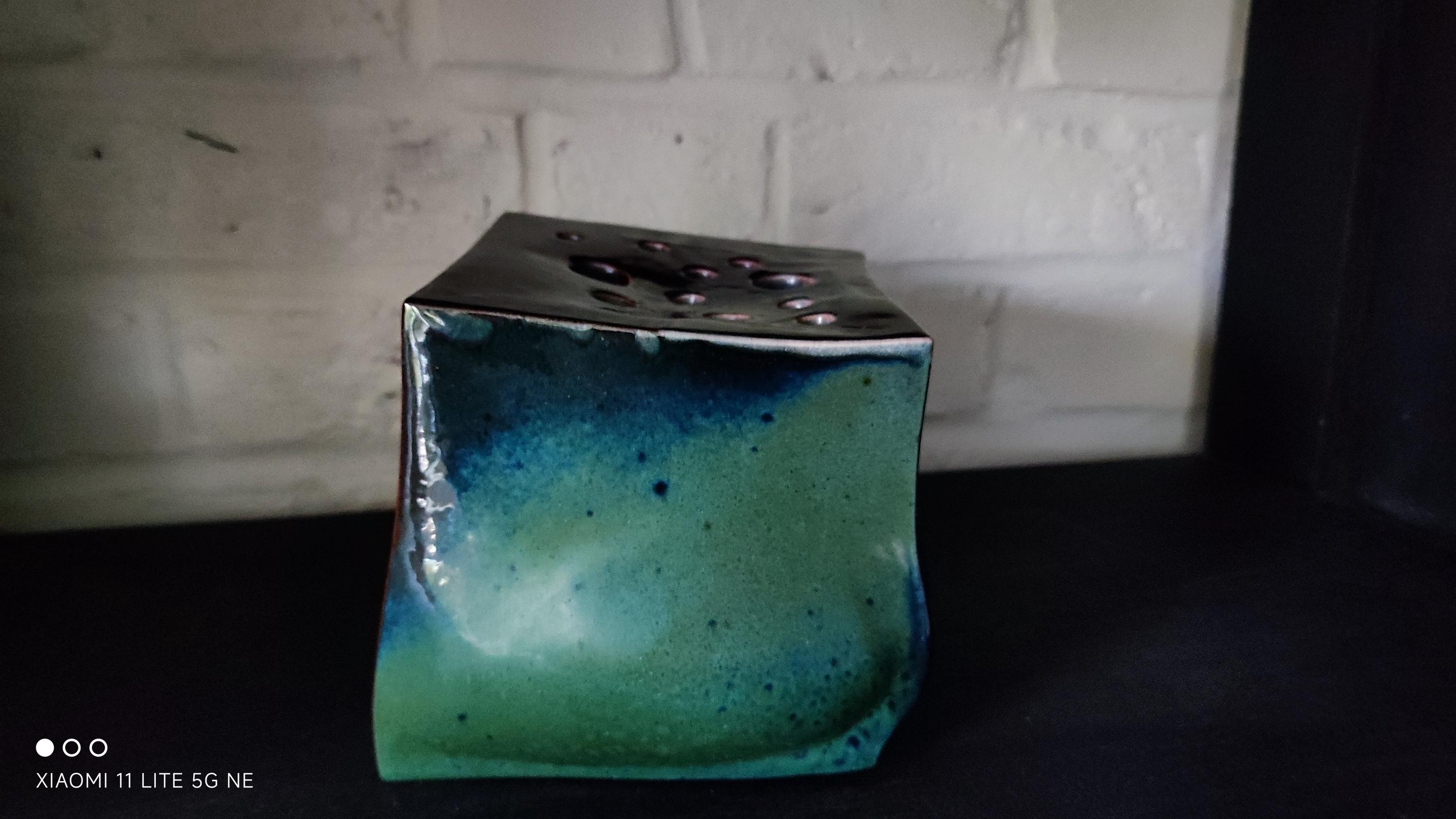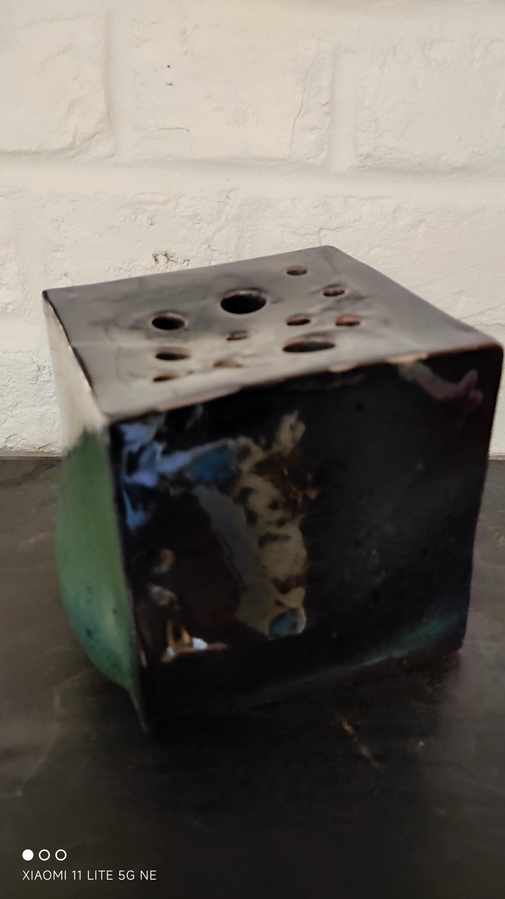 Here is a very unique and modern design vase in green and blue moiré glazed ceramic from the 1960s. With an irregular cubic shape, this flower pick is a fantastic abstract and minimalist sculpture. You can stick fresh or dried flowers in it with its 12 holes of different sizes. It is a unique decorative object in itself!