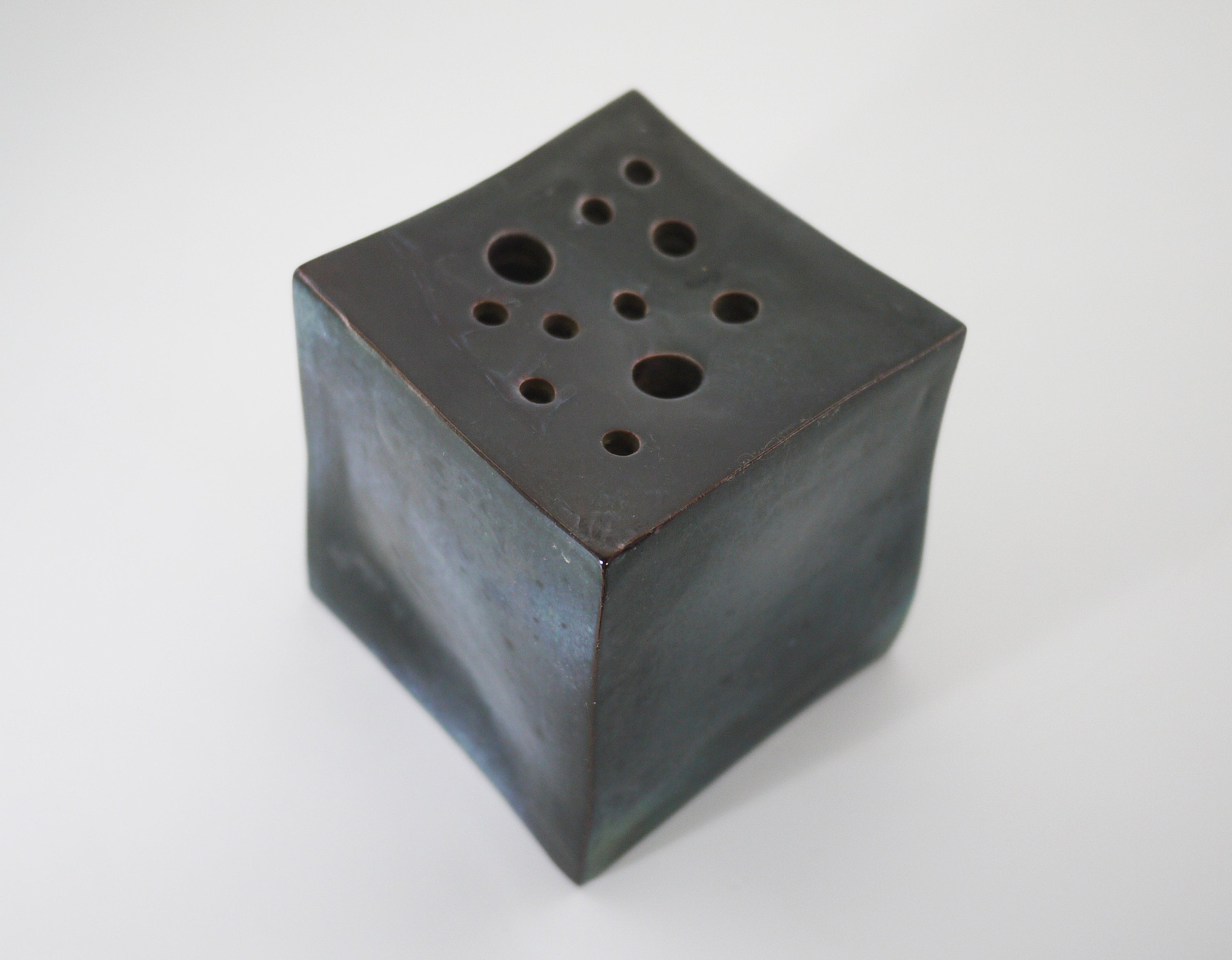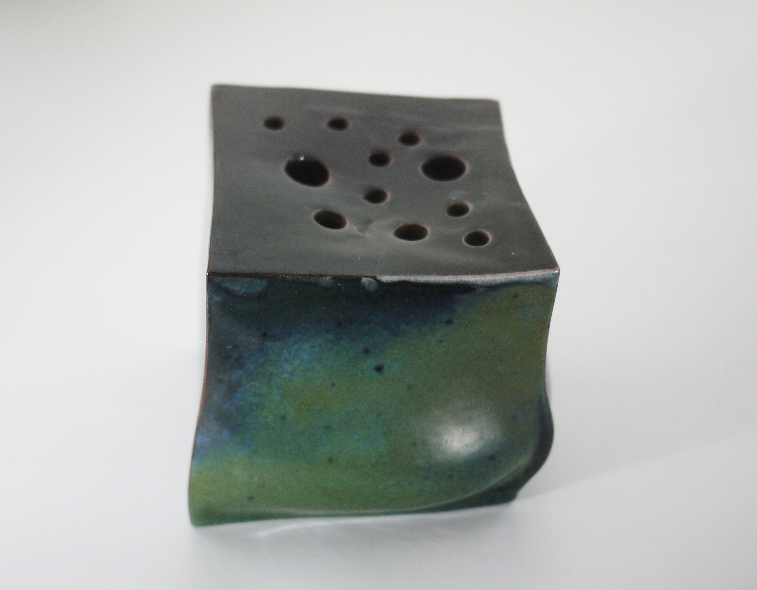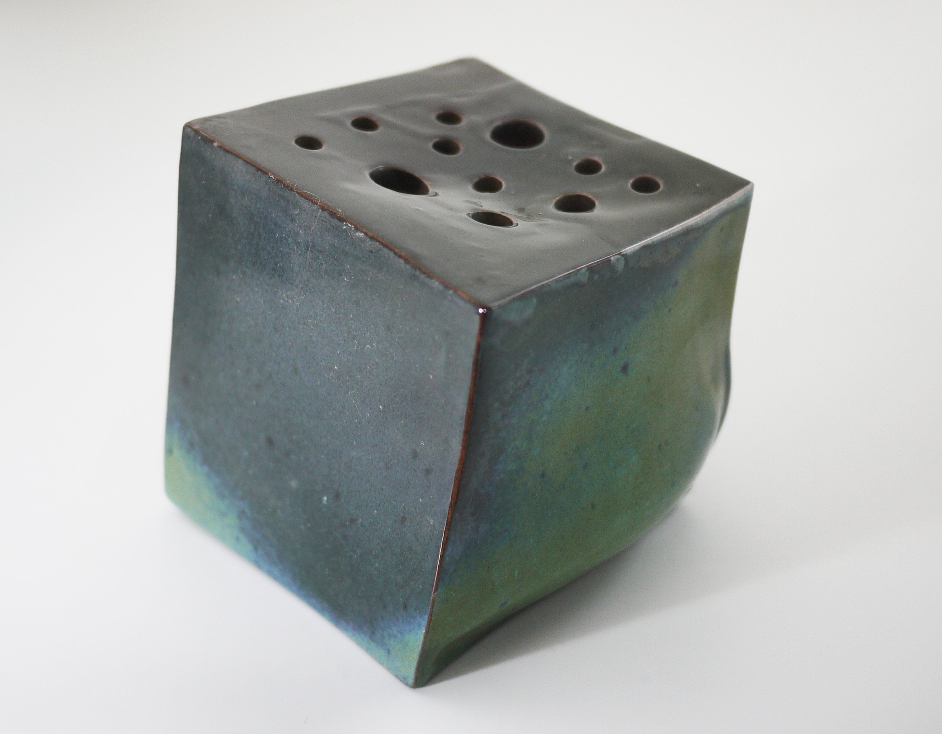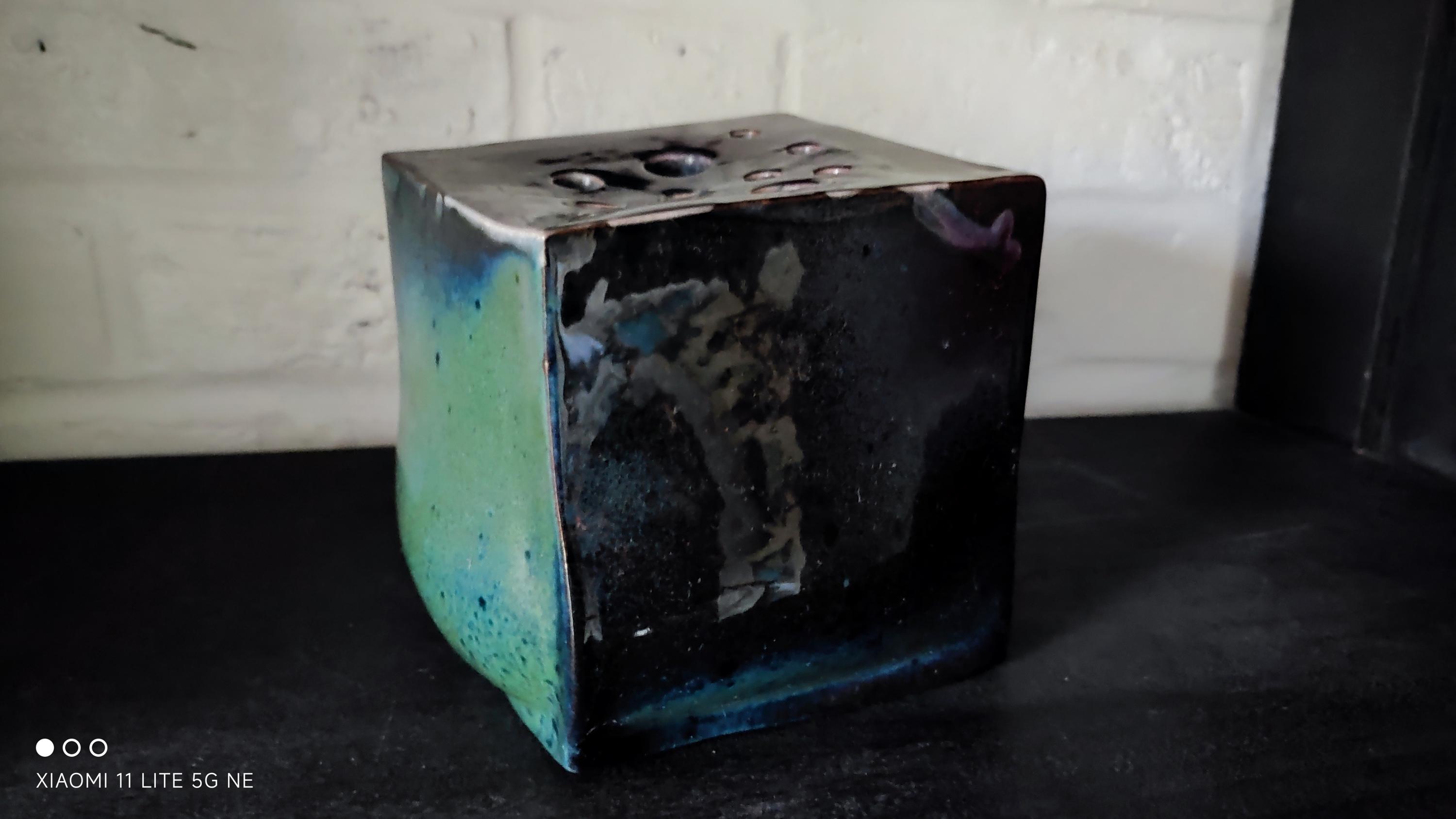Here is a very unique and modern design vase in green and blue moiré glazed ceramic from the 1960s. With an irregular cubic shape, this flower pick is a fantastic abstract and minimalist sculpture. You can stick fresh or dried flowers in it with its 12 holes of different sizes. It is a unique decorative object in itself!