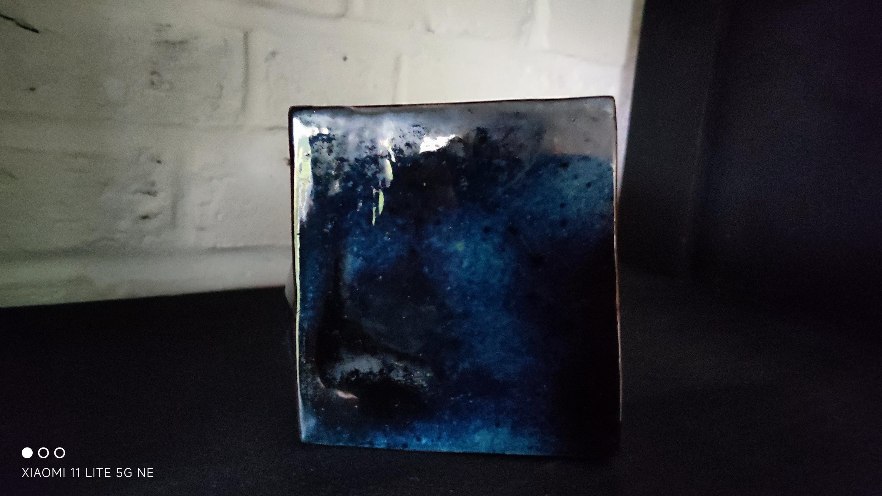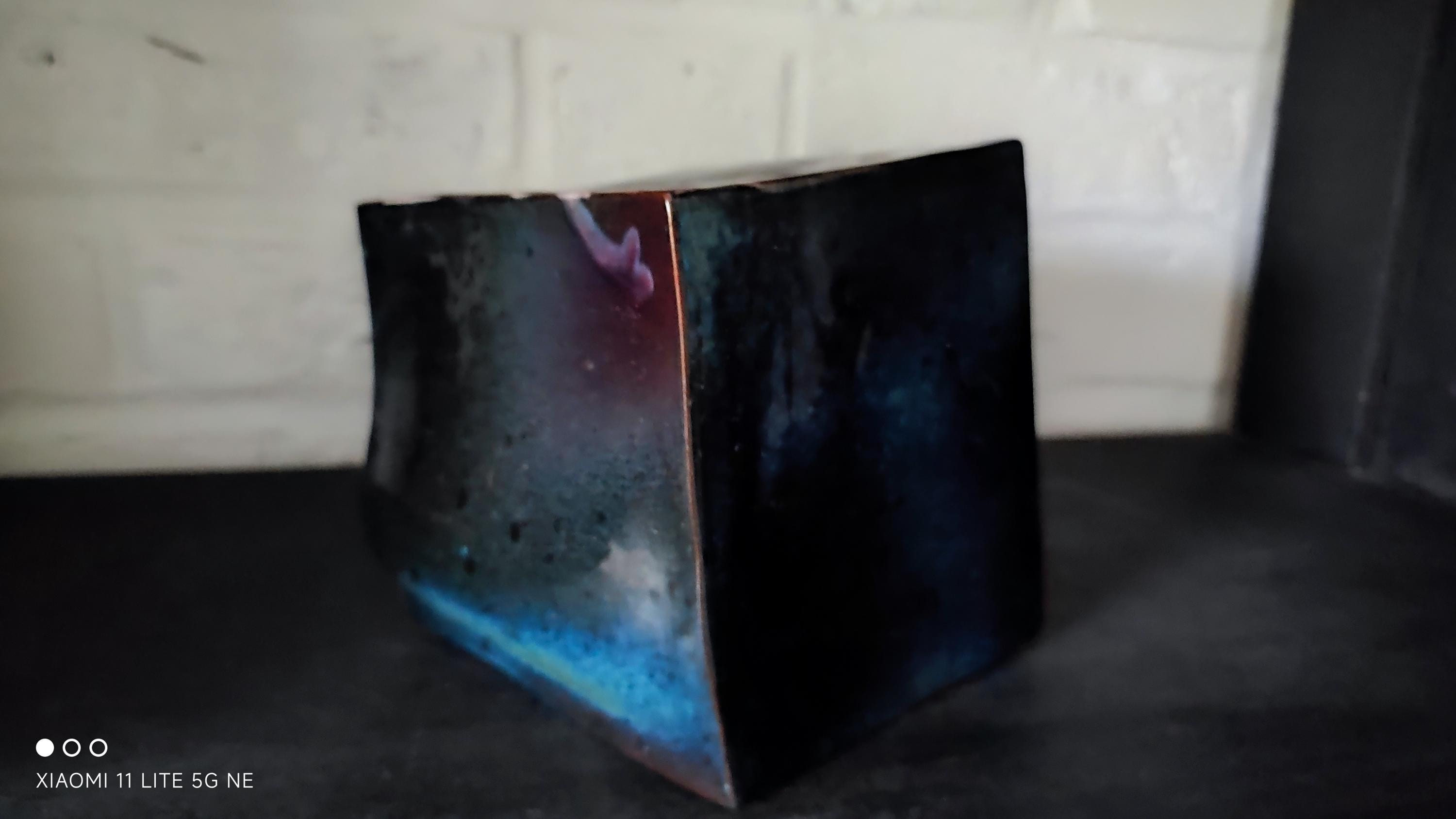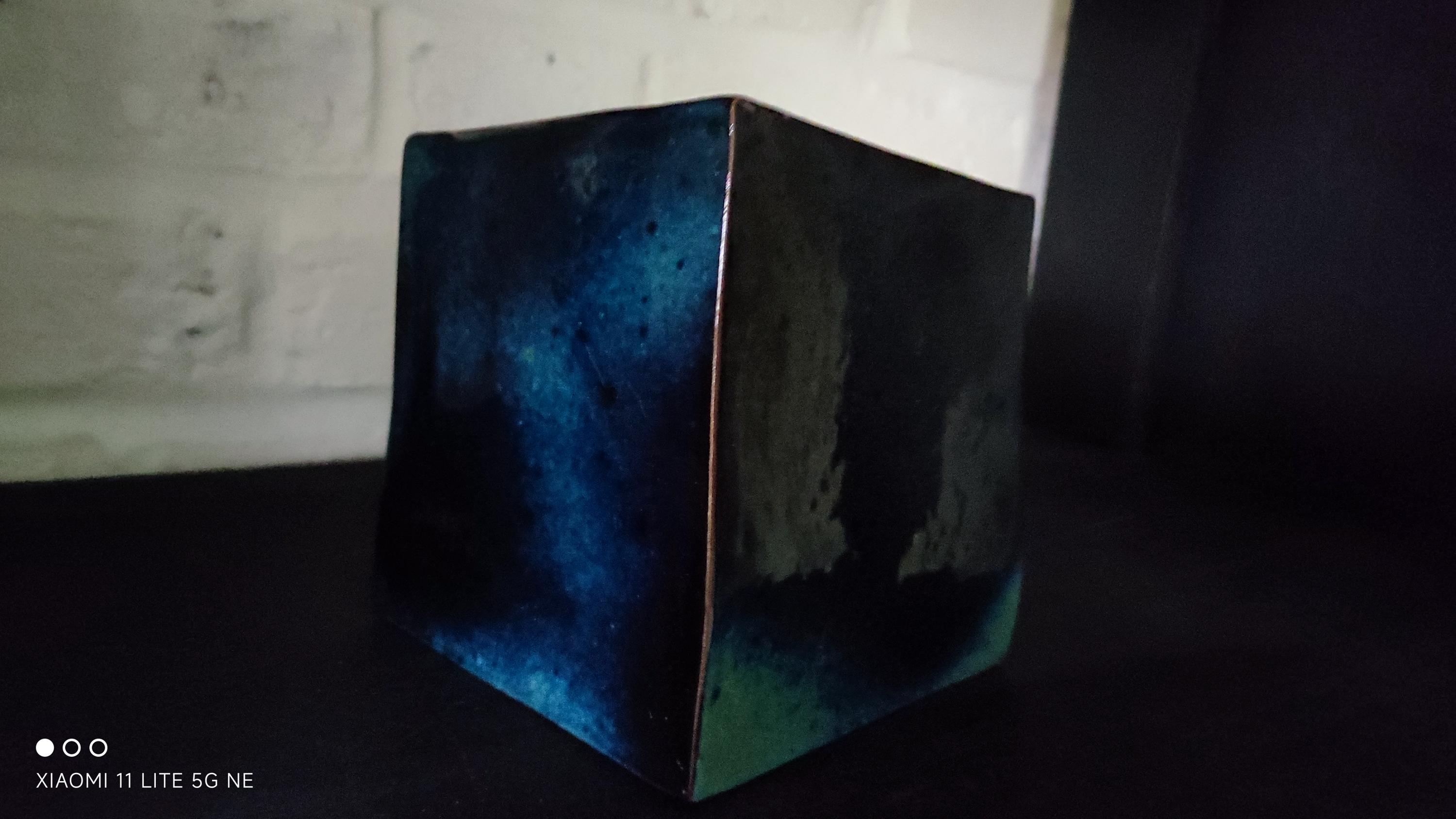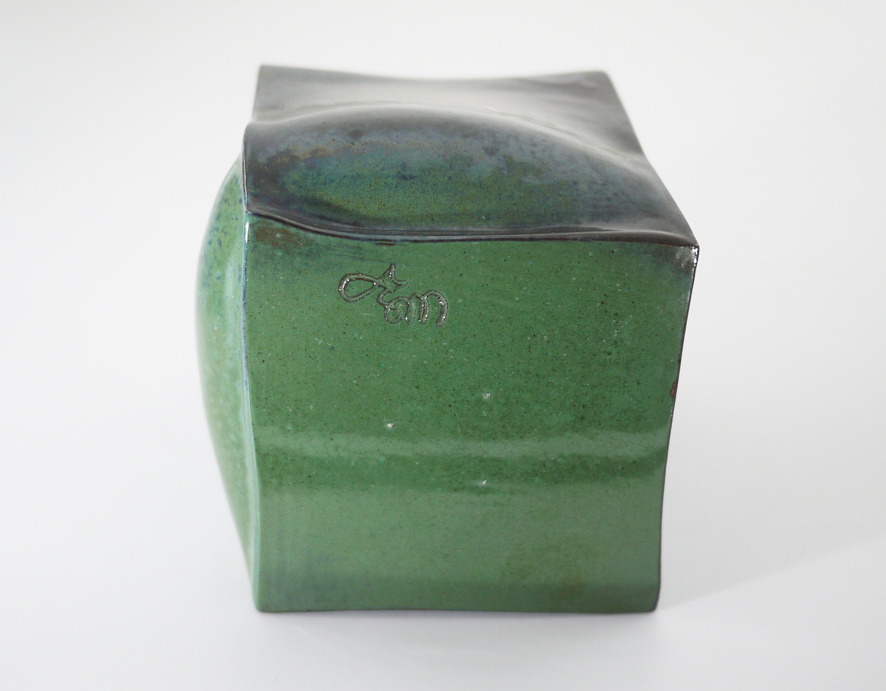 Here is a very unique and modern design vase in green and blue moiré glazed ceramic from the 1960s. With an irregular cubic shape, this flower pick is a fantastic abstract and minimalist sculpture. You can stick fresh or dried flowers in it with its 12 holes of different sizes. It is a unique decorative object in itself!