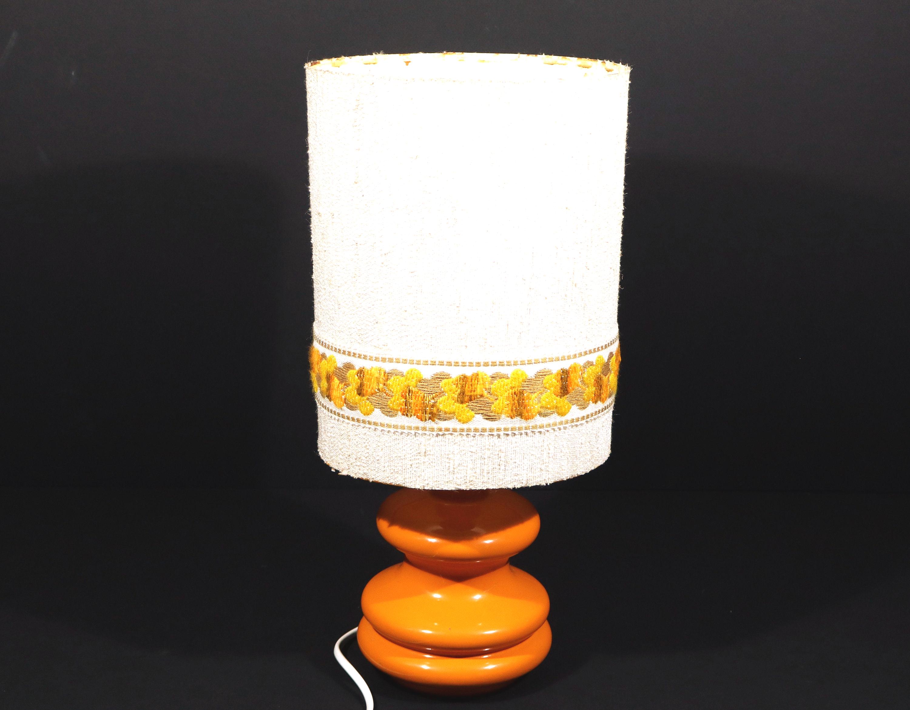 Vintage orange table lamp from the 1960s-70s The lamp base is made of orange molded glass and the lampshade is made of fabric imitating woven silk surrounded by a floral braid. Bedside lamp, mood lamp totally in the retro flower power style which will find a place whatever the style of your vintage interior!