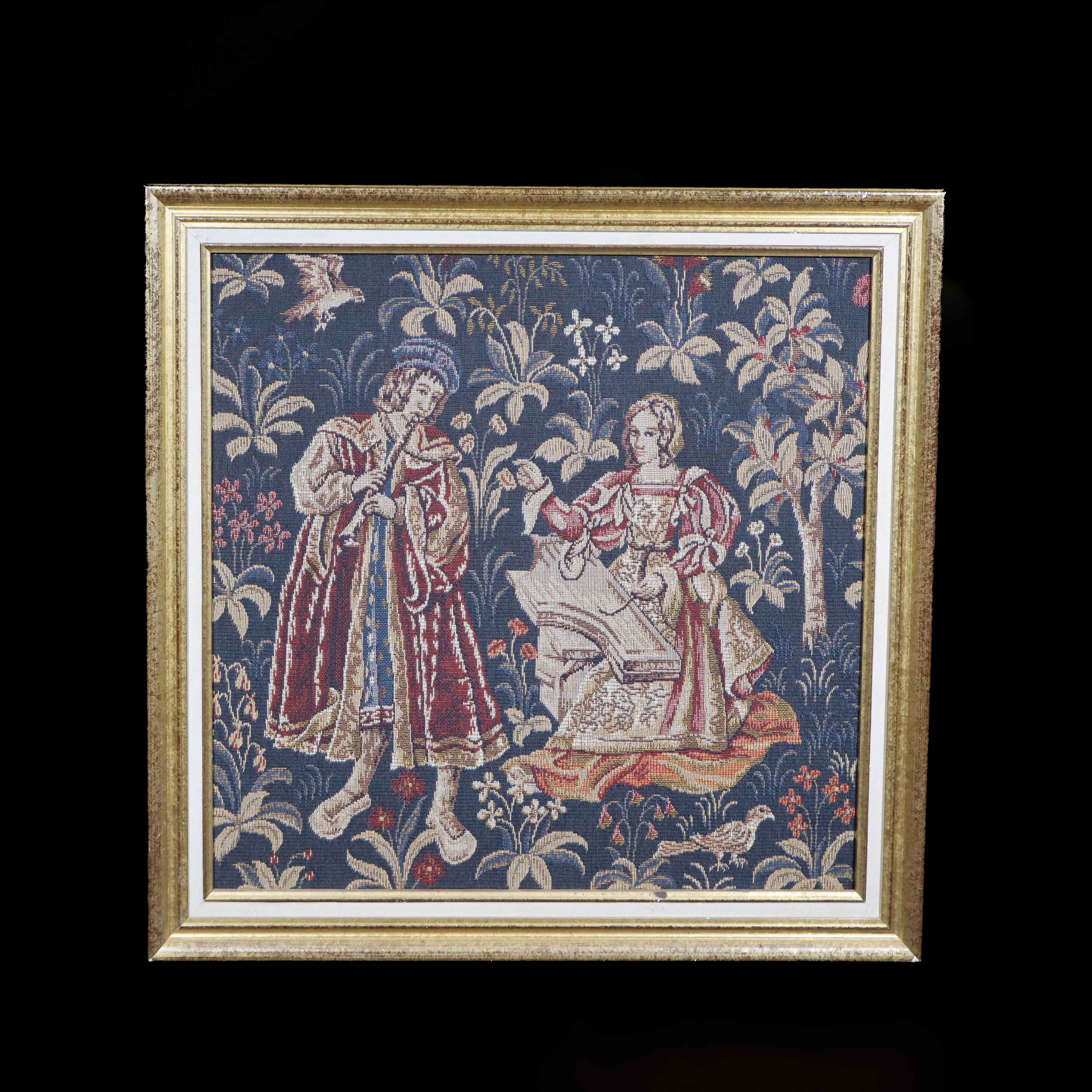 Vintage tapisserie médiévale française avec un cadre en bois doré des Années 1950s. Tissage jacquard mécanique en coton dans le style d'Aubusson avec une scène de la vie Seigneuriale représentant un couple de musicien. Cette élégante tapisserie à décor médiéval avec son cadre en bois doré réalisé à l'époque sur mesure trouvera une place sur votre mur quel que soit le style de votre intérieur.