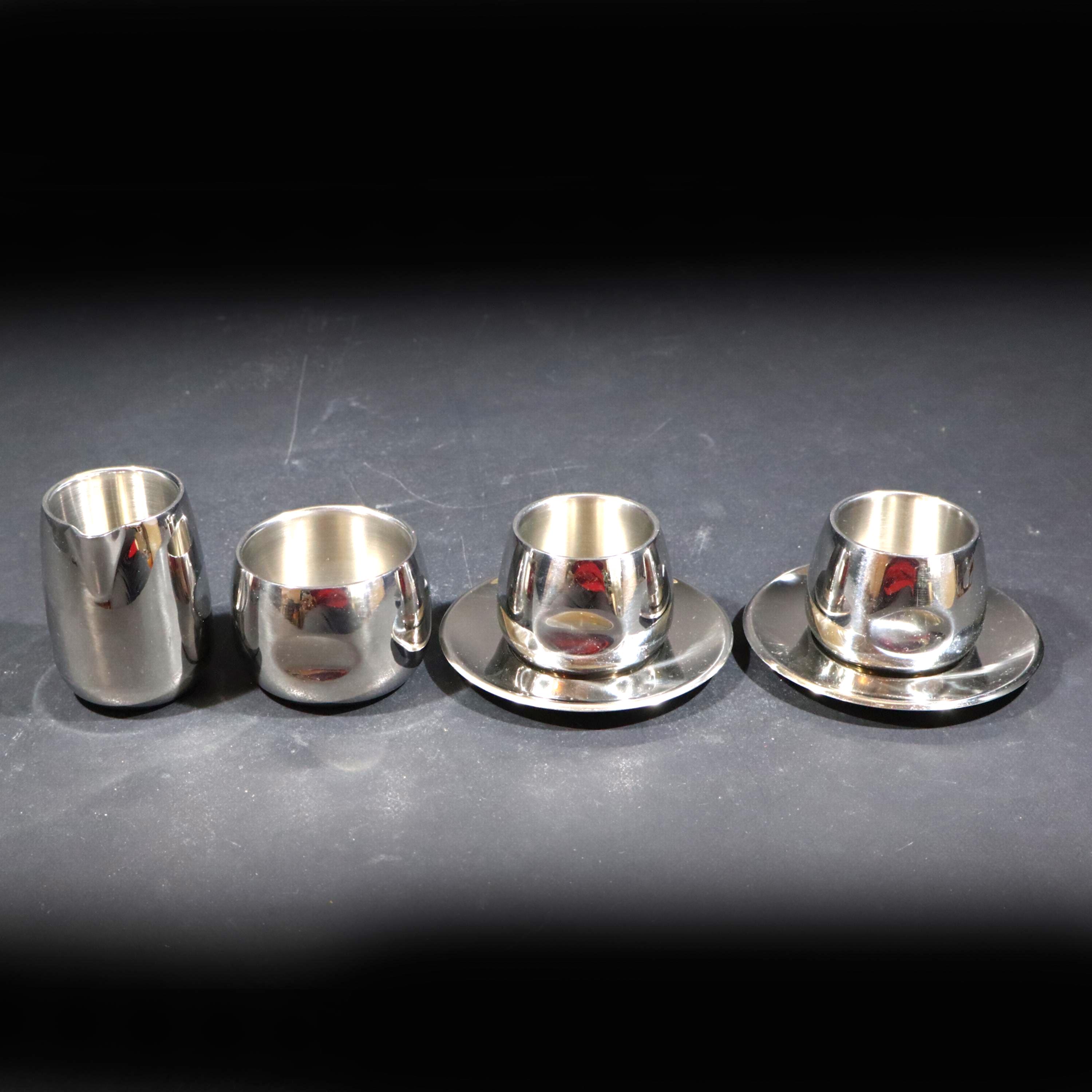 Set of 2 vintage AMC Art Design espresso cups with sugar bowl and creamer in stainless steel made in Italy from the 1970s. Set consisting of 2 double-walled cups and 2 saucers with a very modern and refined design with the sugar pot and the milk jug that are matching.