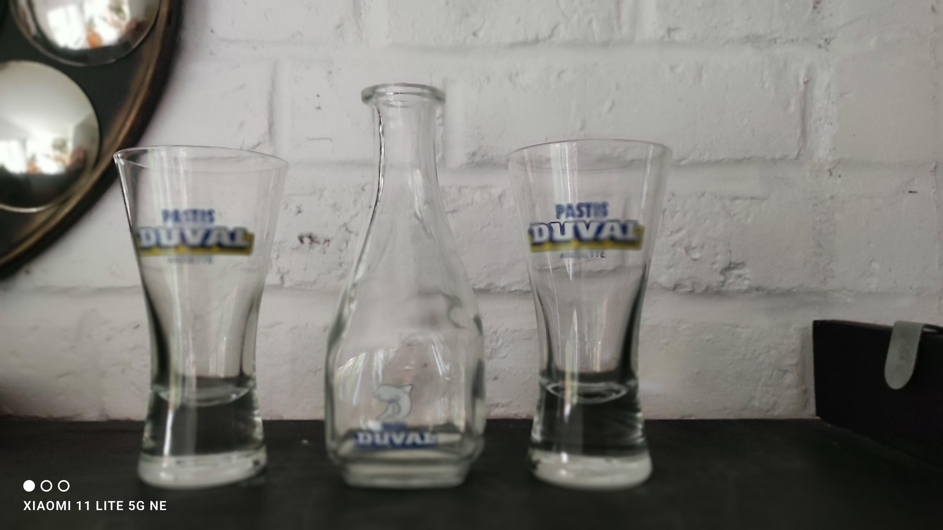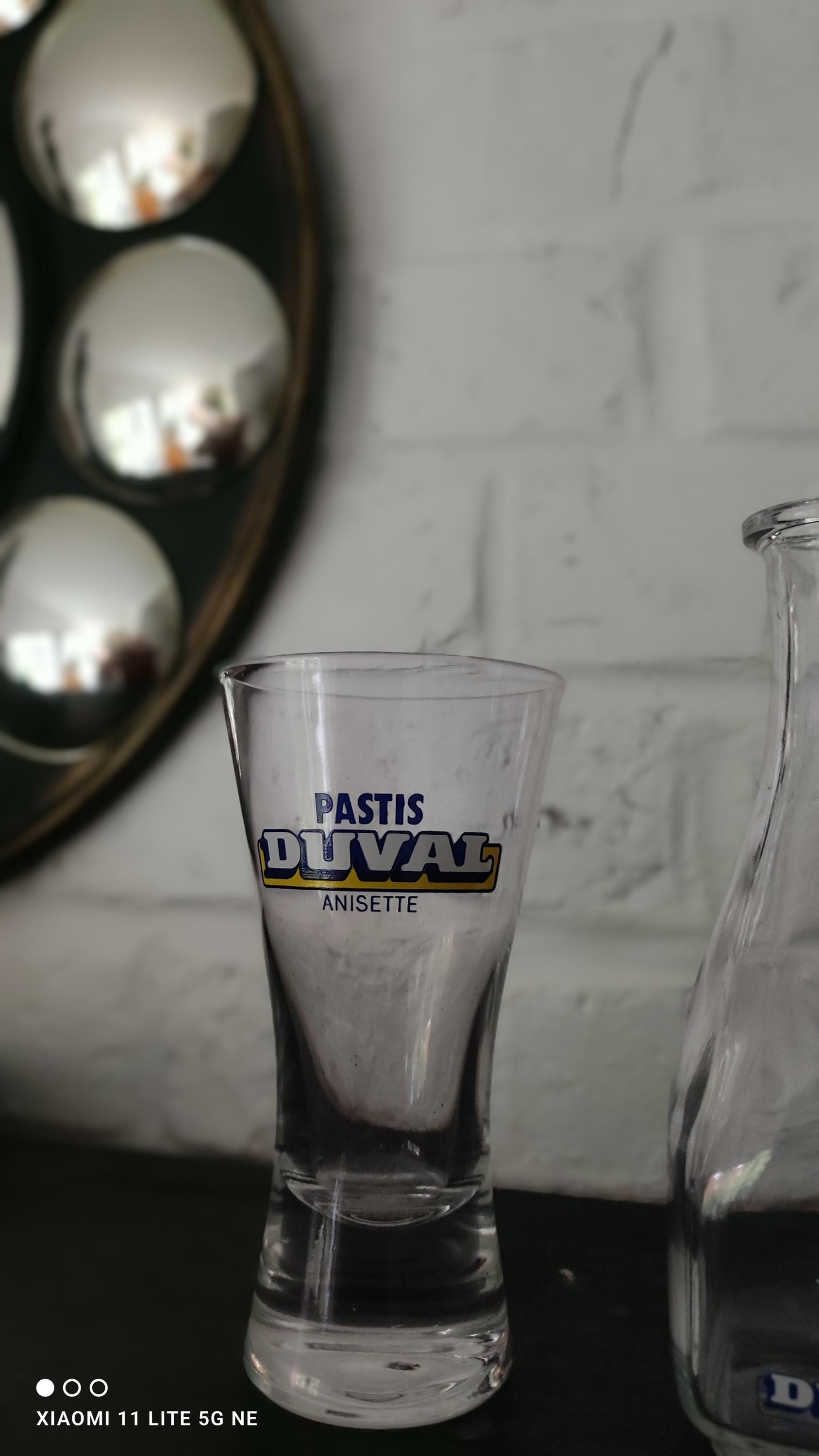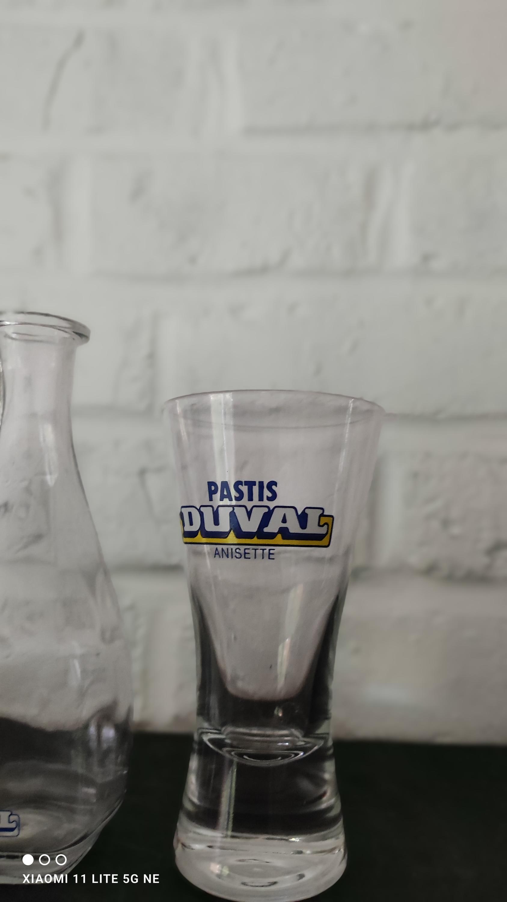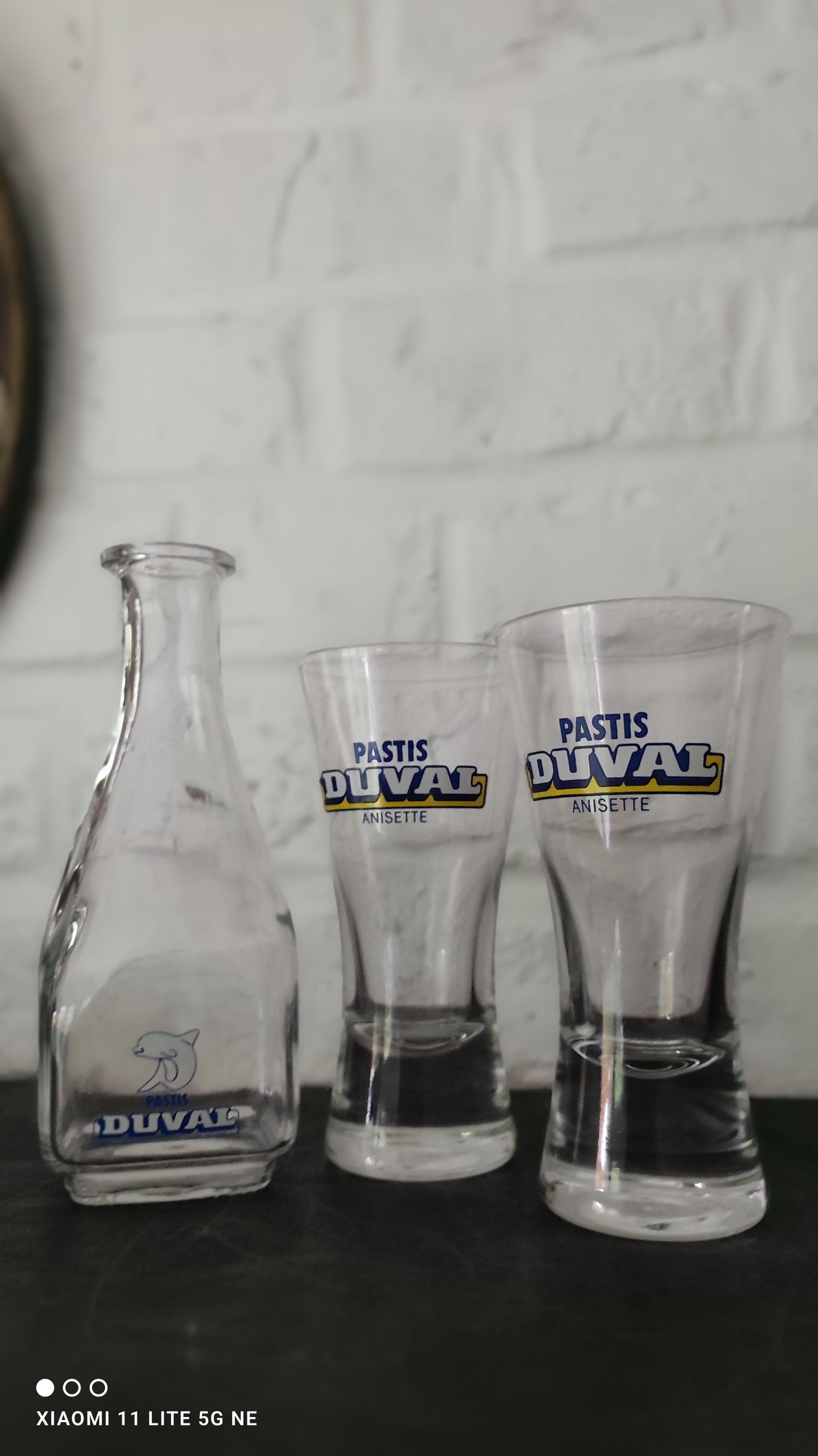 The vintage Pastis Duval carafe and glasses are in perfect condition.
