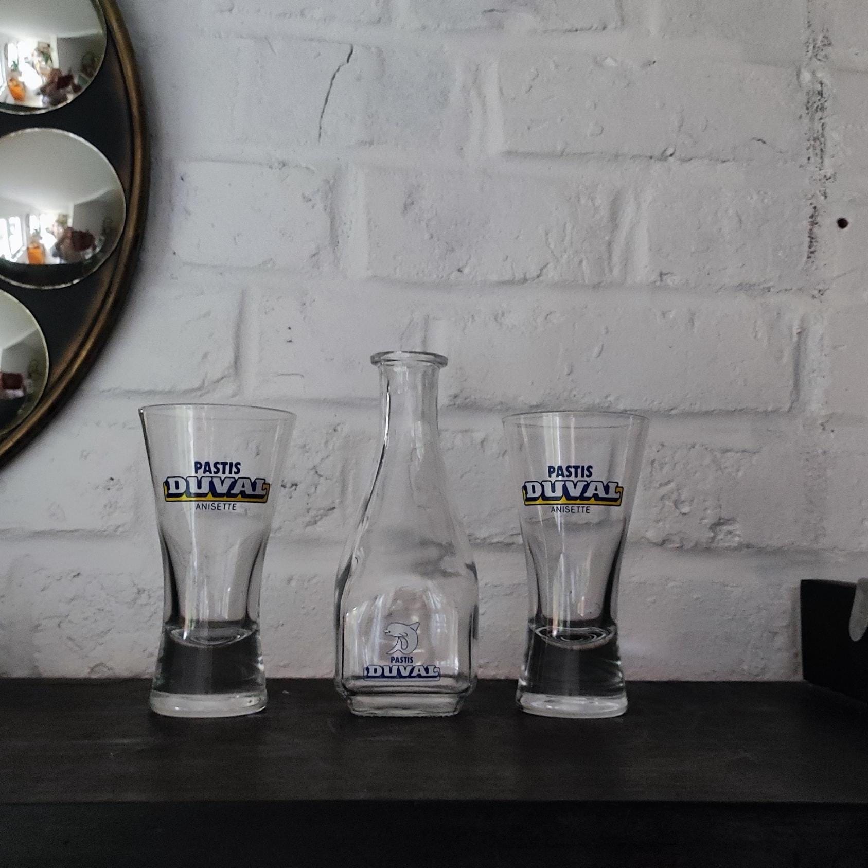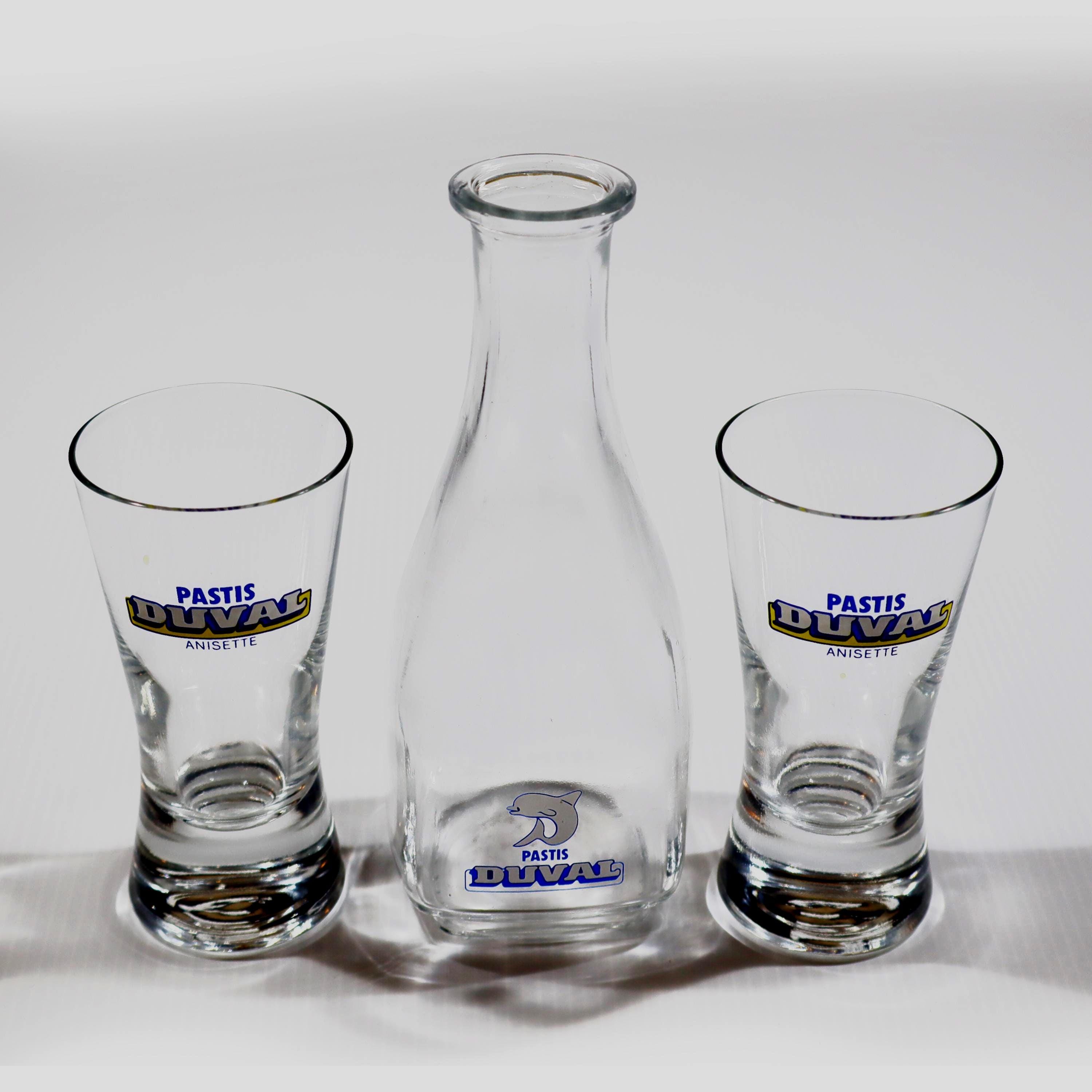 Vintage Pastis Duval set consisting of a 25 cl glass carafe with the dolphin logo on one side and two Pastis Duval Anisette glasses from the 1950s-60s. Pastis Duval is one of the main pastis brands in Marseille. Fritz Duval inherited the absinthe distillery that his uncle, Major Dugied, founded in 1798. In 1915, following the ban on absinthe in France, Fritz Duval developed a Marseille anise called Pastis Duval, which became a hit in France.