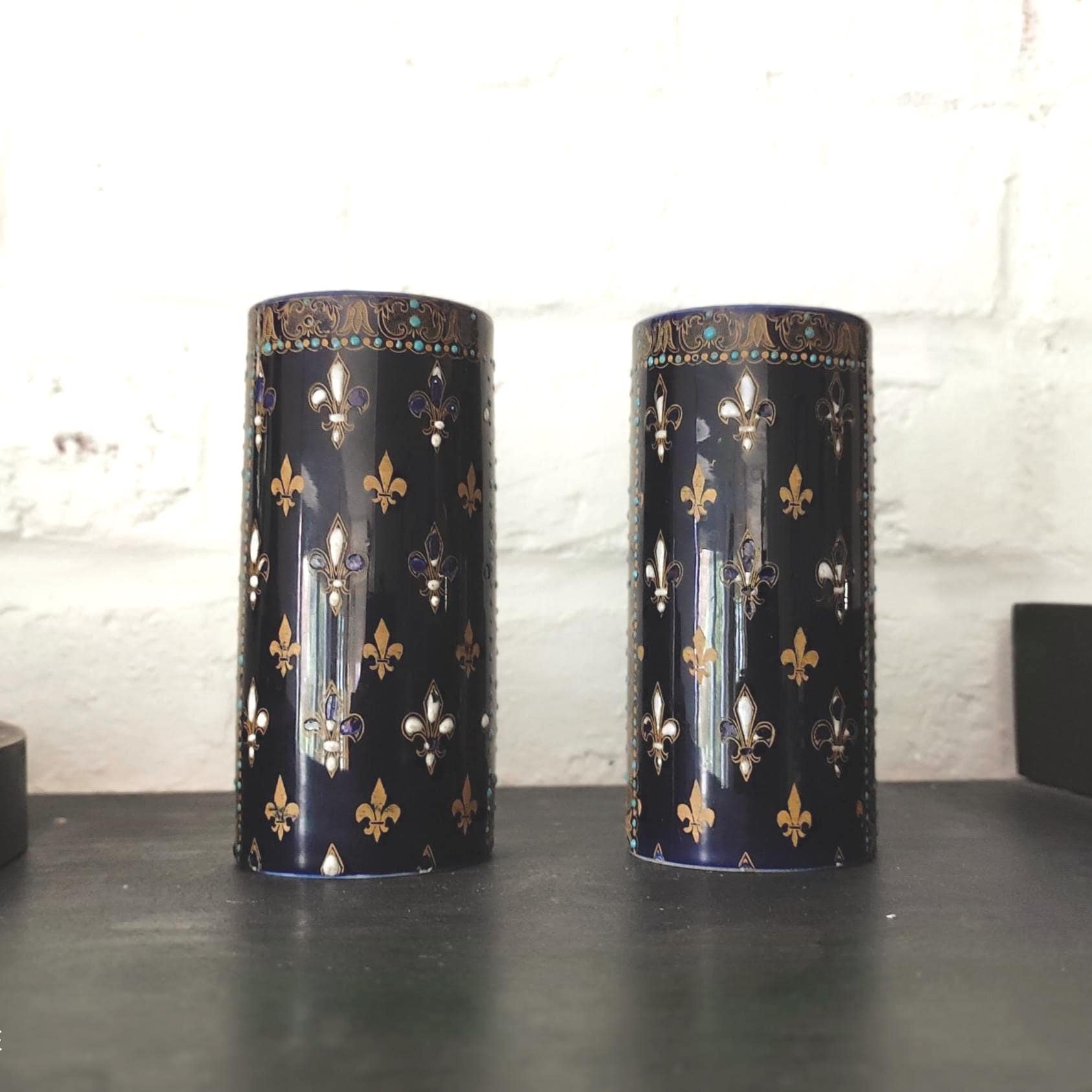 The antique vases are in good condition with some enamel loss on the decoration and one vase has a chip on the neck. They are stamped underneath. Visible in the photos, the price reflects this even though it is a collectible pair.