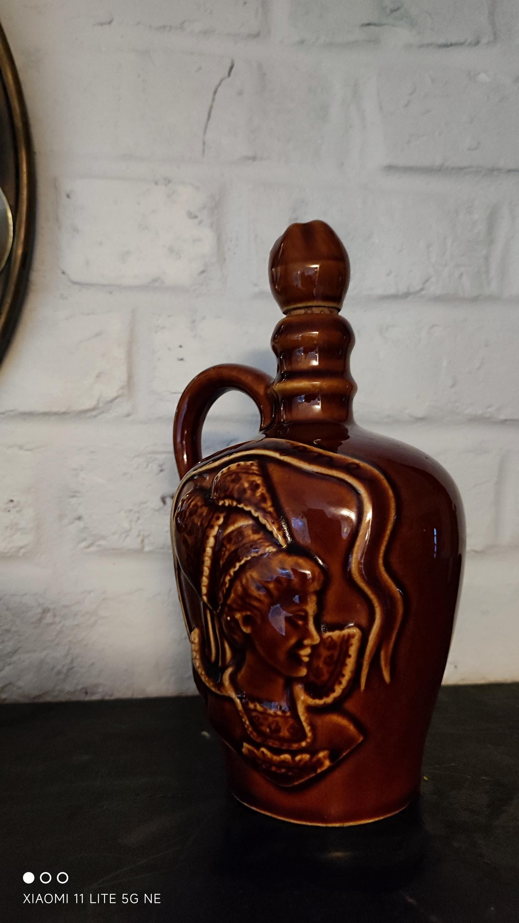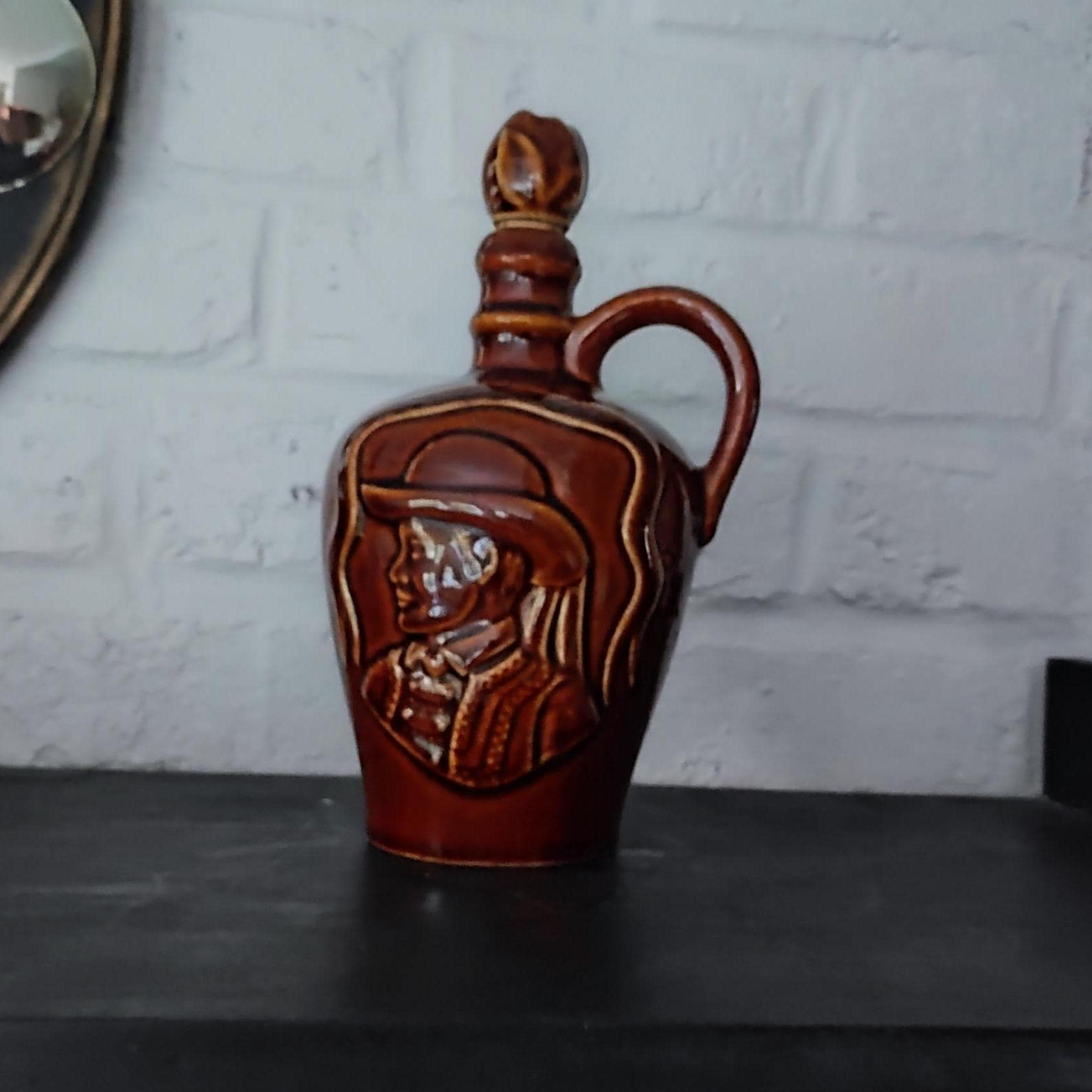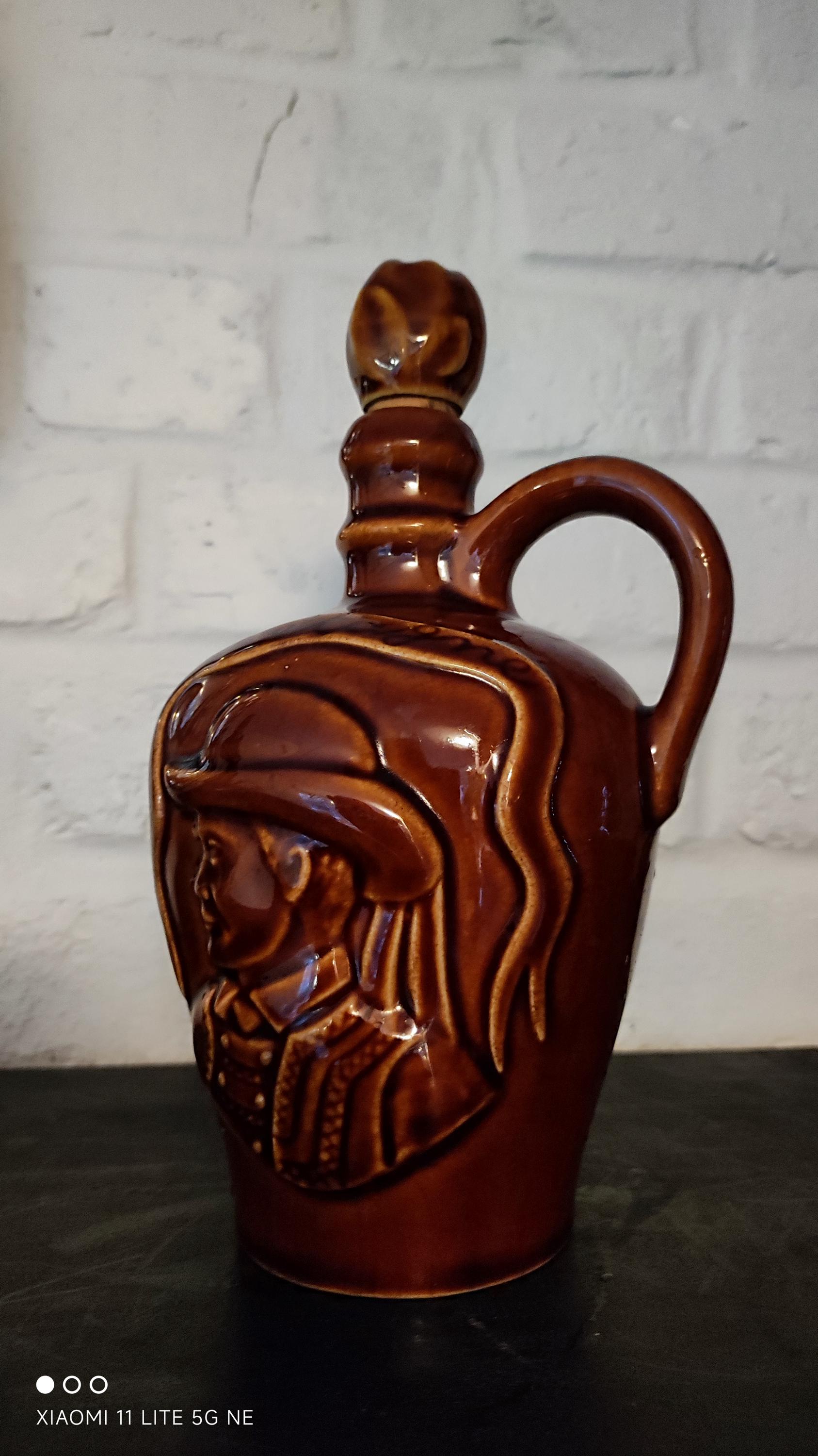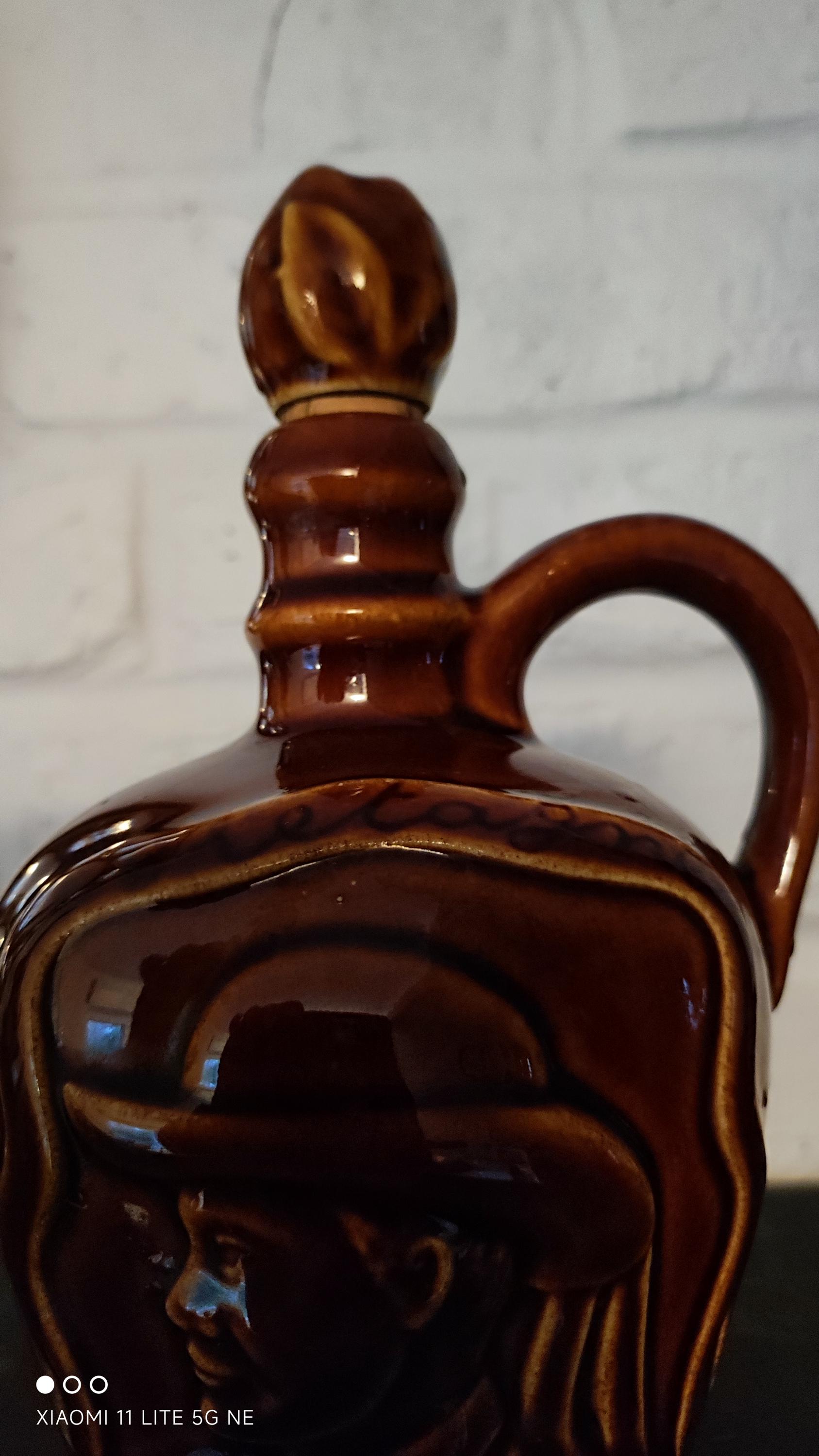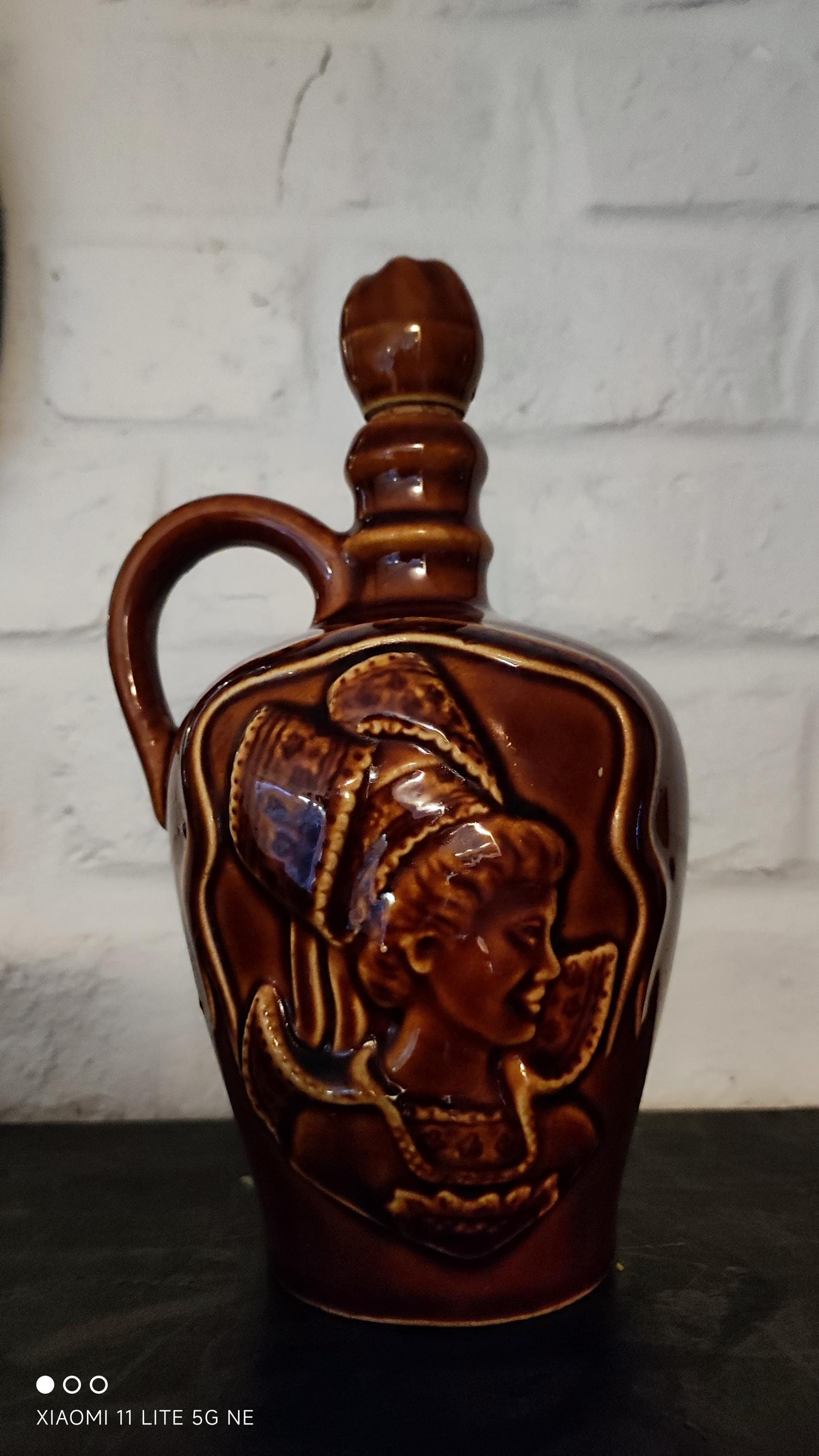 Traditionnelle bouteille de calvados de Normandie en céramique vernissée avec son bouchon représentant une pomme