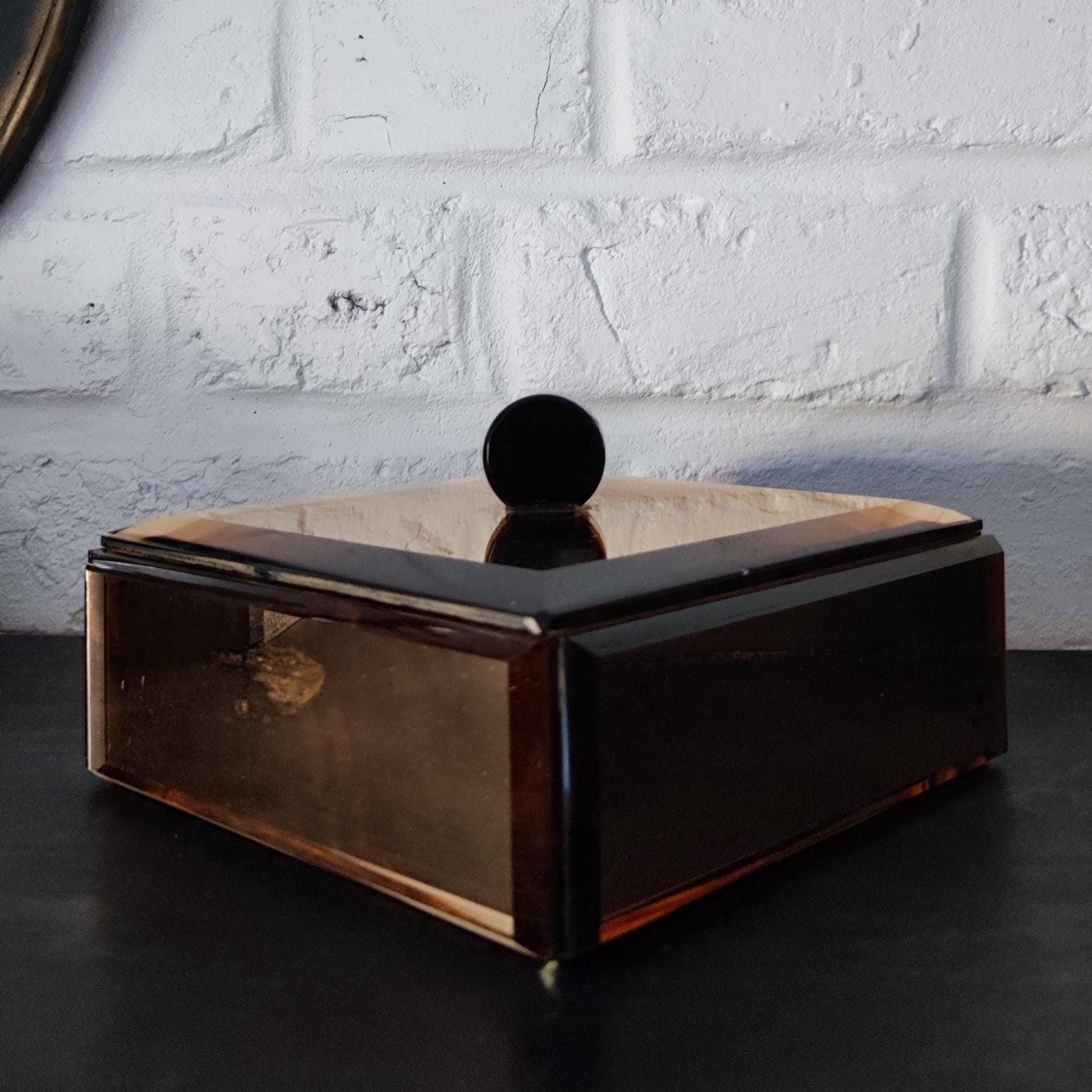 Here is a lovely pinkish peach mirrored glass box in a square shape, all beveled, with its lid and its black glass button placed like a jewel in the pure Art Deco style of the 1930s!