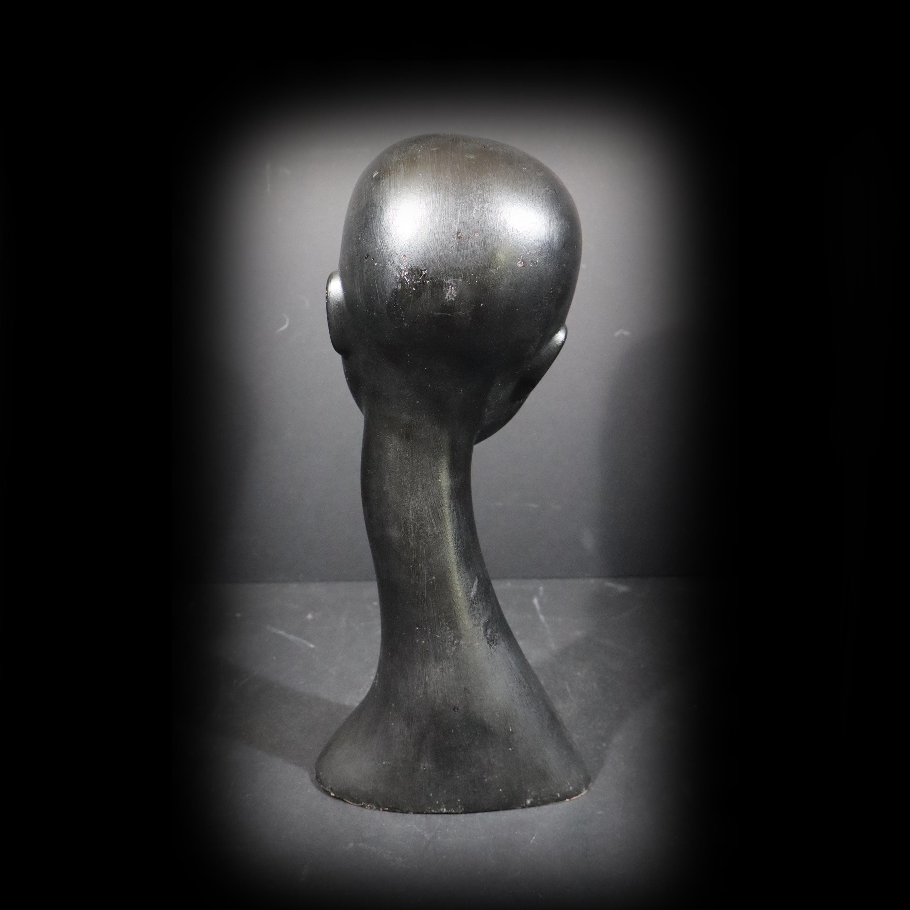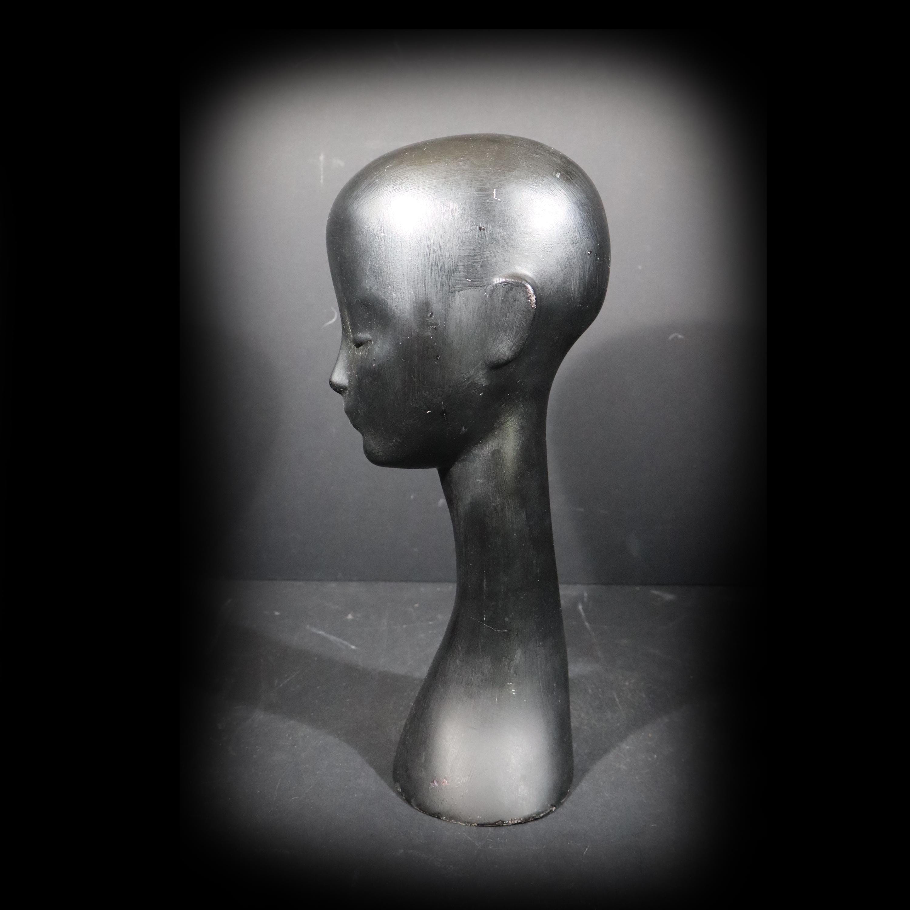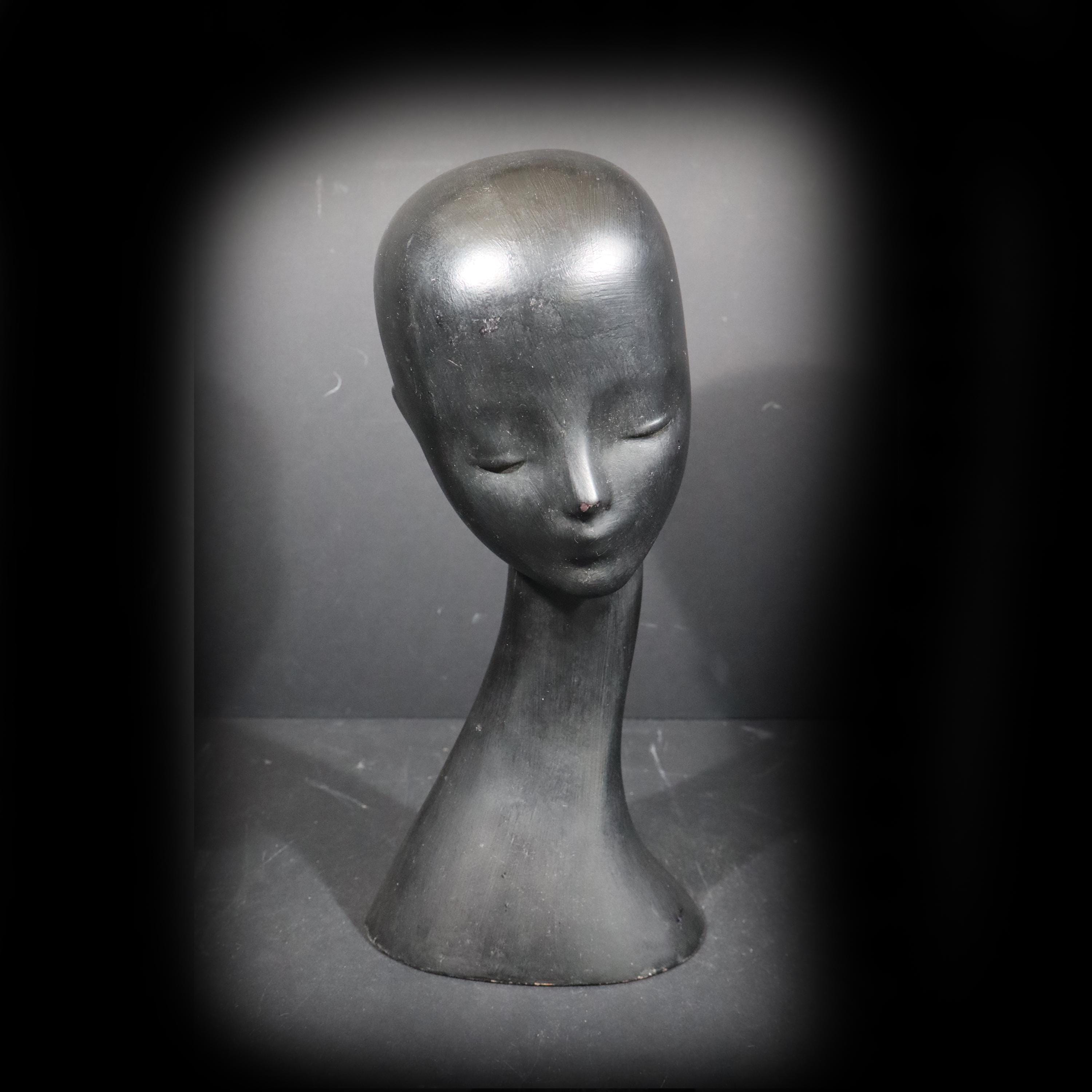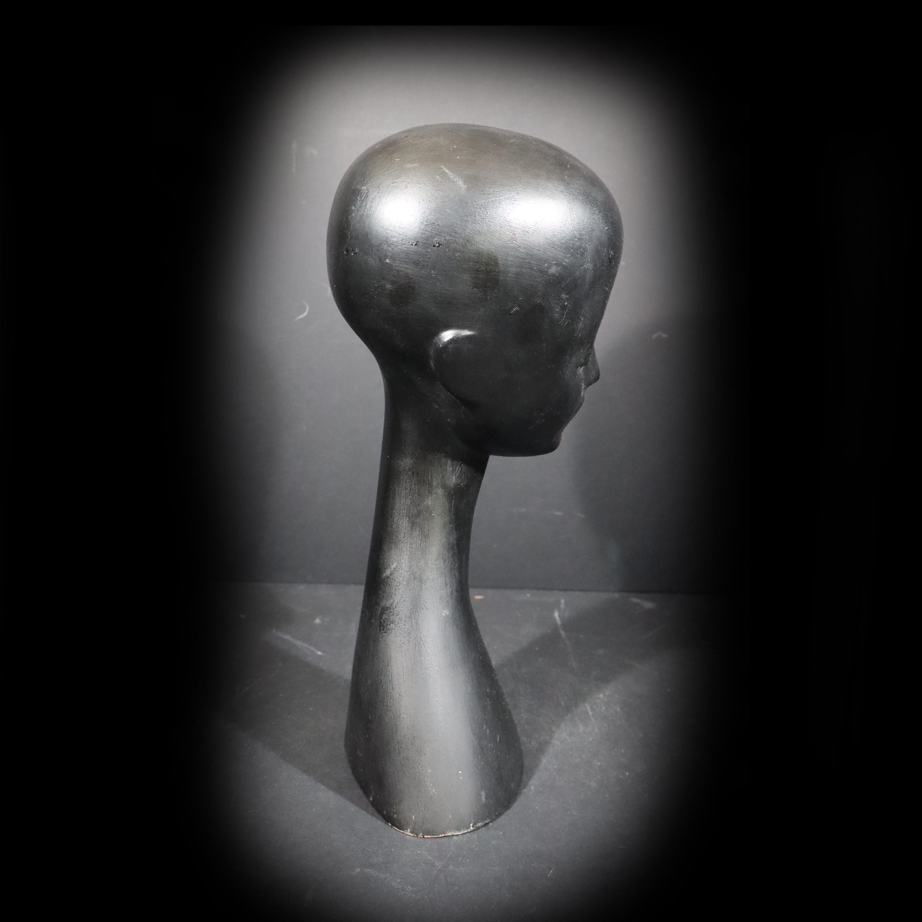 Voici une ravissante tête de mannequin pour présenter les chapeaux dans les vitrines de modistes ou boutiques de chapelleries. Fabriqué en résine et teinté en noir mat ce buste de mannequin au long cou a été fabriqué dans les années 1950s par la société Camaflex à Paris. Pour les amoureux de mode et de décoration rétro ce buste est un must-have!