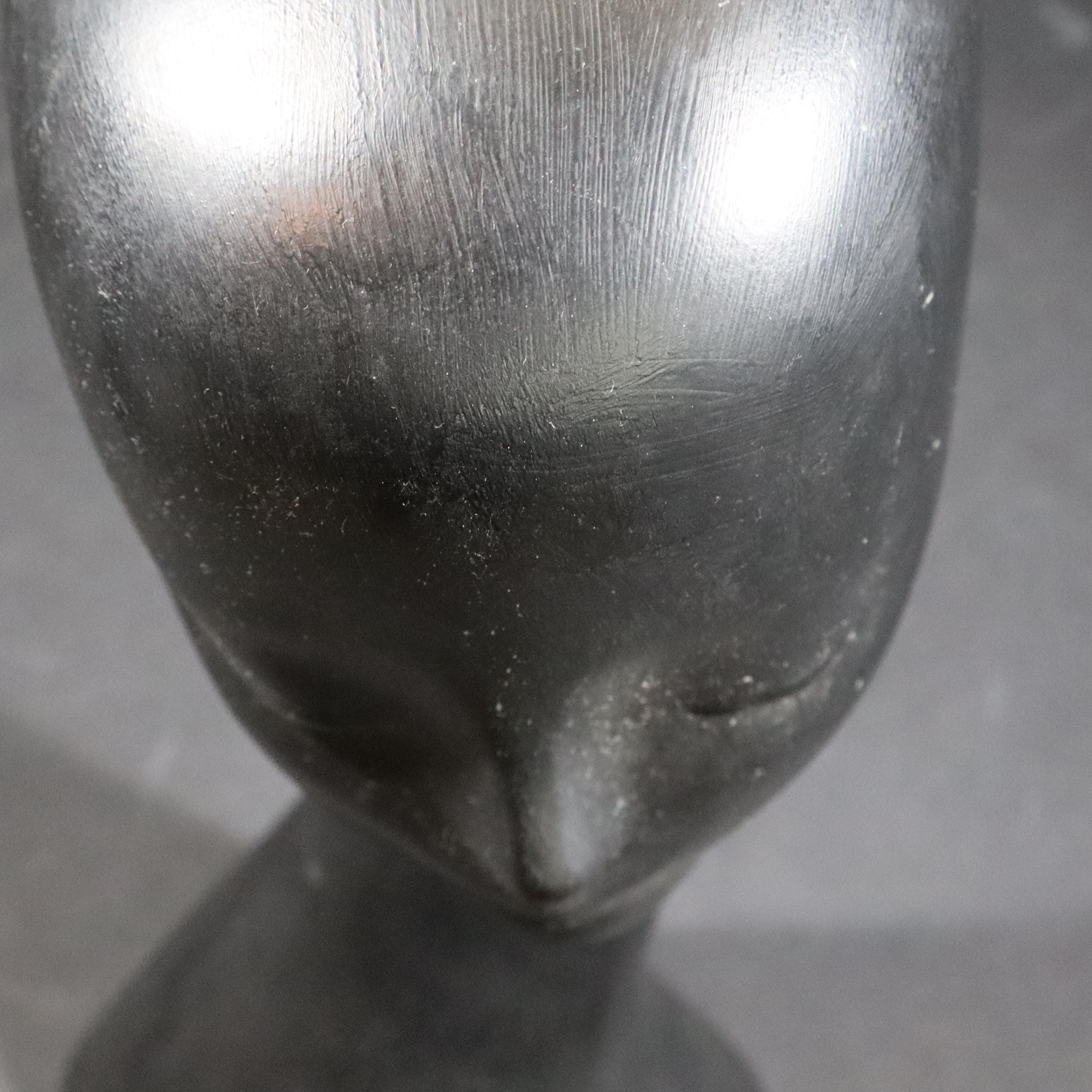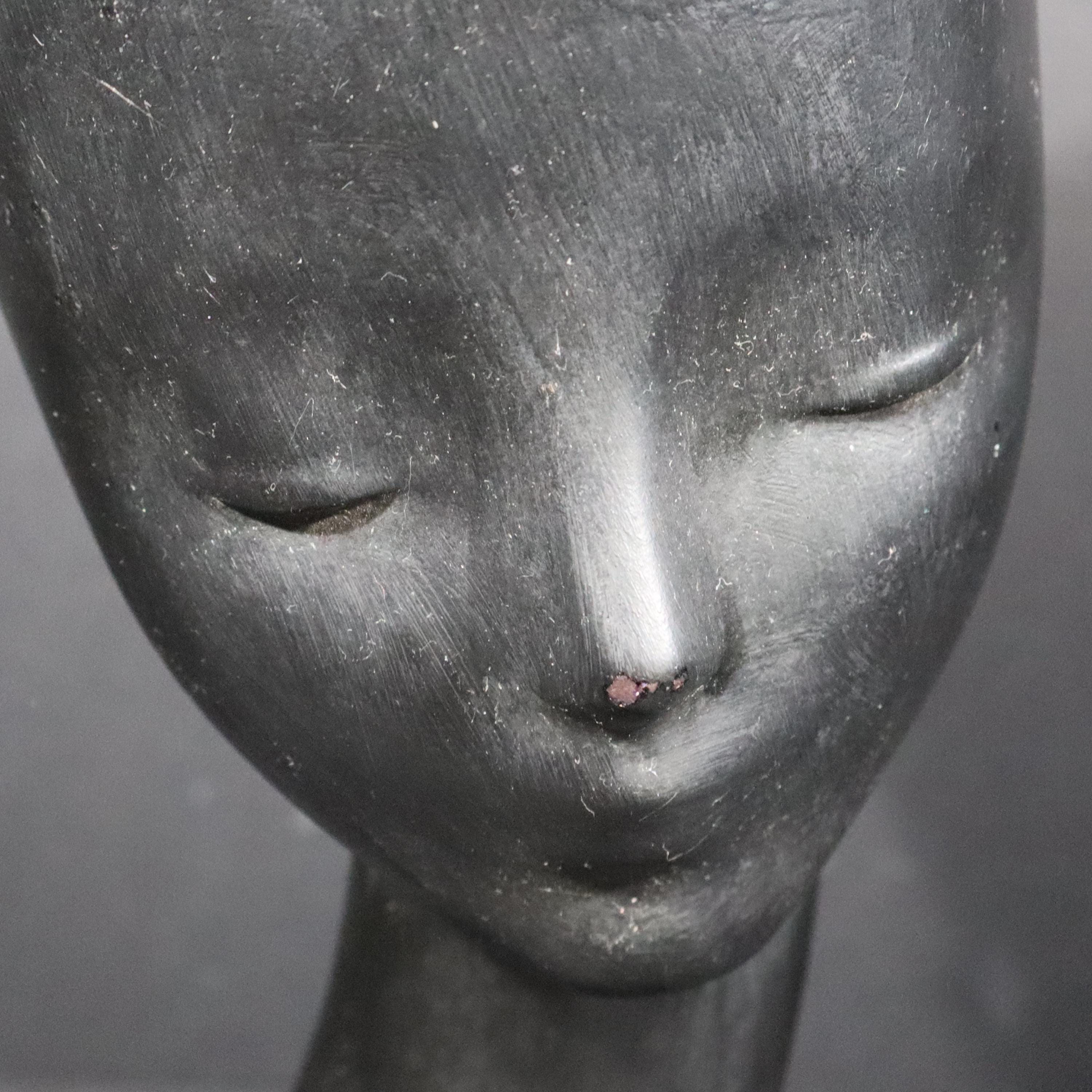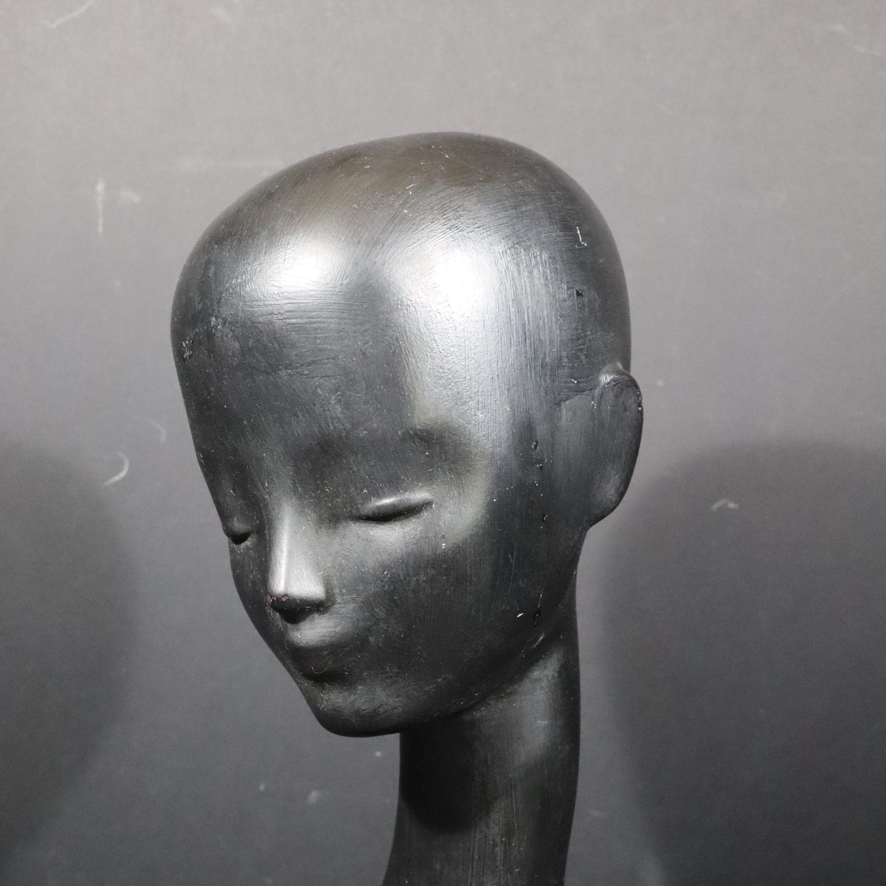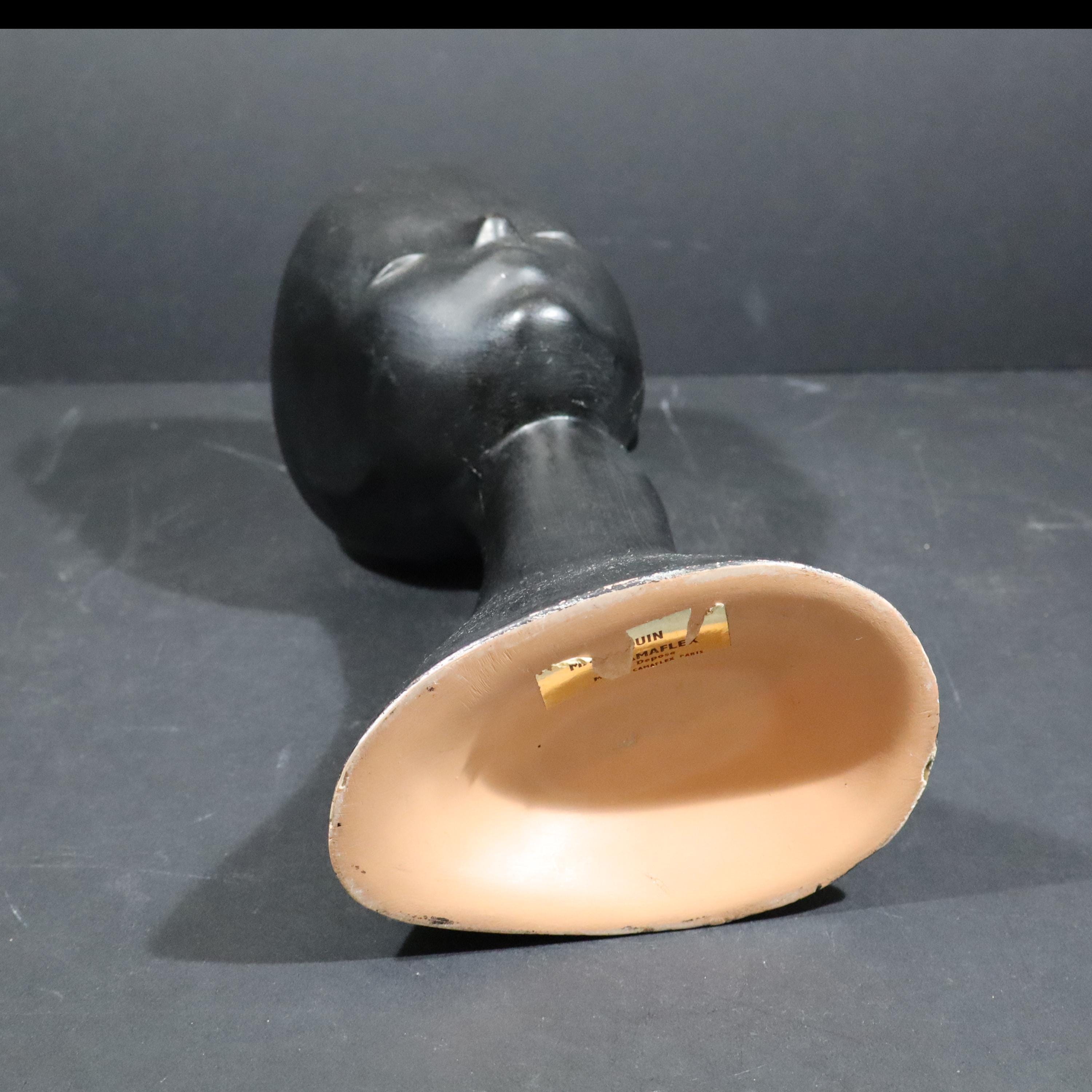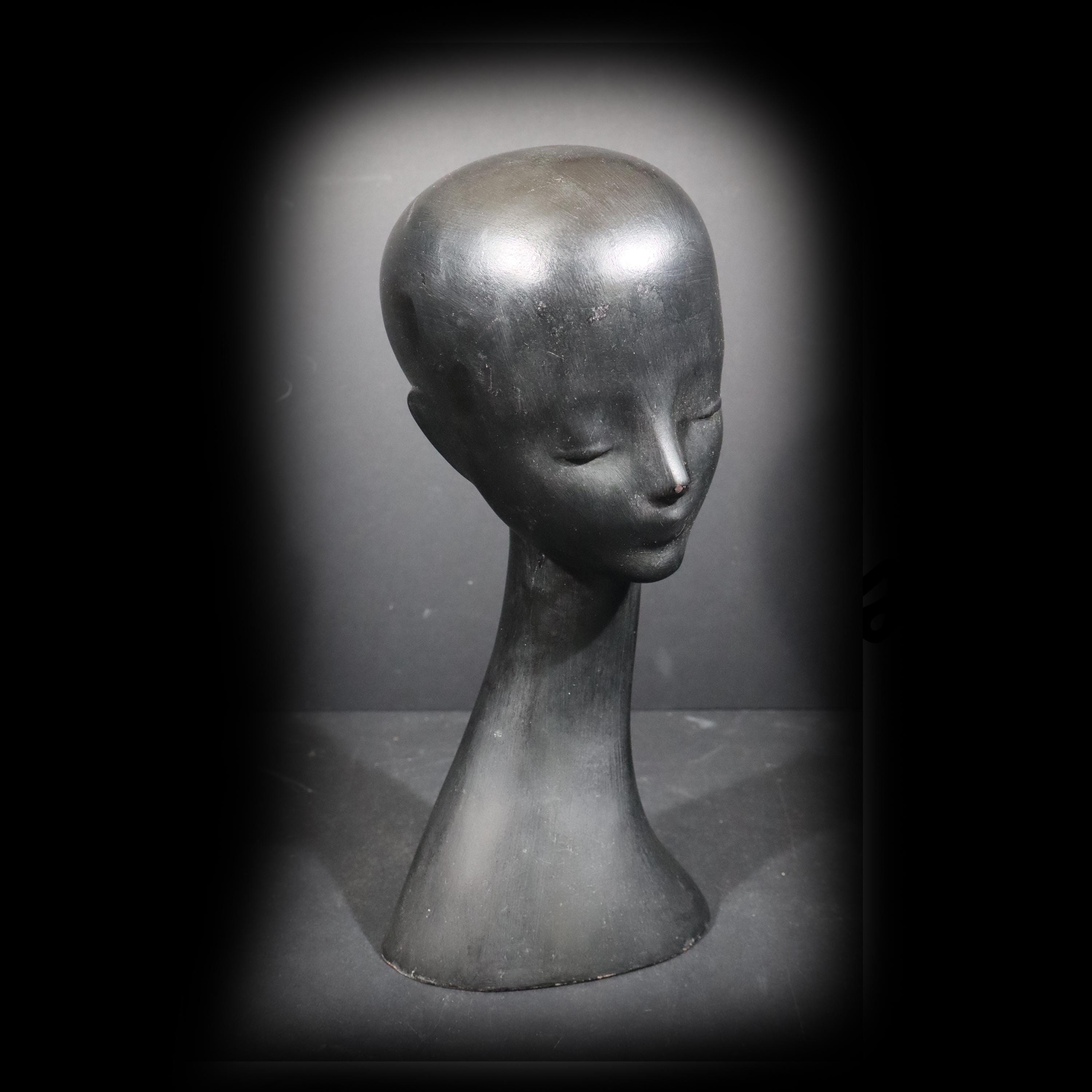 Voici une ravissante tête de mannequin pour présenter les chapeaux dans les vitrines de modistes ou boutiques de chapelleries. Fabriqué en résine et teinté en noir mat ce buste de mannequin au long cou a été fabriqué dans les années 1950s par la société Camaflex à Paris. Pour les amoureux de mode et de décoration rétro ce buste est un must-have!