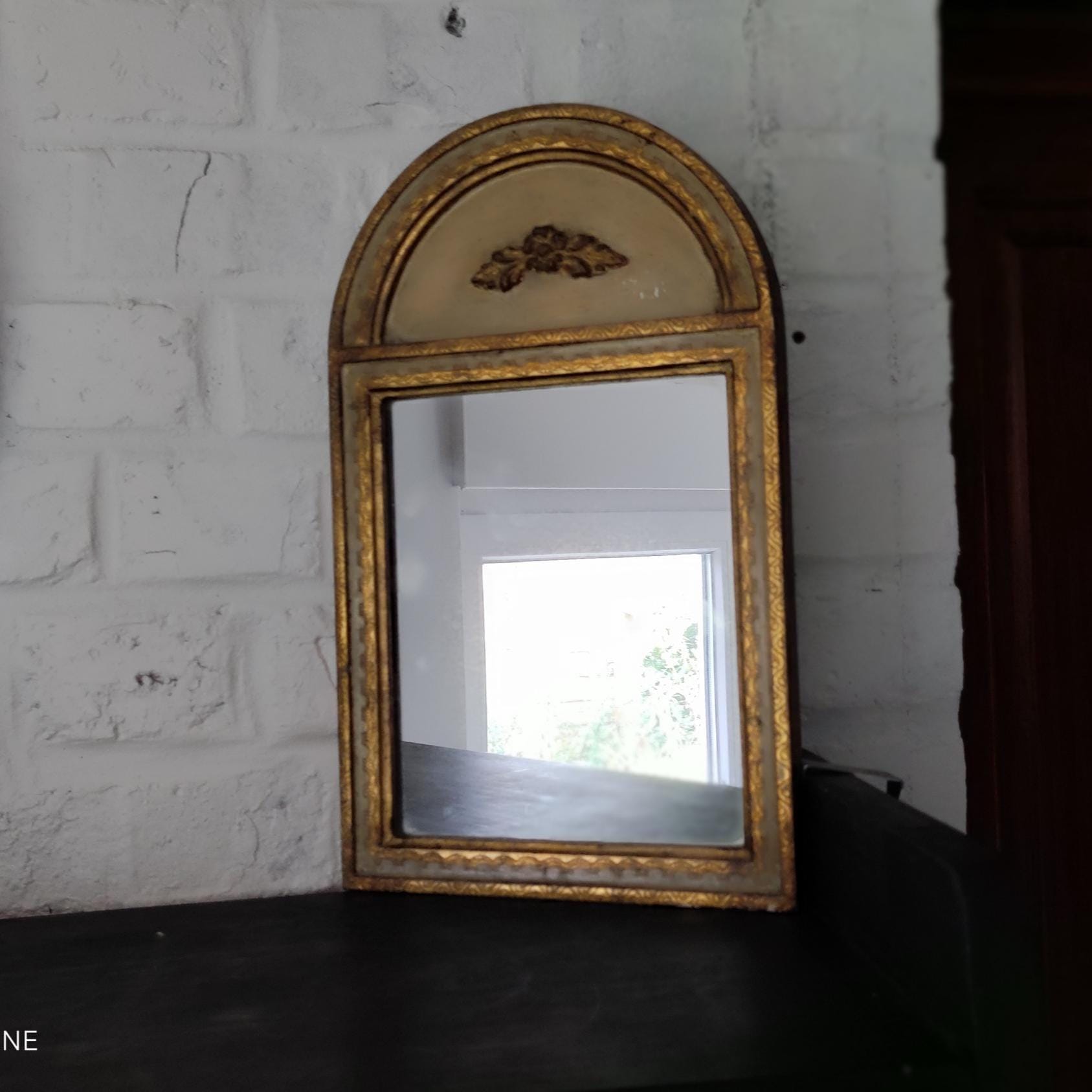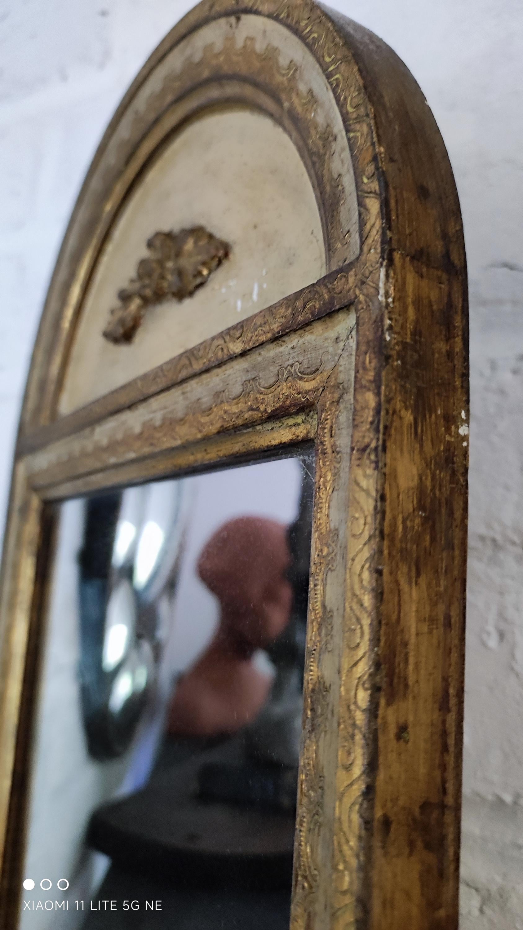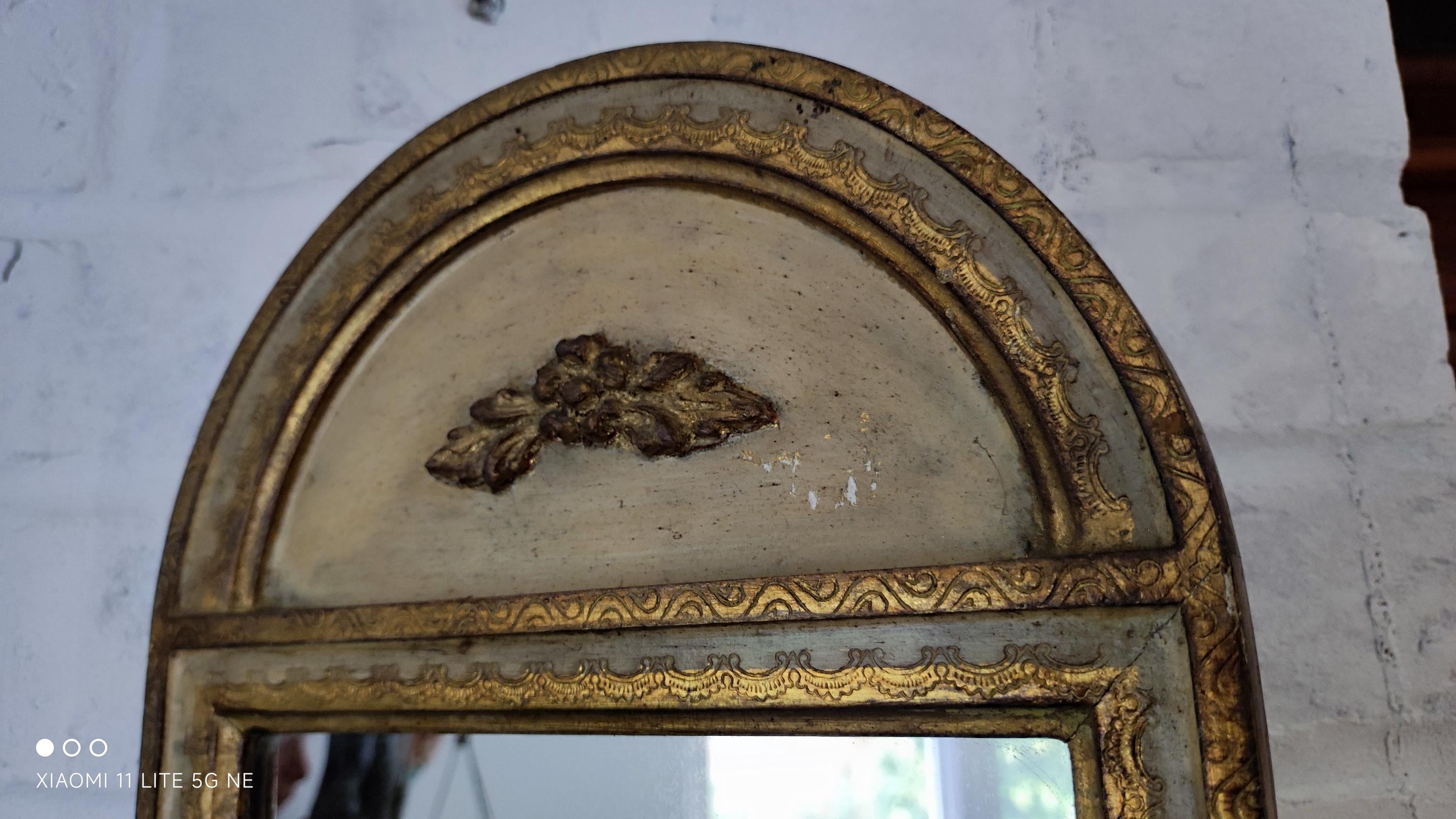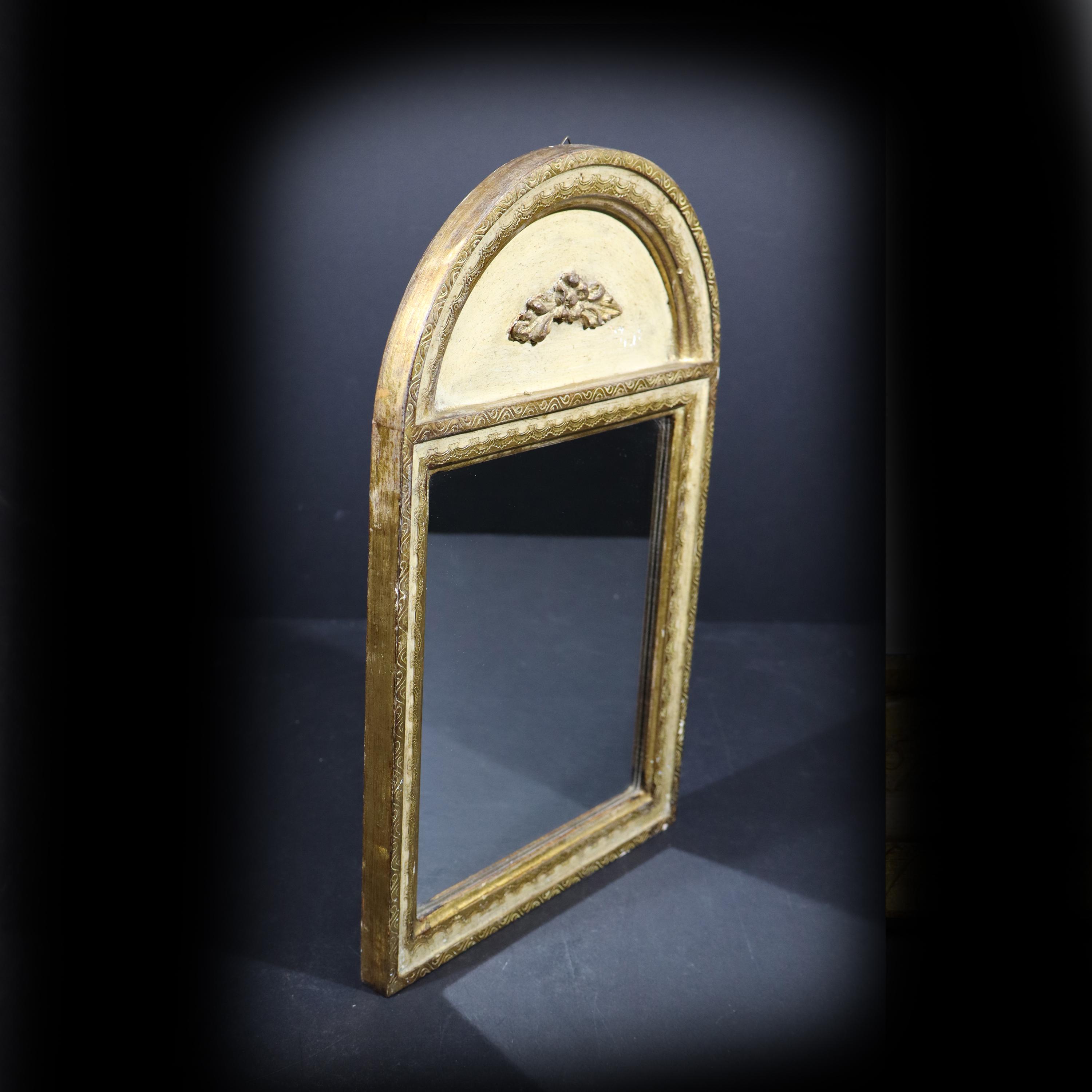 This is a delightful wall mirror reminiscent of a trumeau with its rounded wooden frame and rectangular mirror. In the Florentine and Louis XVI style, it is stunning with its richly gilded decoration on a cream patina and a raised floral inlay. This is a wall decoration that will bring elegance to your interior.