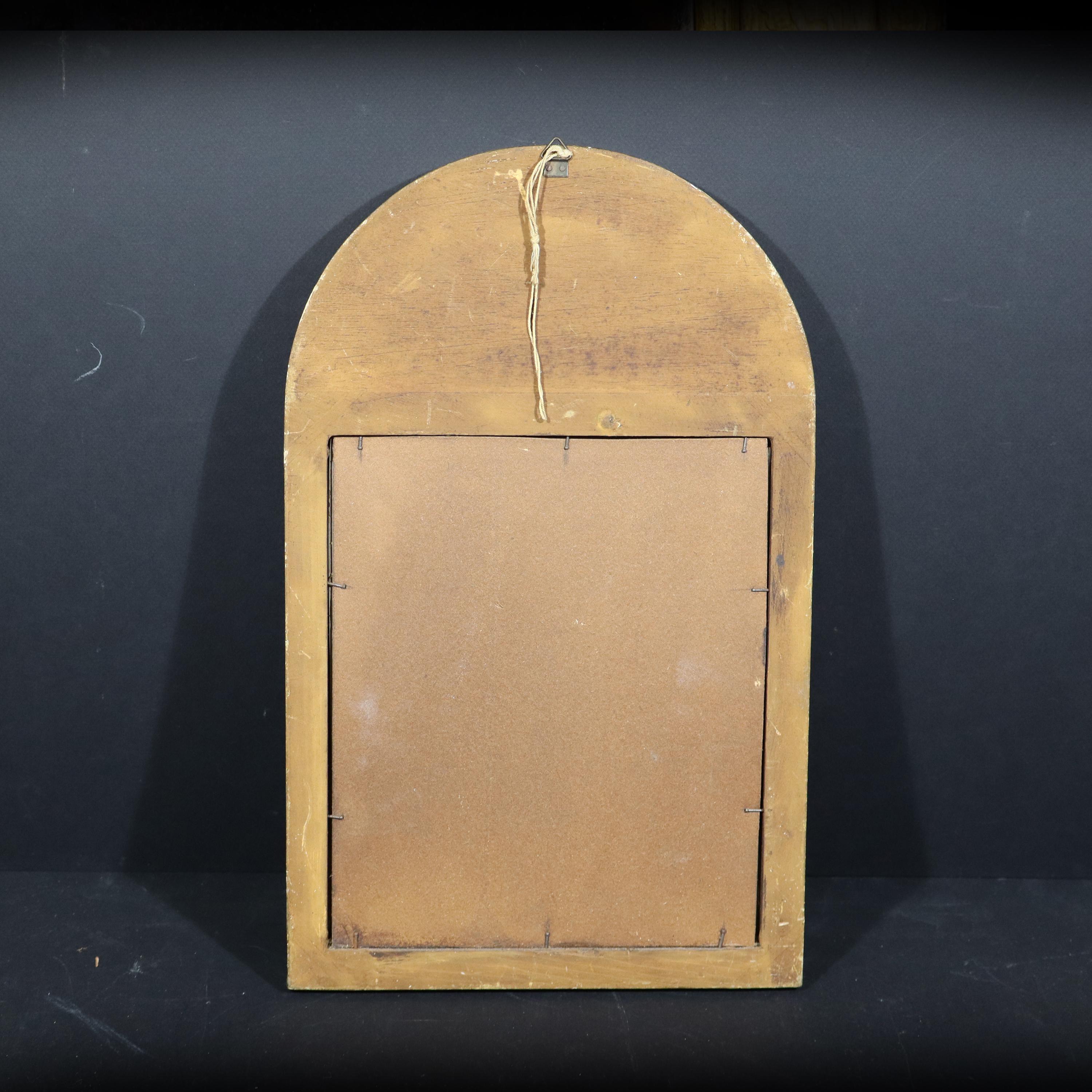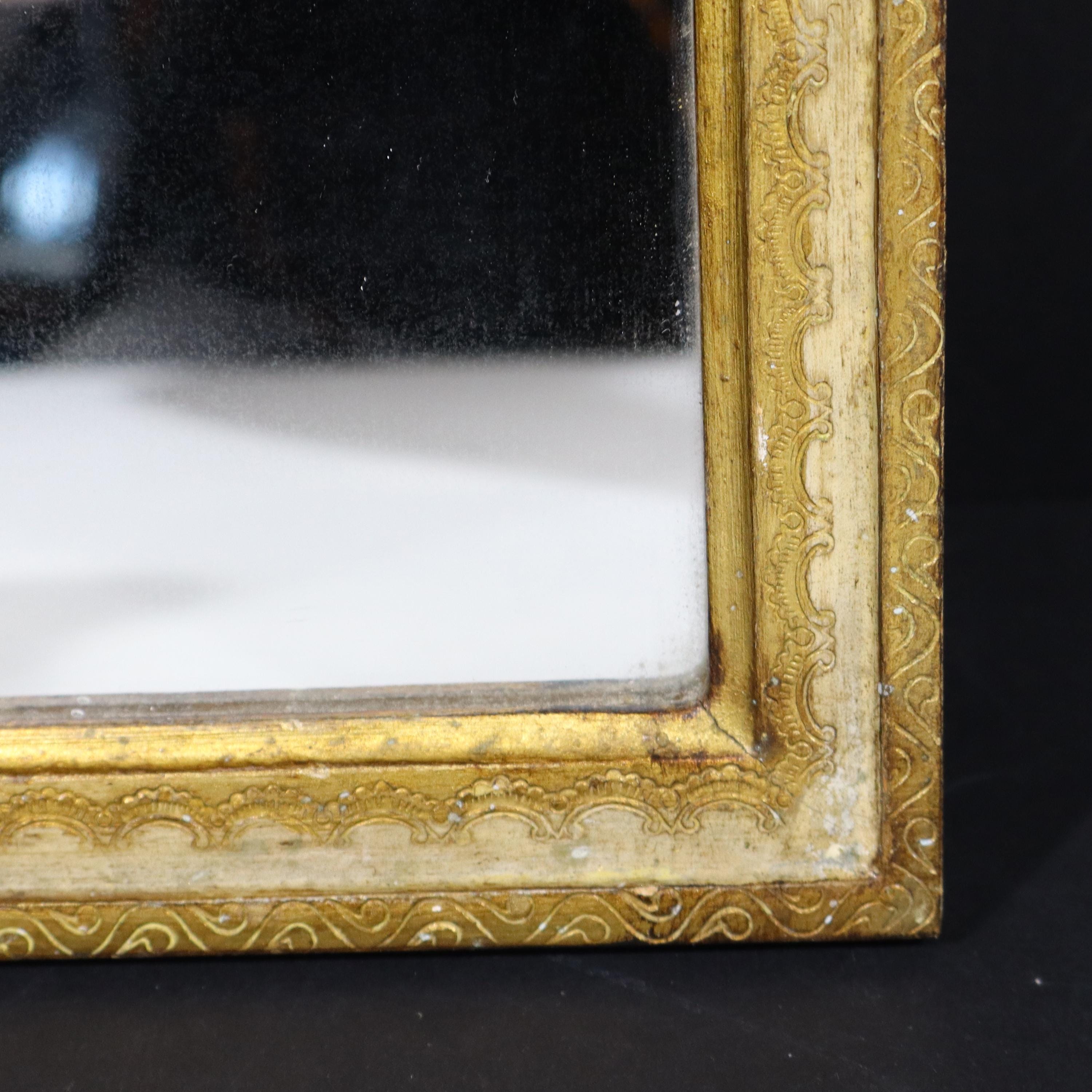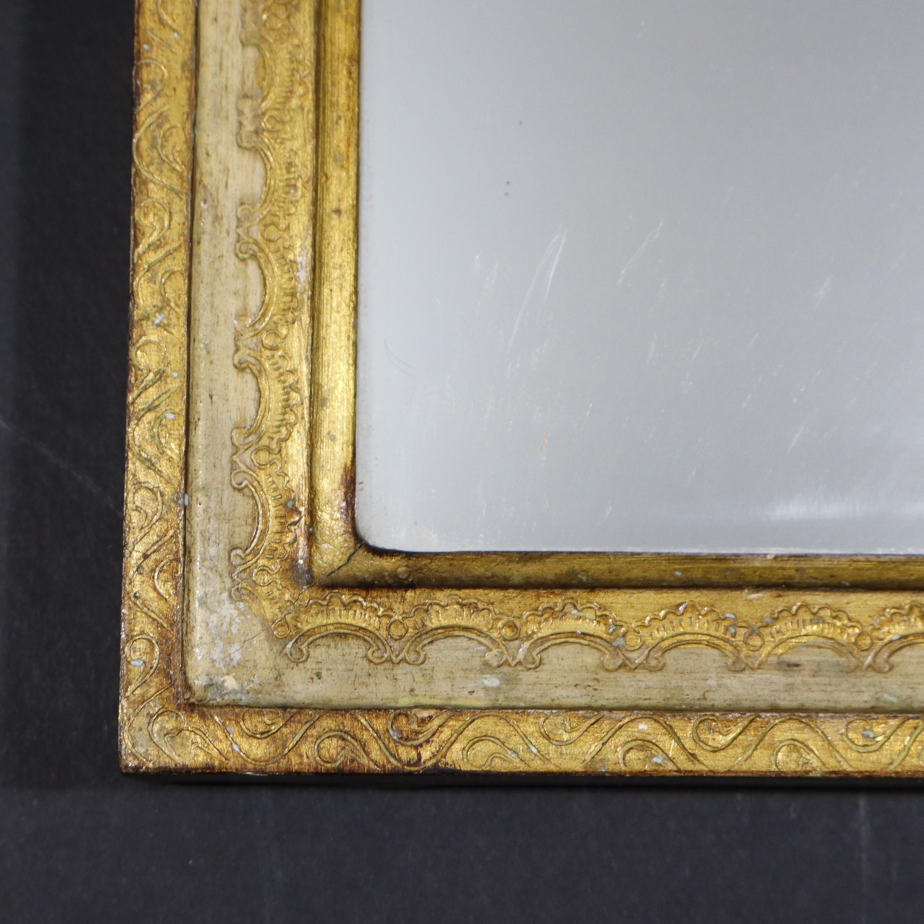 The antique wall mirror is in good condition with some signs of wear and small chips on the frame and the mirror. It comes with a hook for easy hanging.