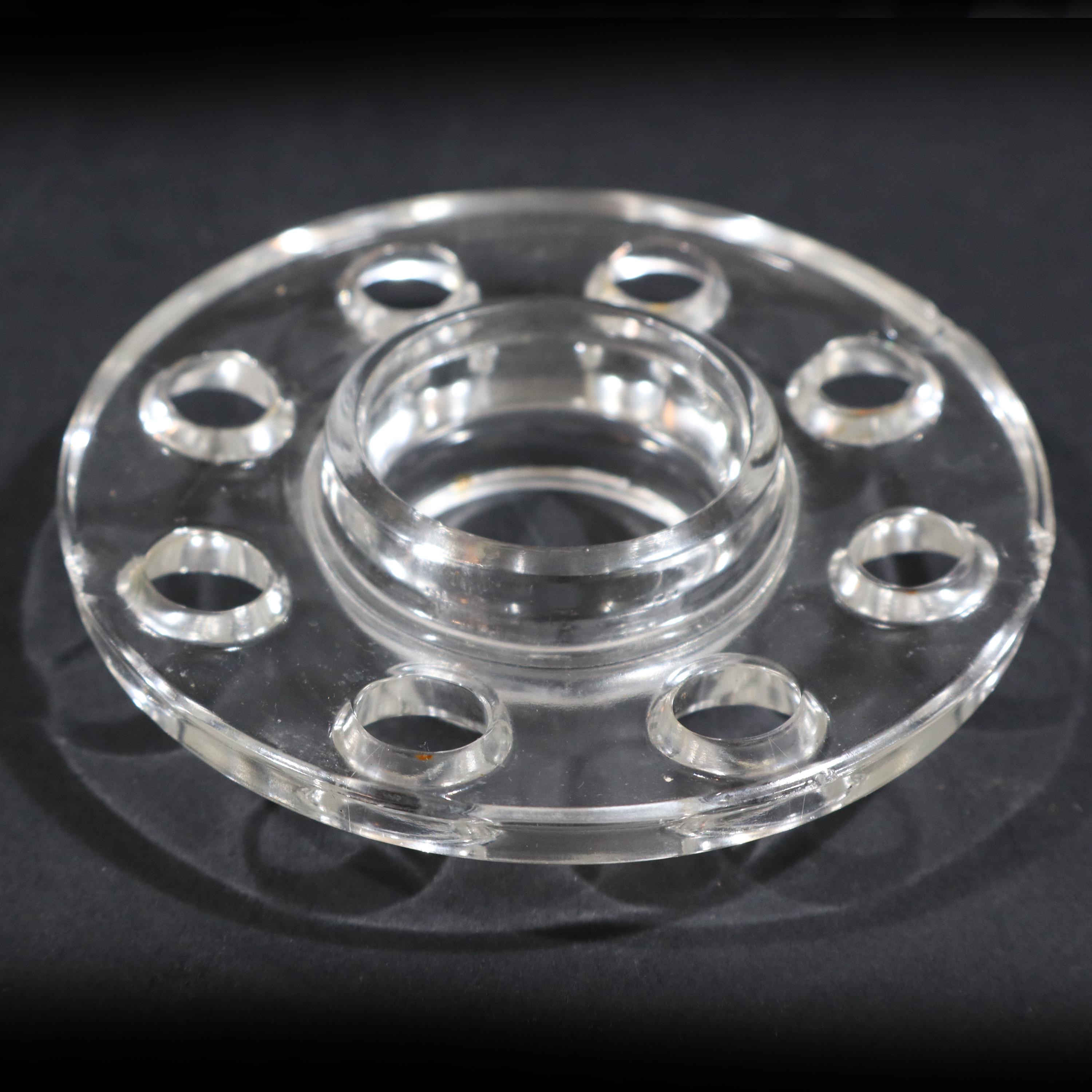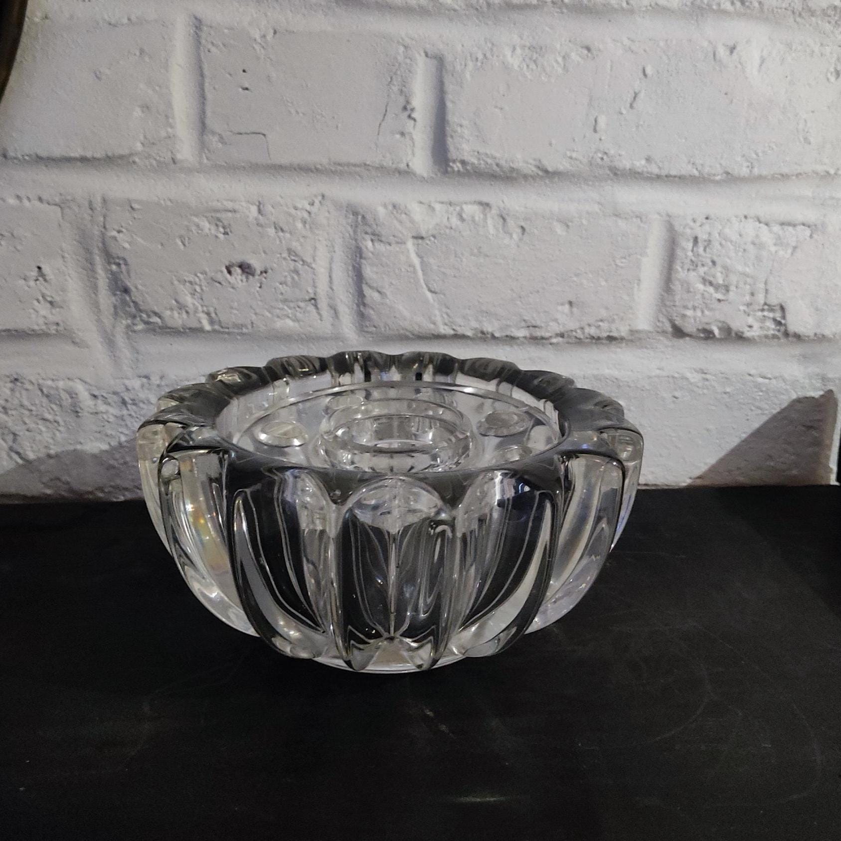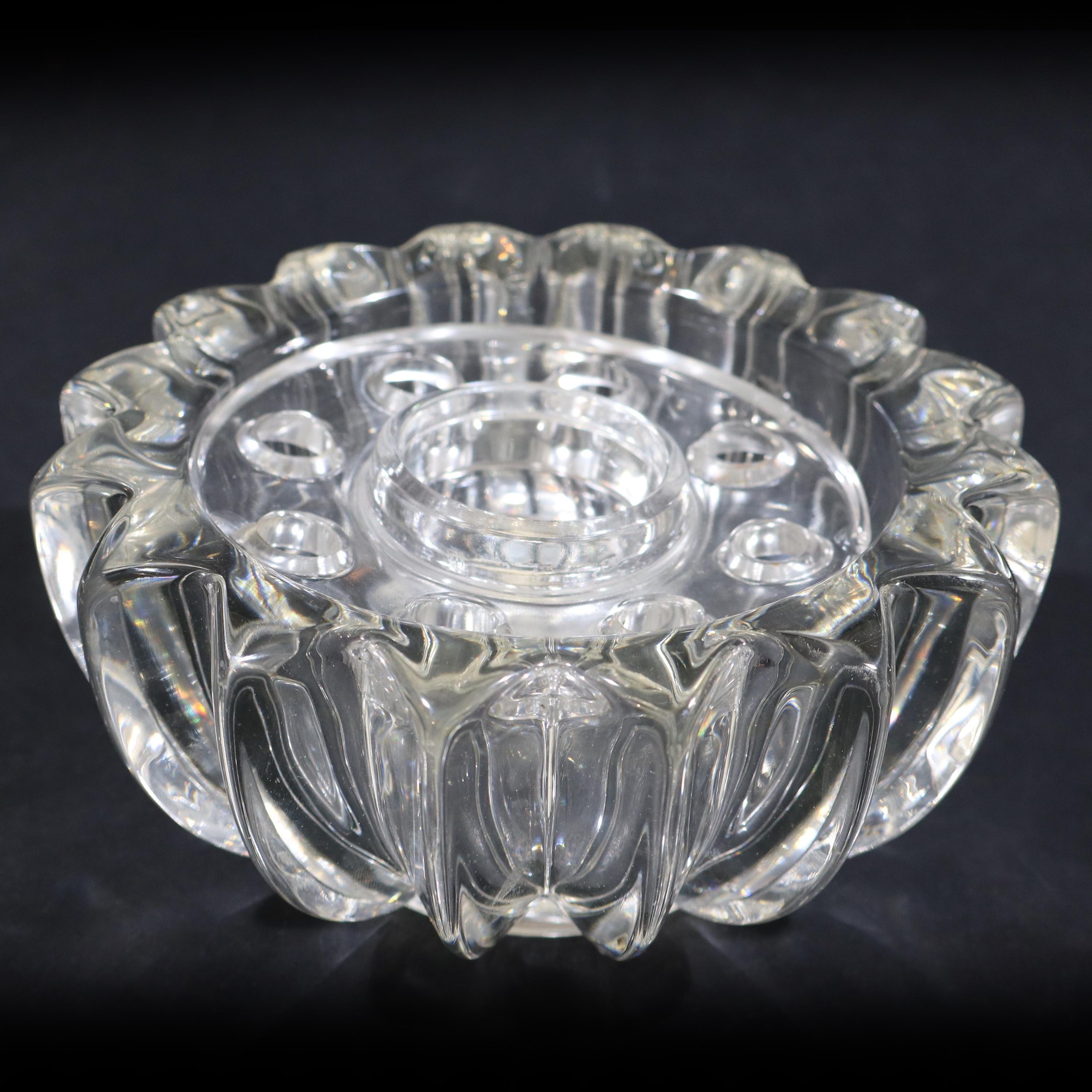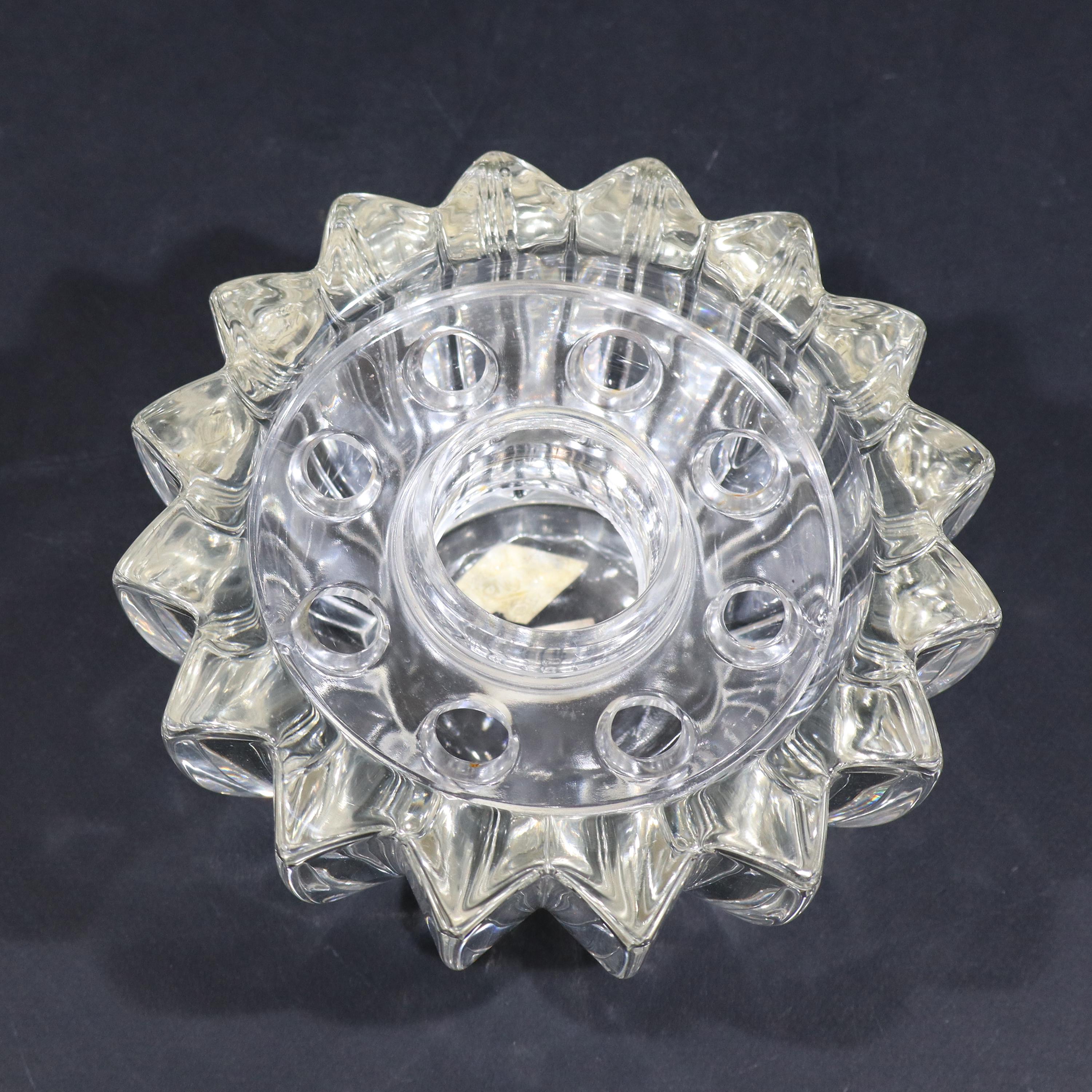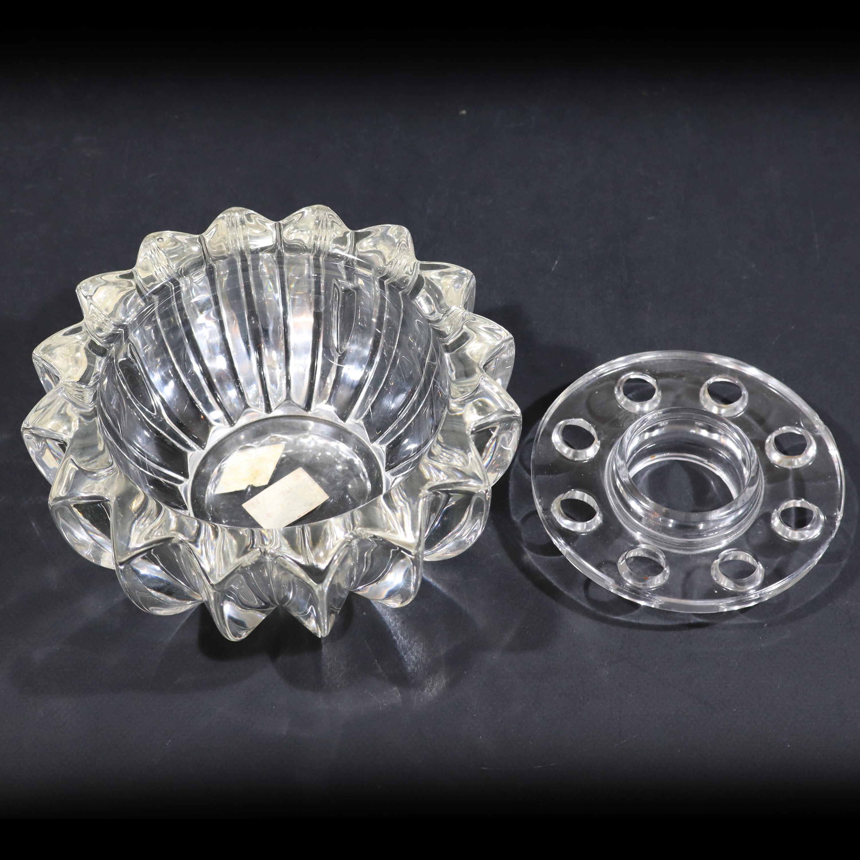 est un grand bol en cristal moulé avec un élément en verre perforé qui se pose pour y piquer vos fleurs dans les 8 trous et un grand au centre. Pour réaliser vos compositions florales avec des fleurs fraîches ou séchées ce vase sera très décoratif toute l'année.
