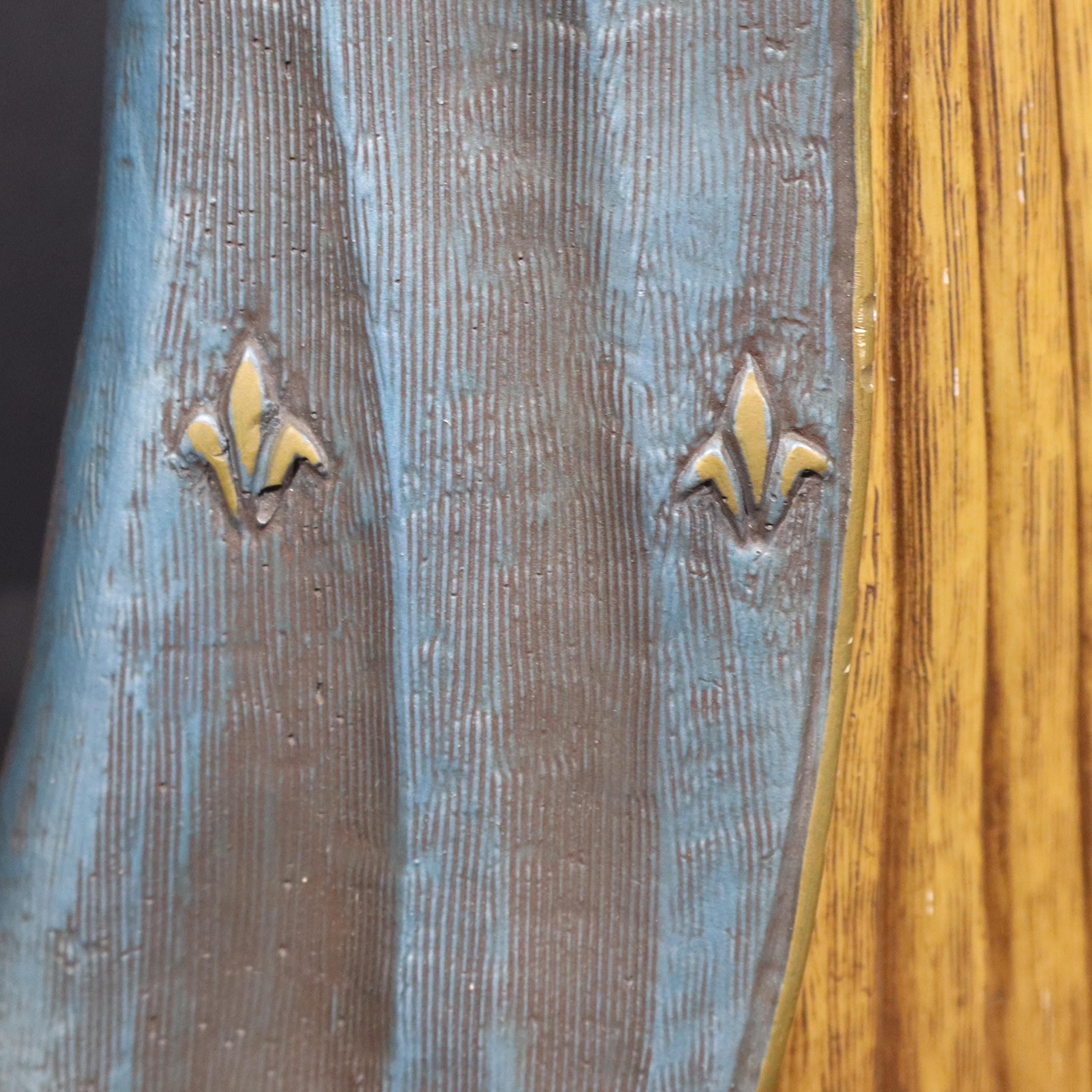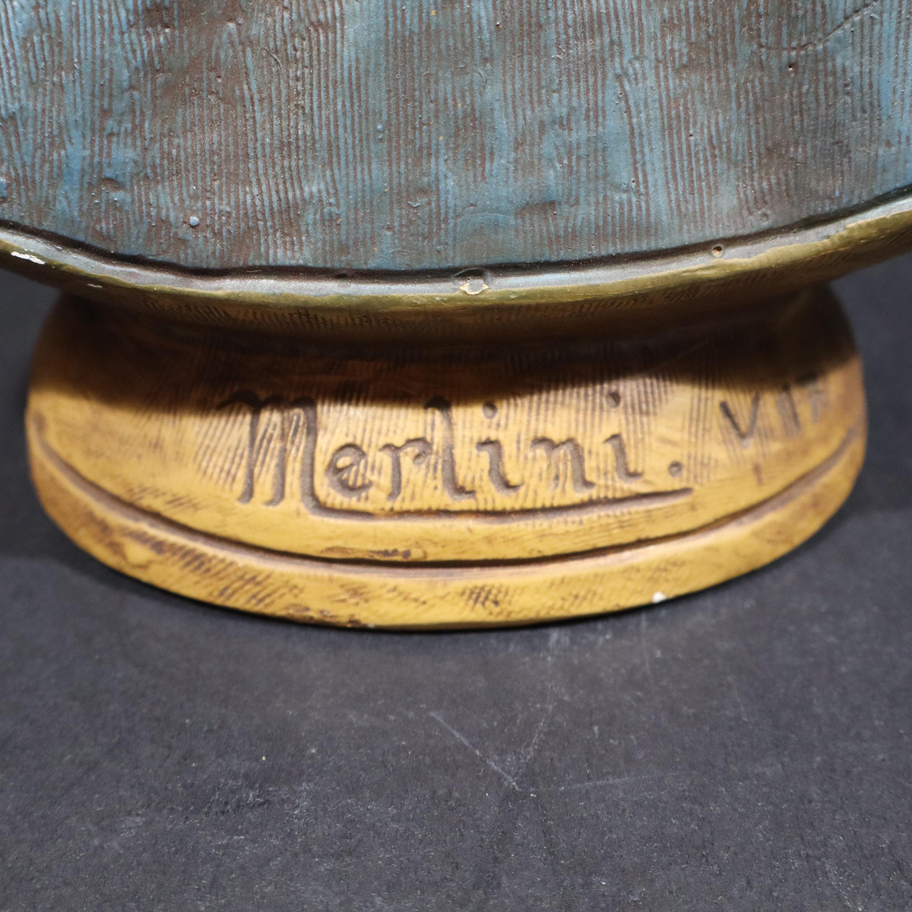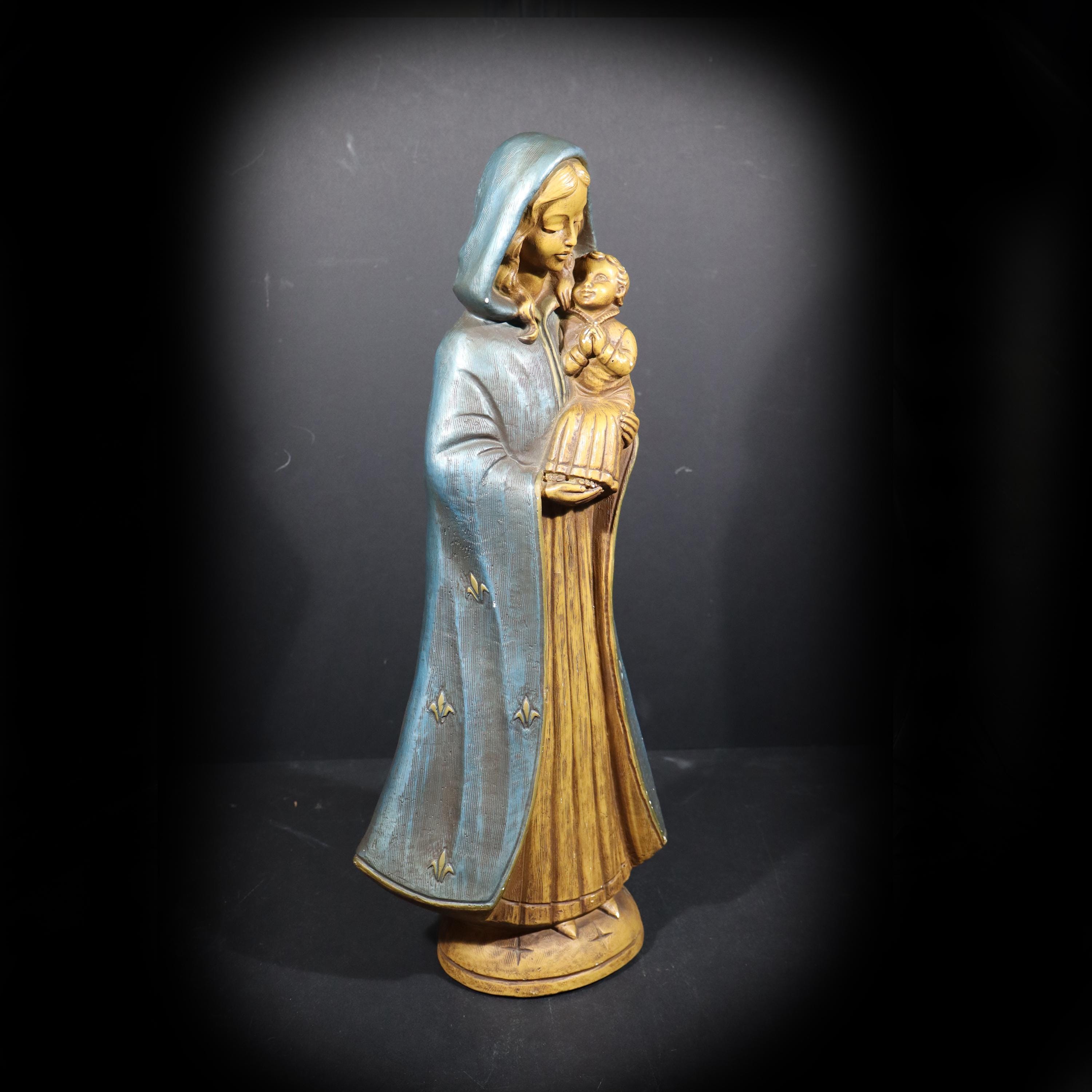 This is a lovely statue of the Virgin Mary holding the baby Jesus in her arms. The standing Madonna is dressed in a blue draped cape decorated with fleur-de-lis. This large plaster statue was made in Italy in the 1930s and 1940s and bears the Merlini signature.