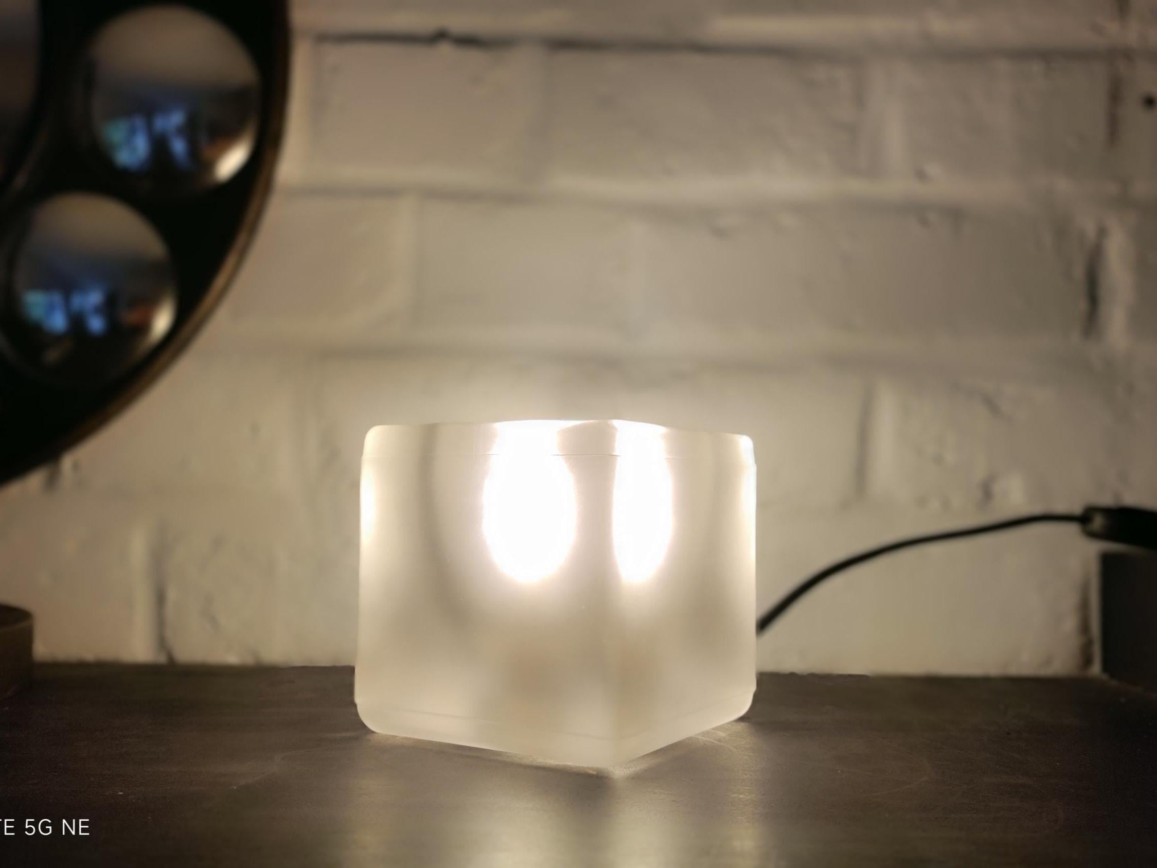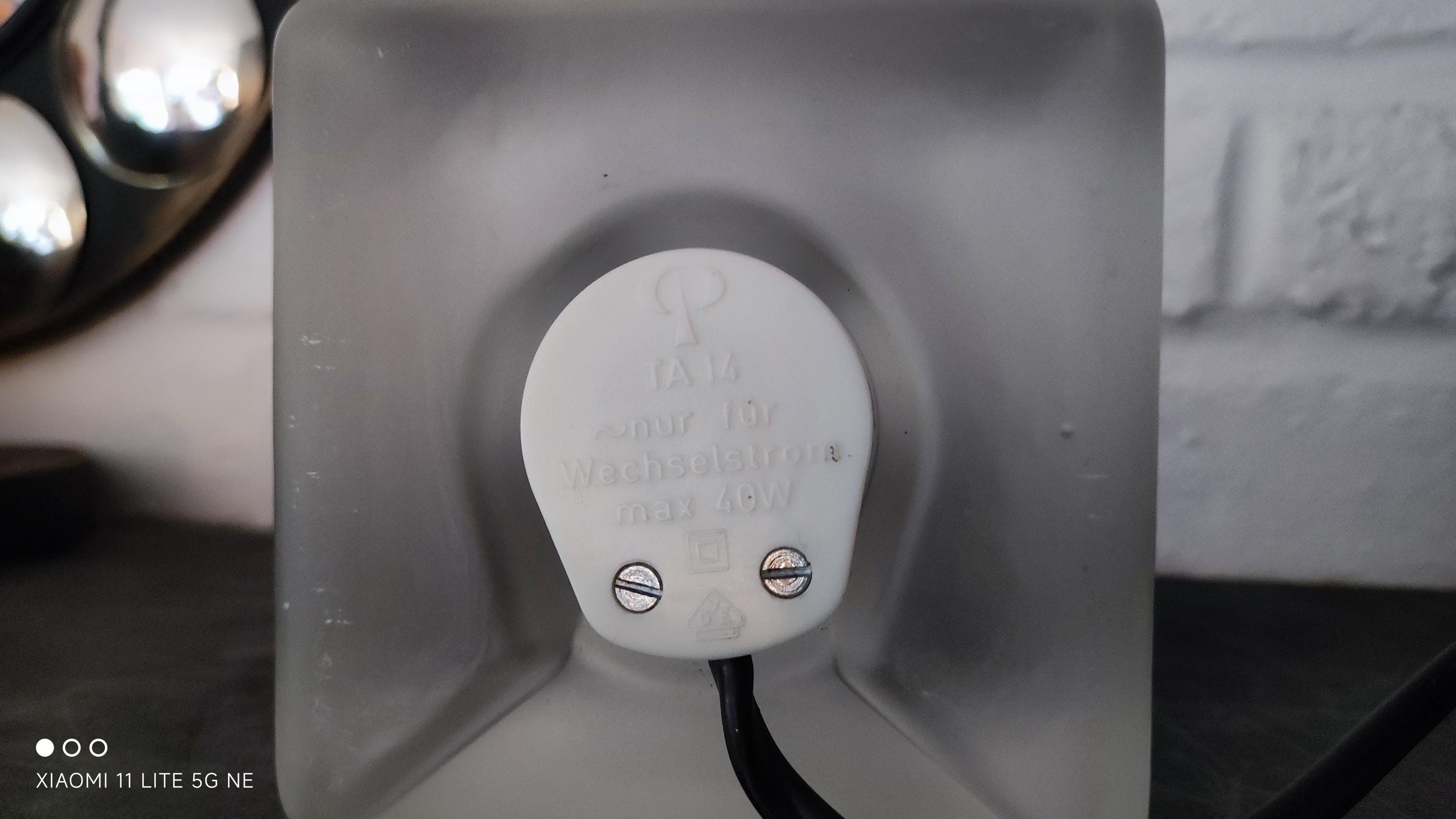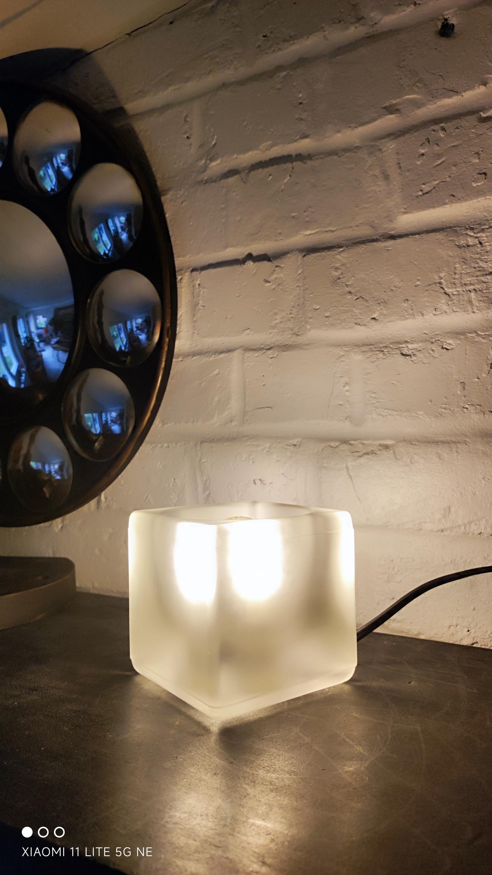 The Peill & Putzler cubic table lamp is in very good condition with slight signs of use underneath (visible in the photos). It operates on a 220/230 volt network. It bears the model number and the manufacturer's logo underneath.