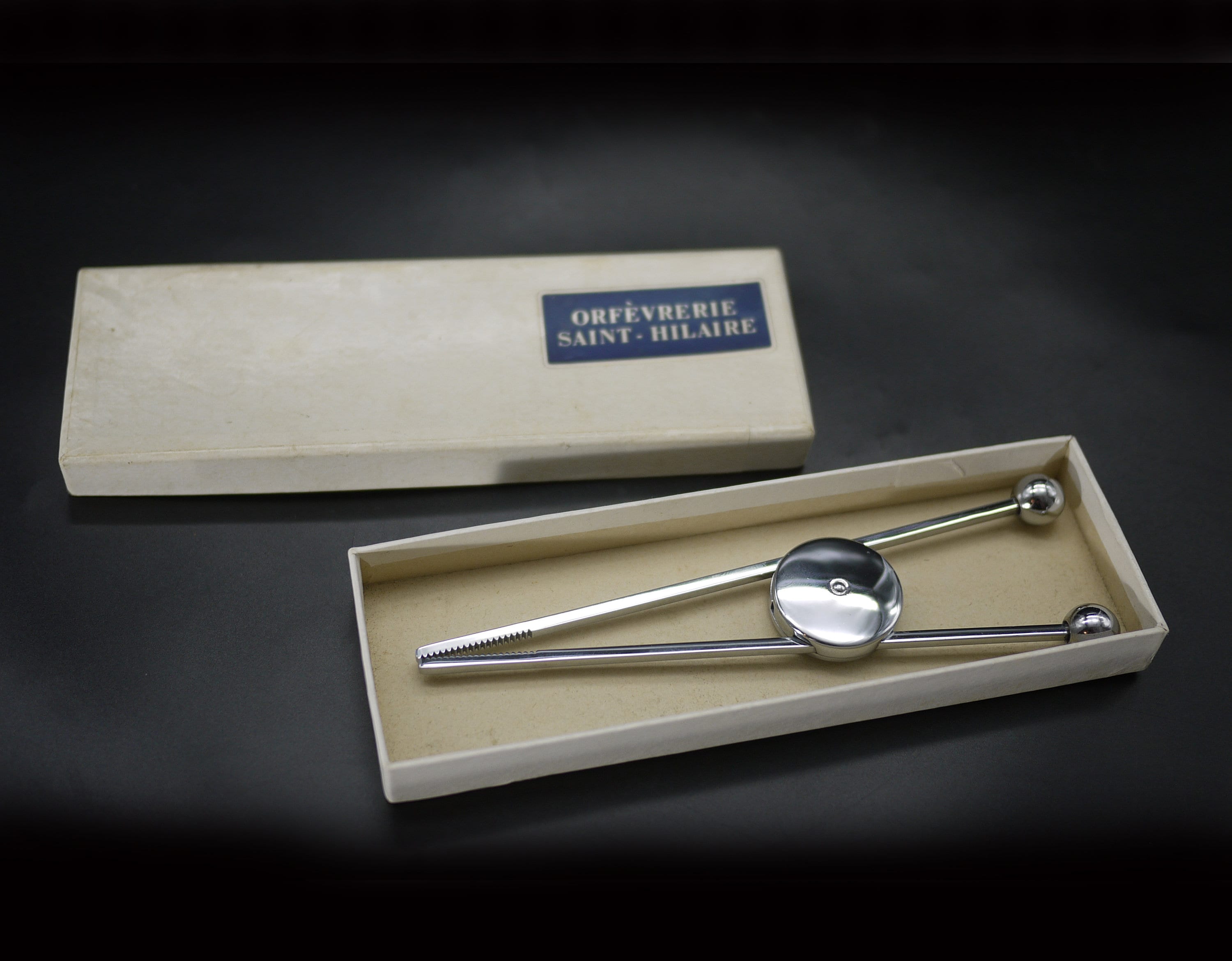 Here is one of Jacques Adnet's "Must-Haves" with this silver-plated sugar tongs made by the Goldsmith Saint Hilaire Paris in the 1950s. Jacques Adnet is a famous French architect, decorator, and designer (1900-1984) belonging to the Art Deco and Modernism movements. He brought together painters, ceramists, goldsmiths, and coppersmiths for his superb creations.