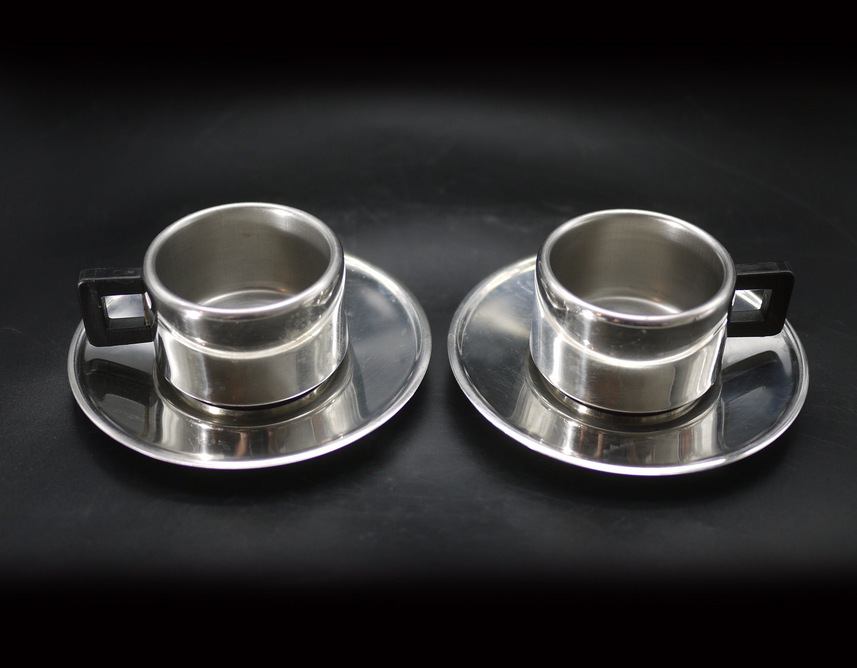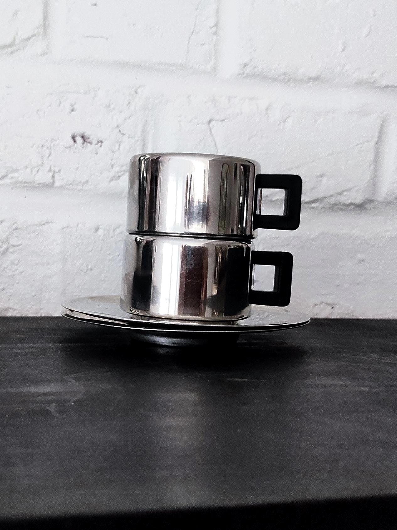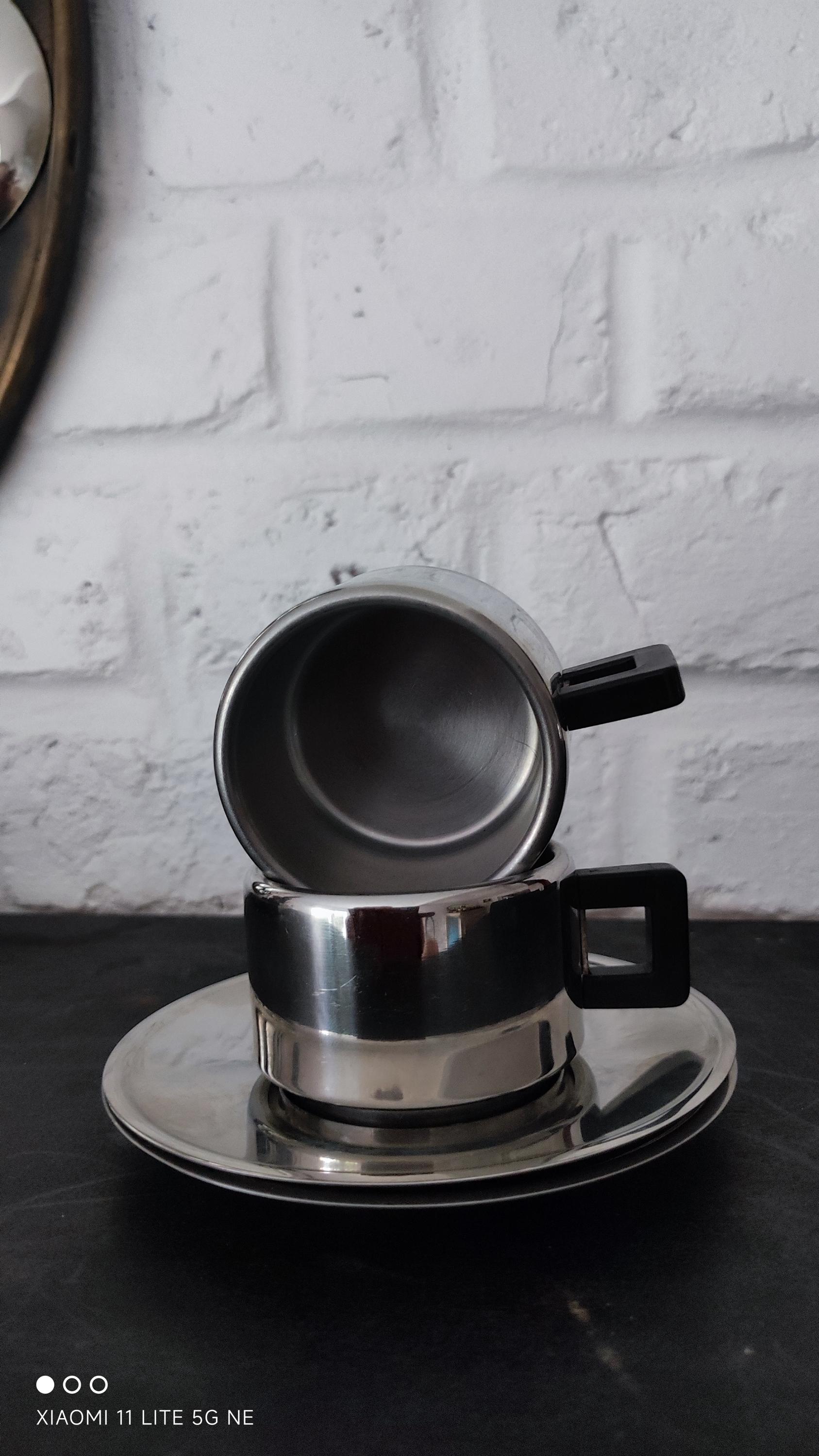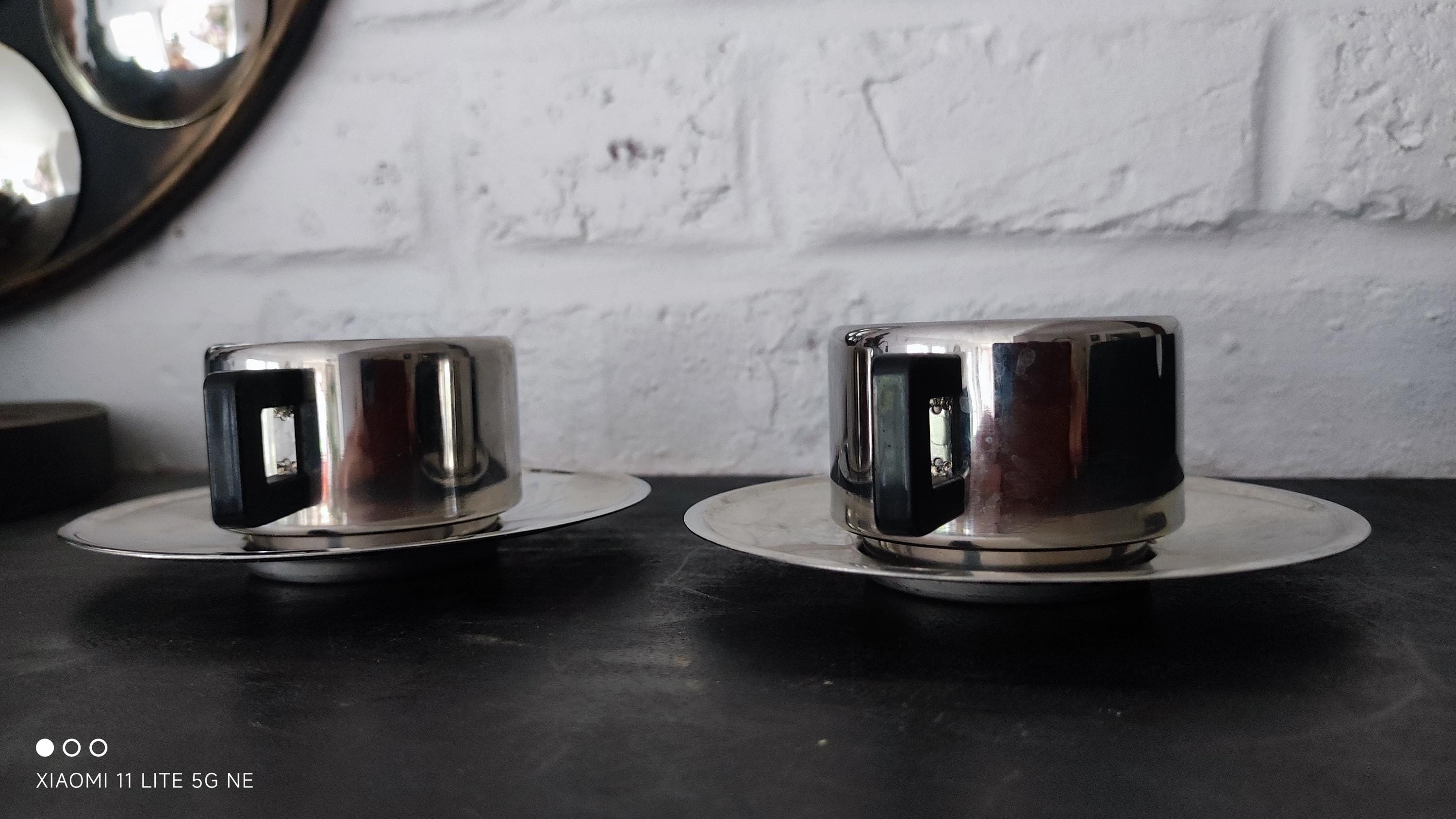 Tasses à expresso CASALINGHI vintage en acier inoxydable fabriqué en Italie des Années 1970s. Ensemble composé de 2 tasses à double paroi avec anse en plastique noir et 2 soucoupes au design très moderne et épurée.