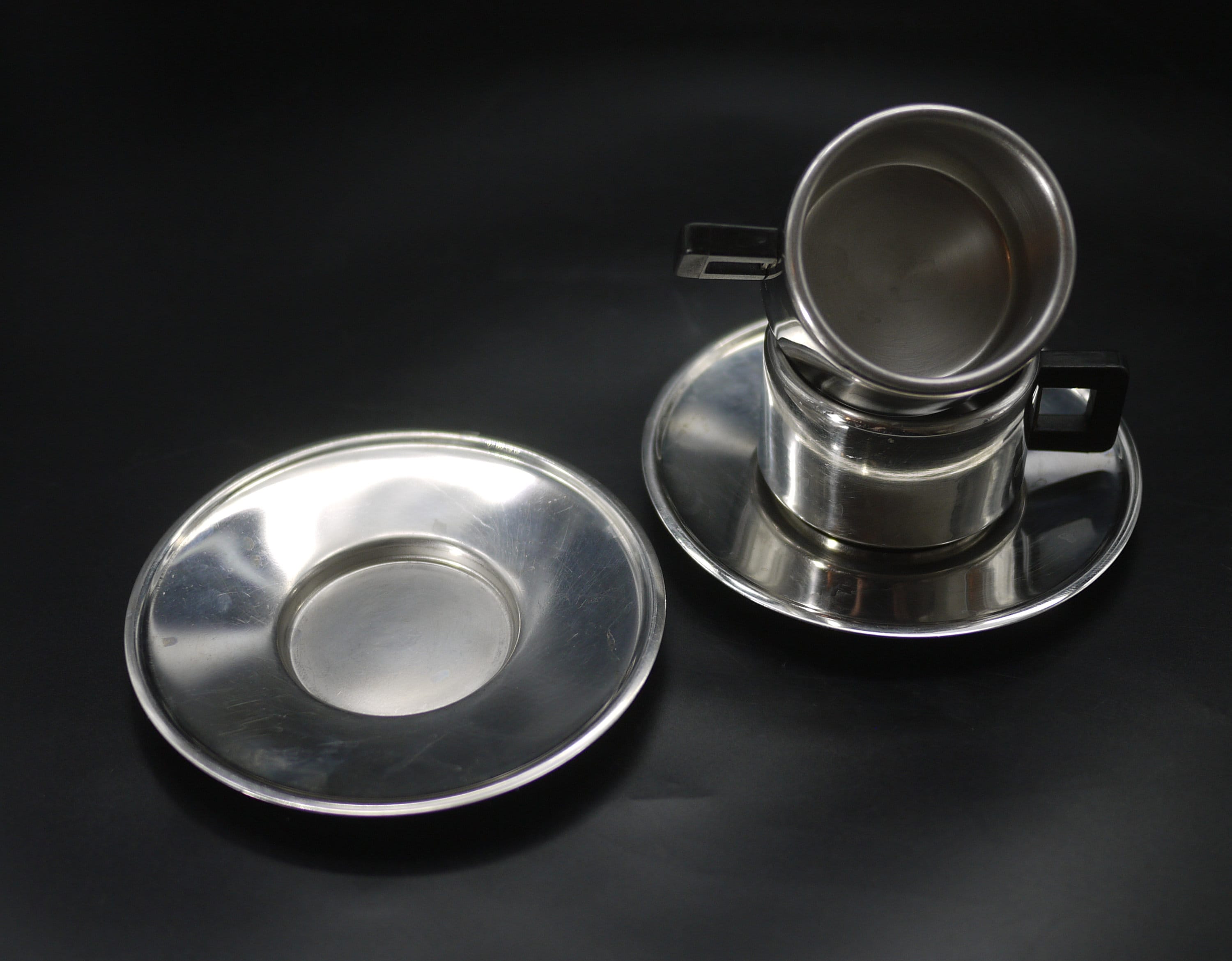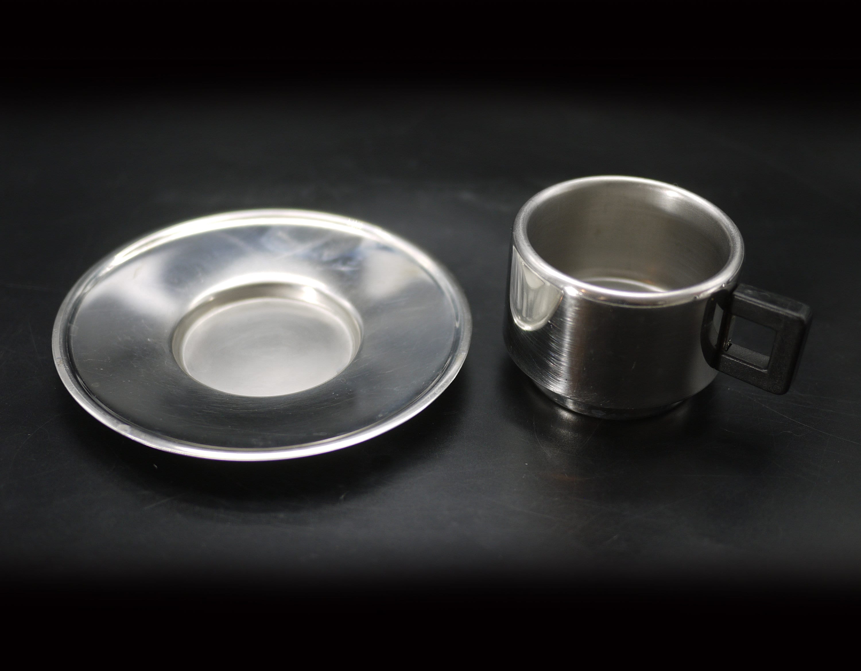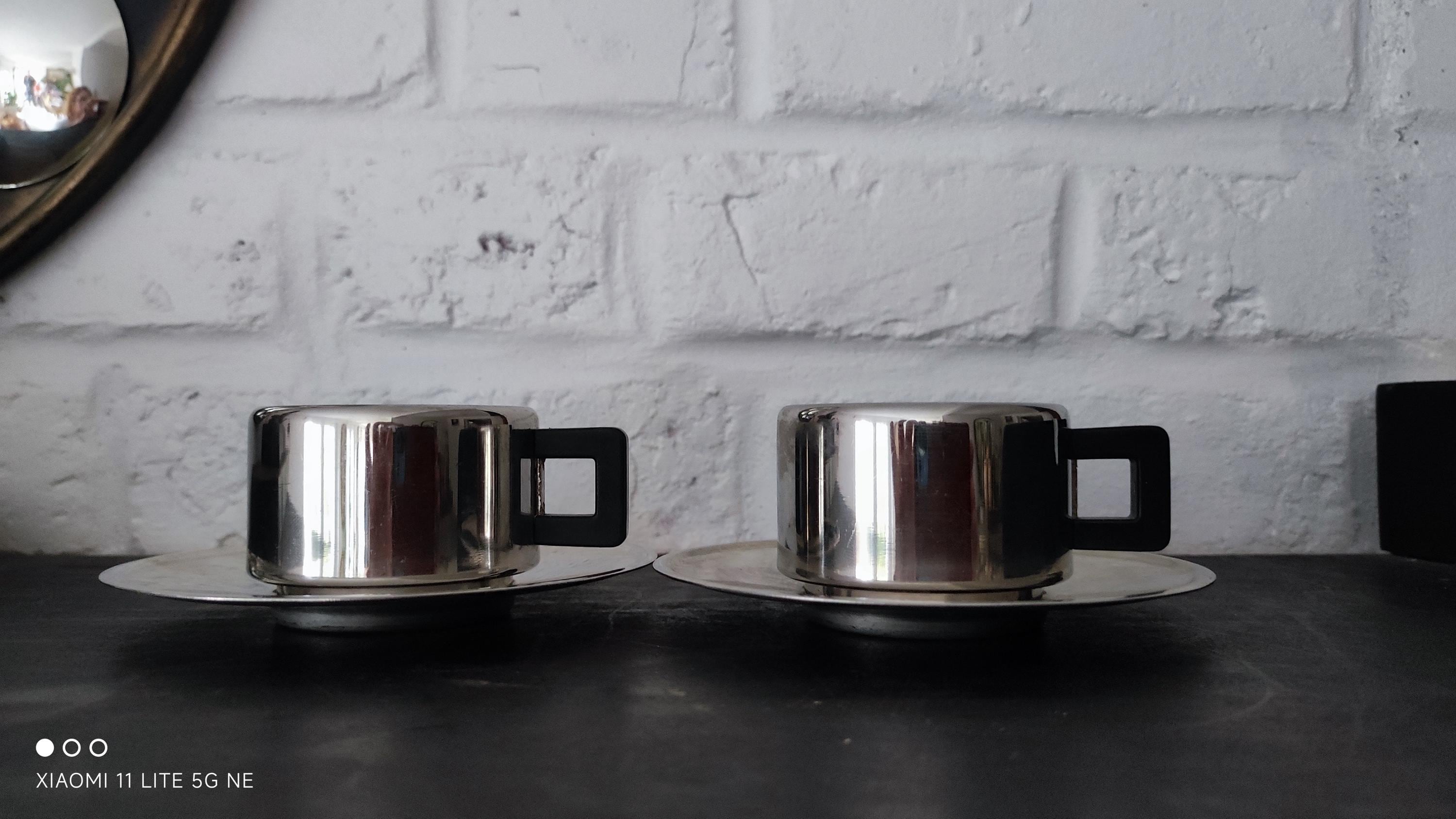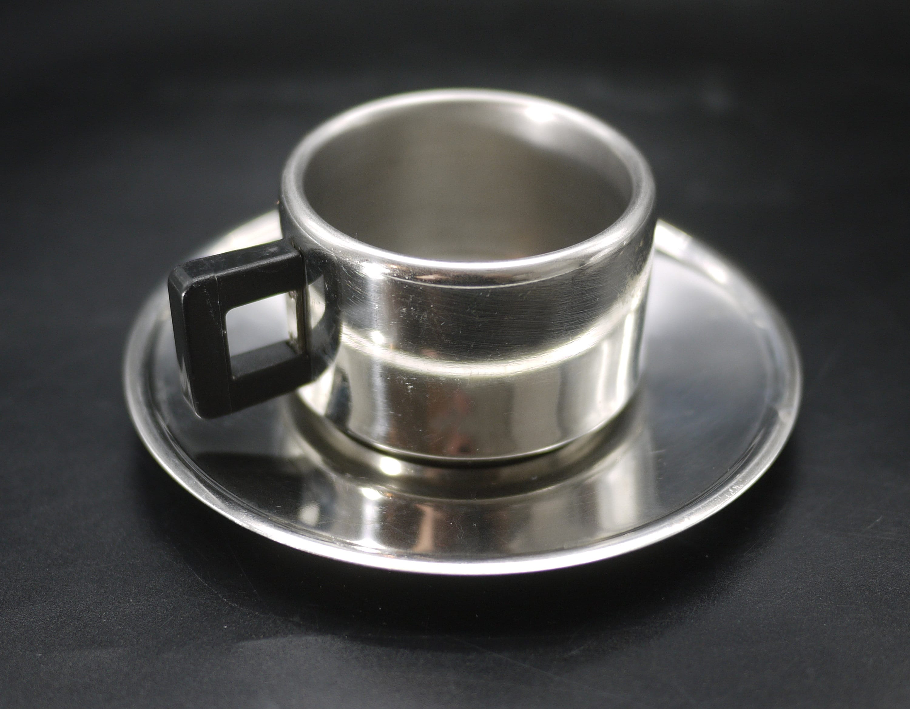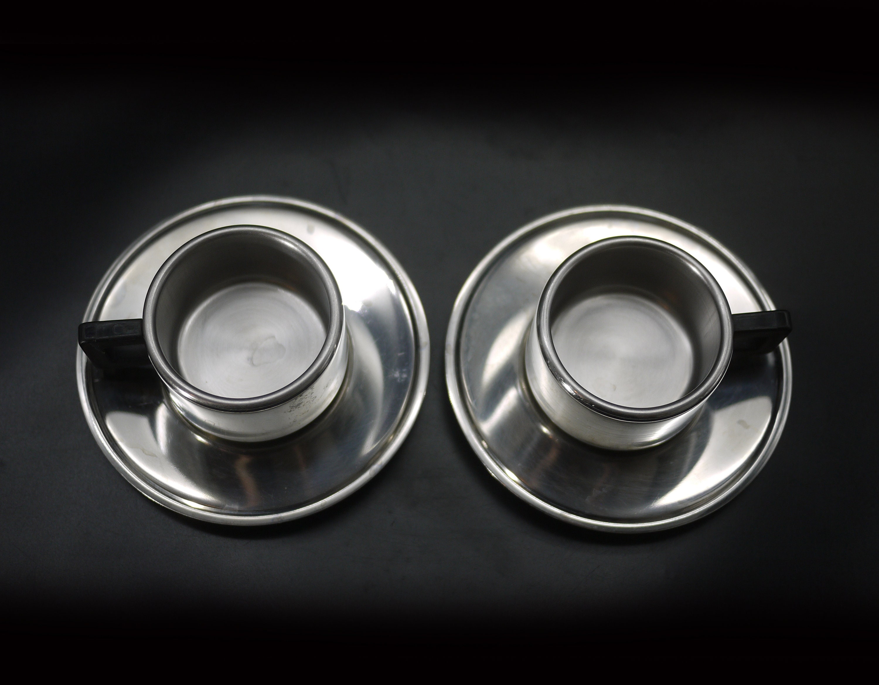 Tasses à expresso CASALINGHI vintage en acier inoxydable fabriqué en Italie des Années 1970s. Ensemble composé de 2 tasses à double paroi avec anse en plastique noir et 2 soucoupes au design très moderne et épurée.