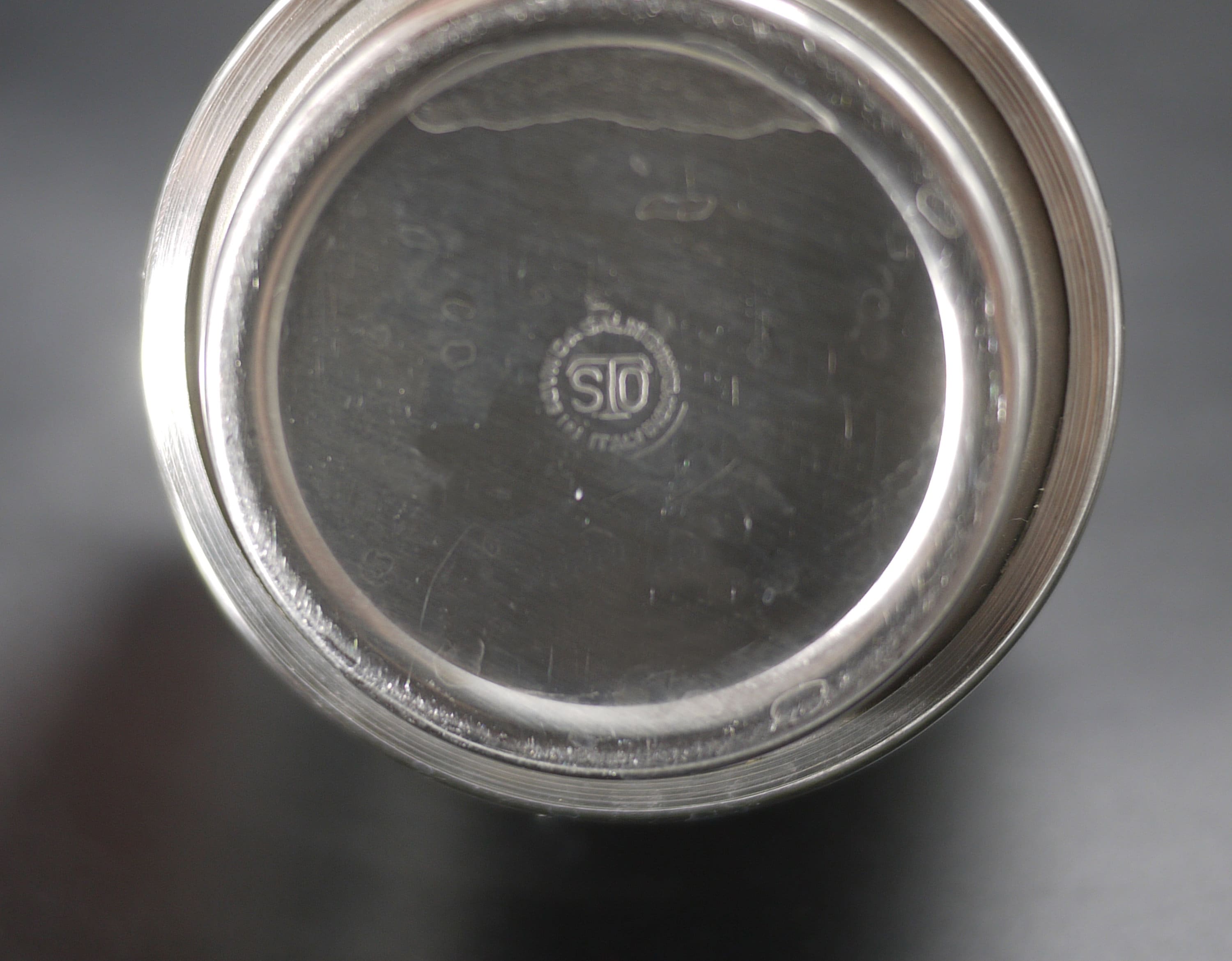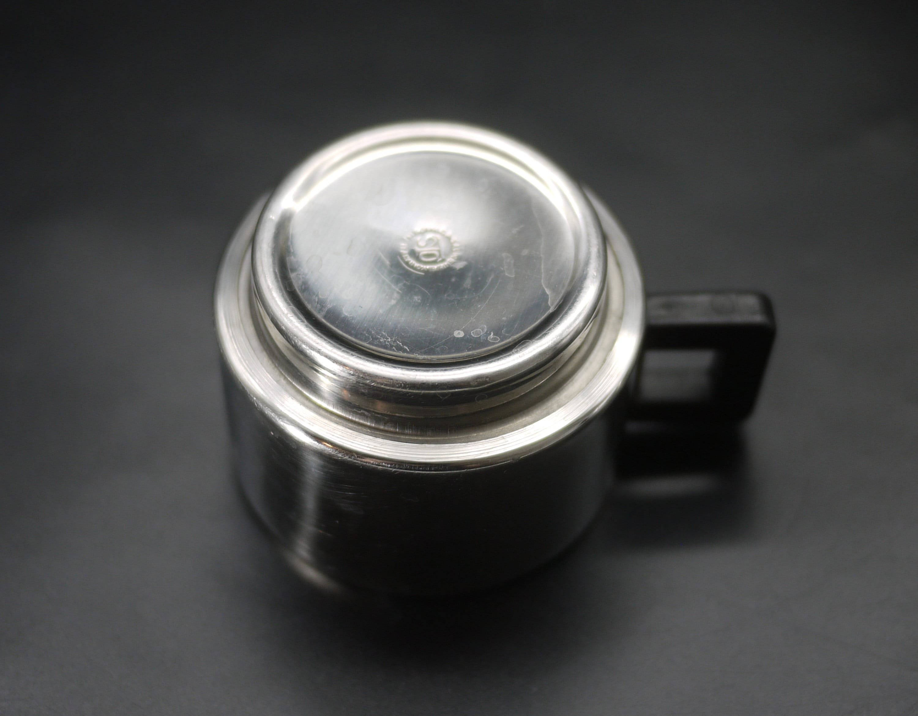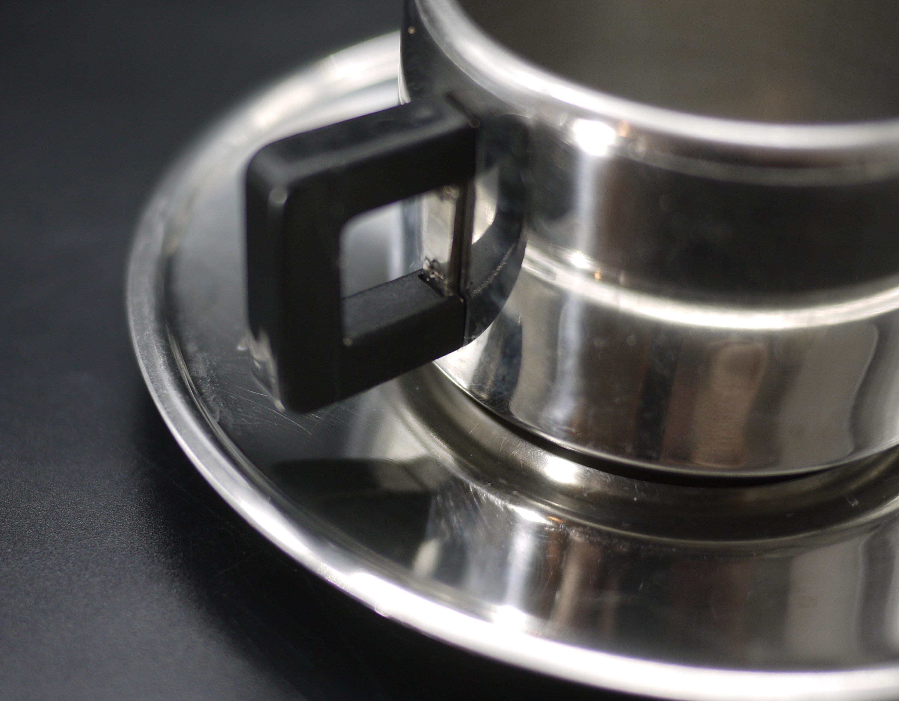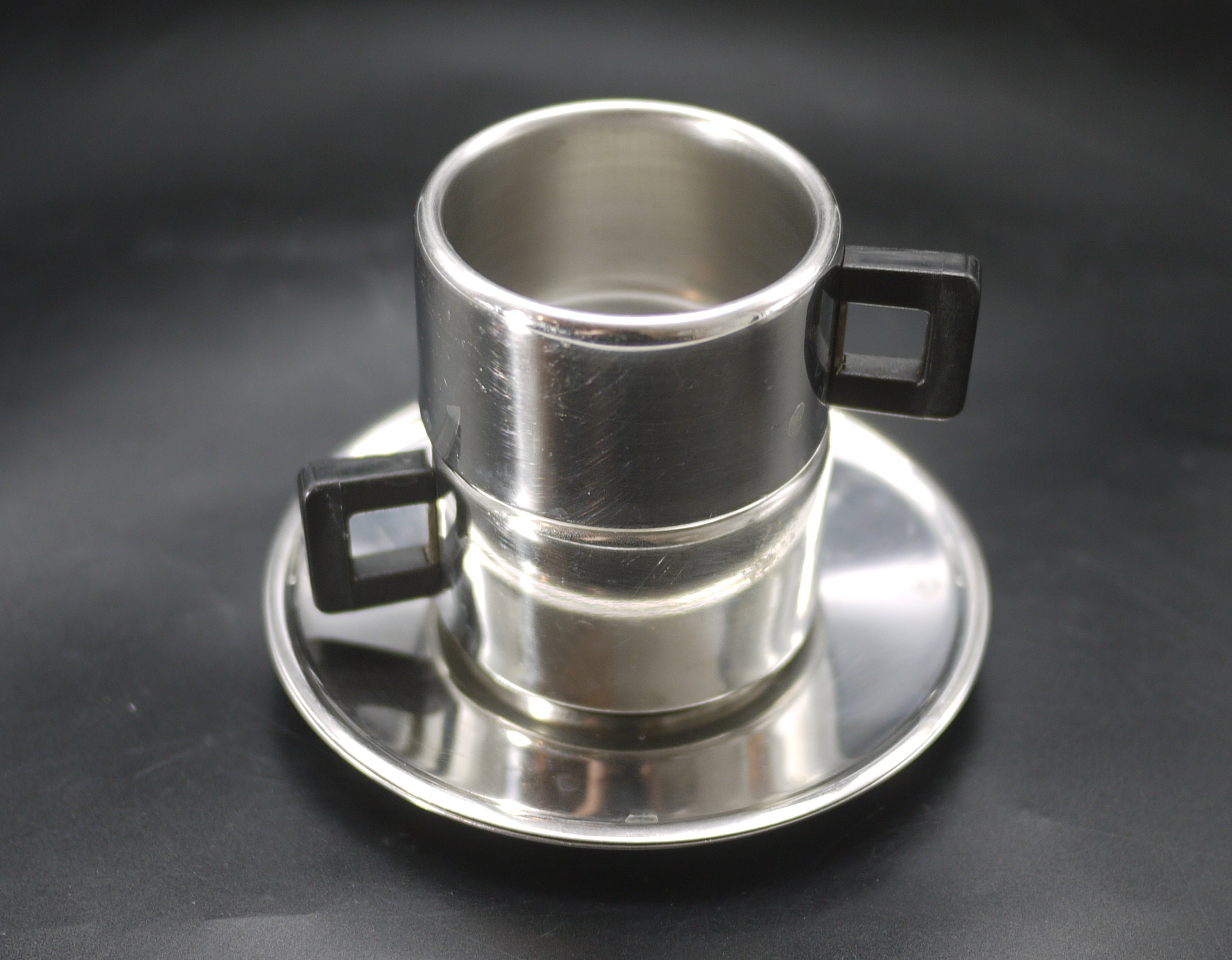 Tasses à expresso CASALINGHI vintage en acier inoxydable fabriqué en Italie des Années 1970s. Ensemble composé de 2 tasses à double paroi avec anse en plastique noir et 2 soucoupes au design très moderne et épurée.