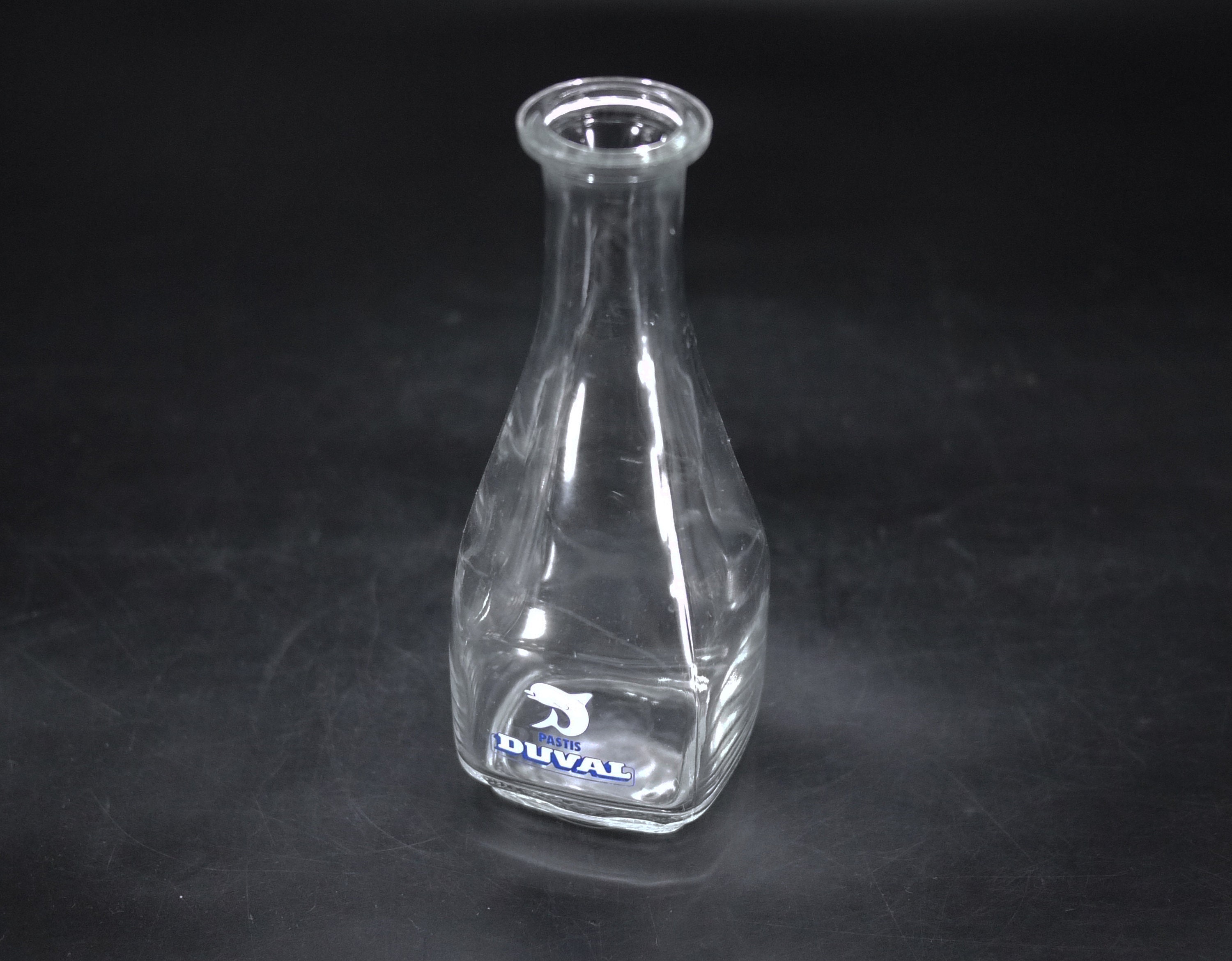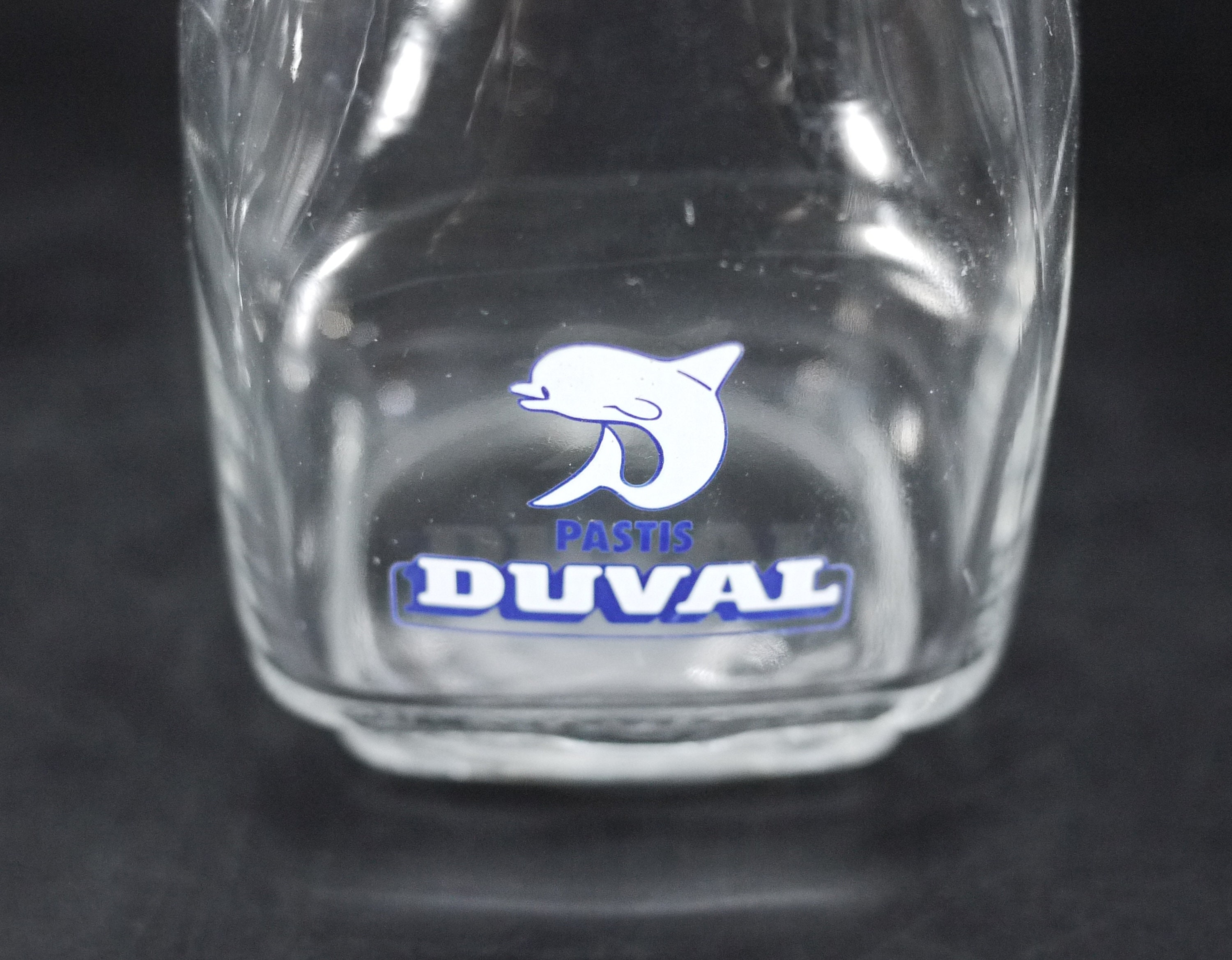 Vintage 25cl glass Pastis Duval carafe with white and blue dolphin logo and Pastis Duval glass from the 1960s