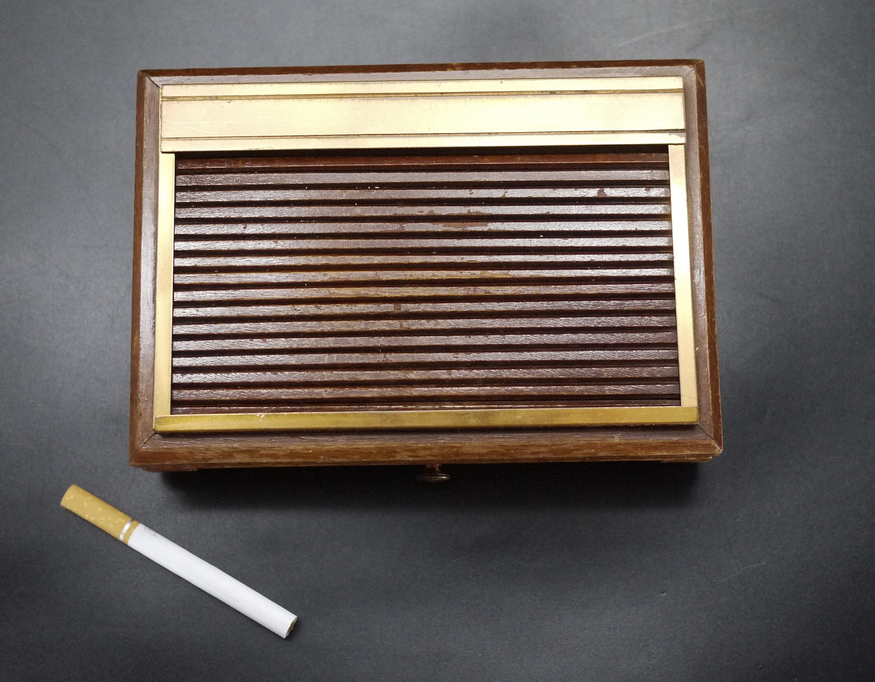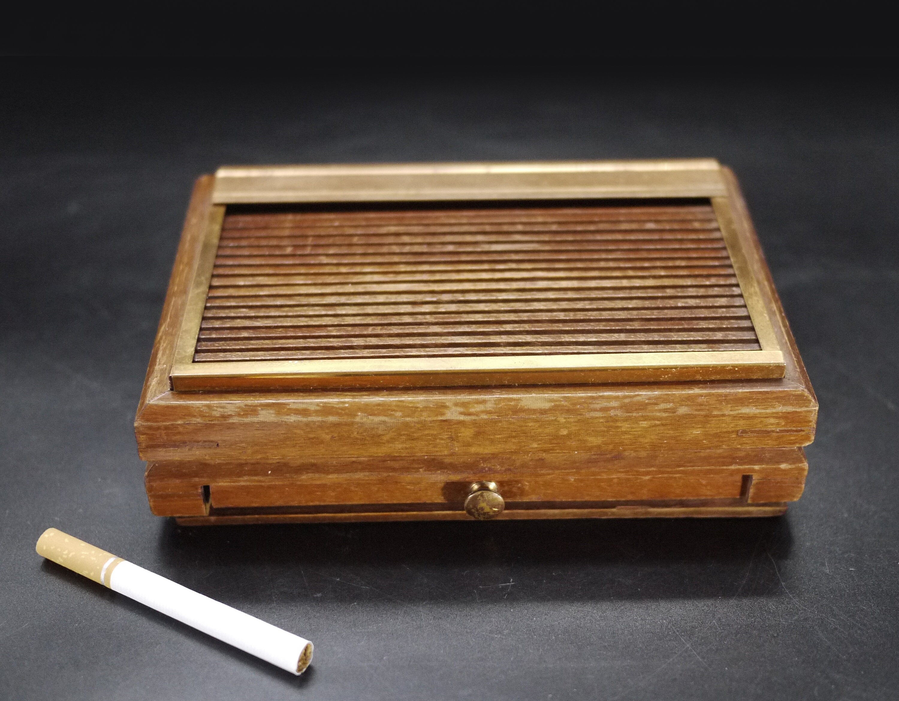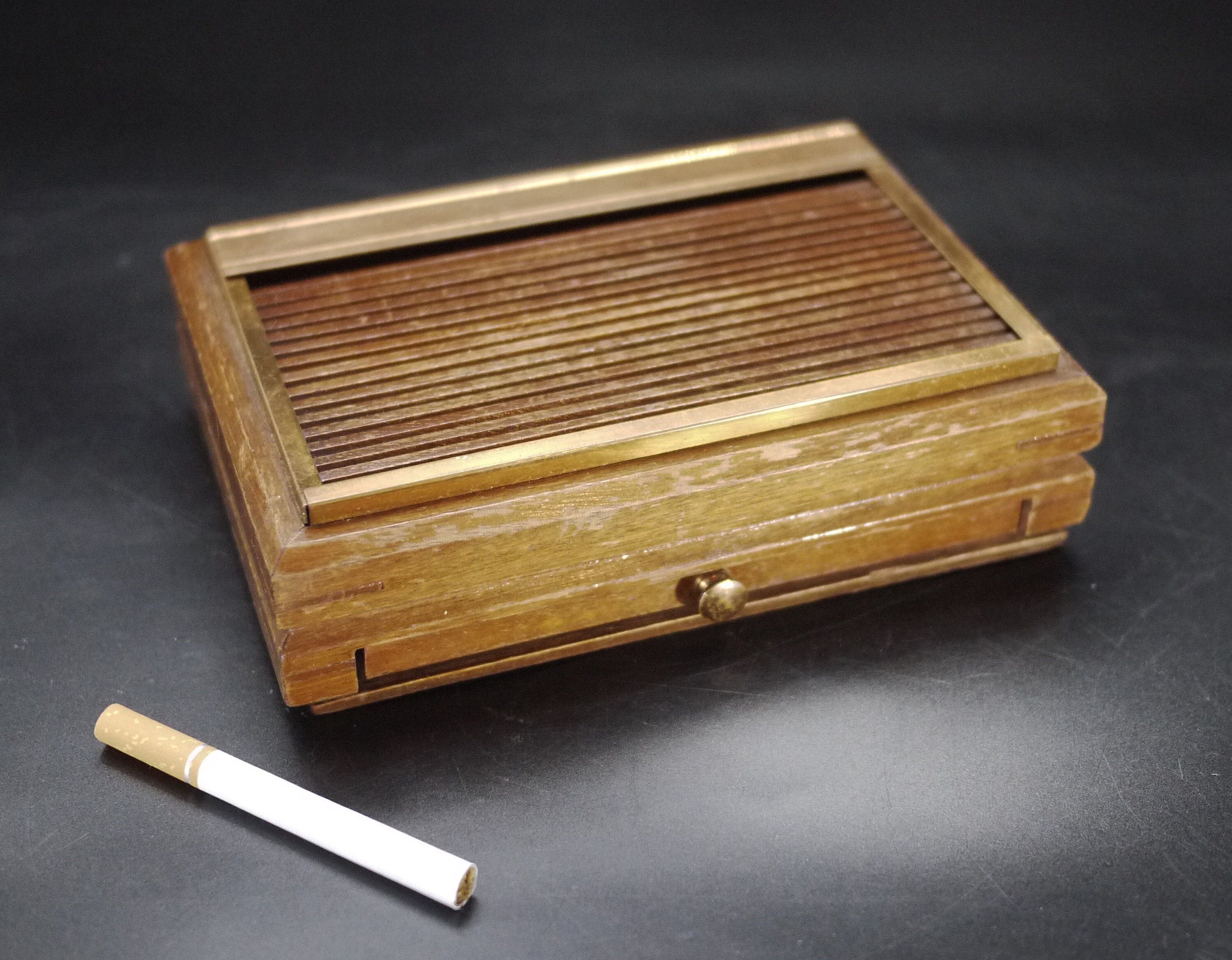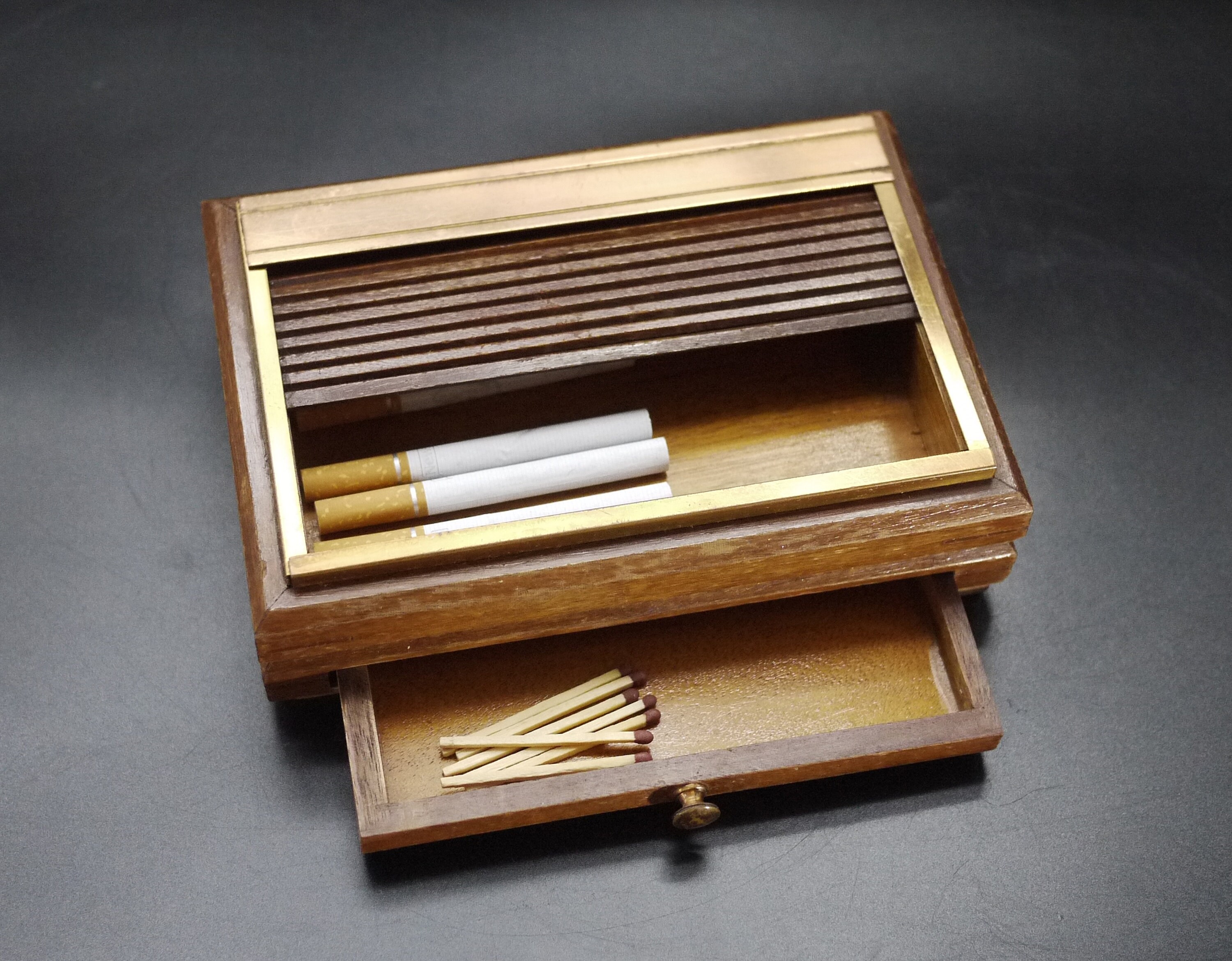 la boîte des cigarettes ou cigares. Le bouton du tiroir ainsi que le haut de la boîte sont décorés de laiton.