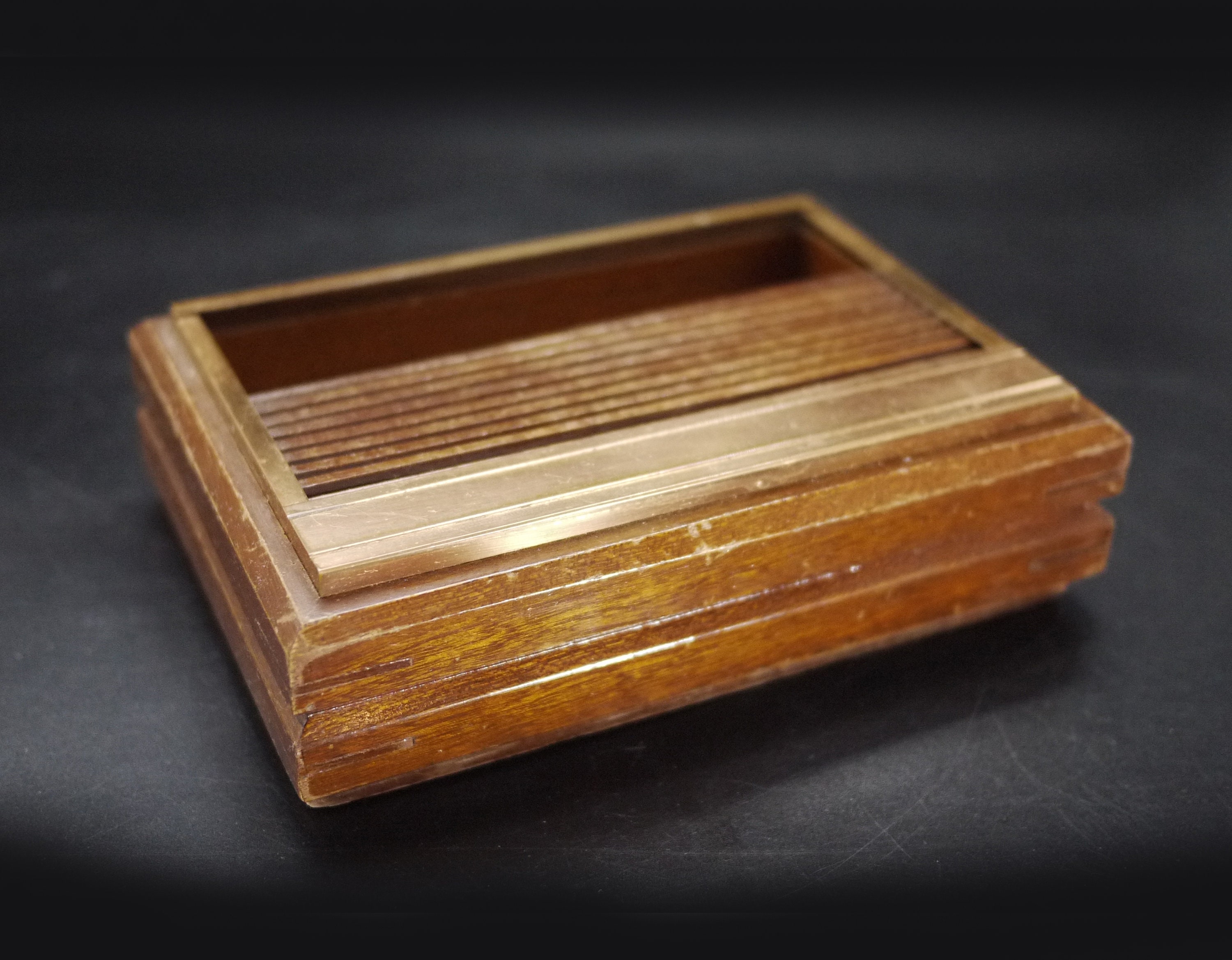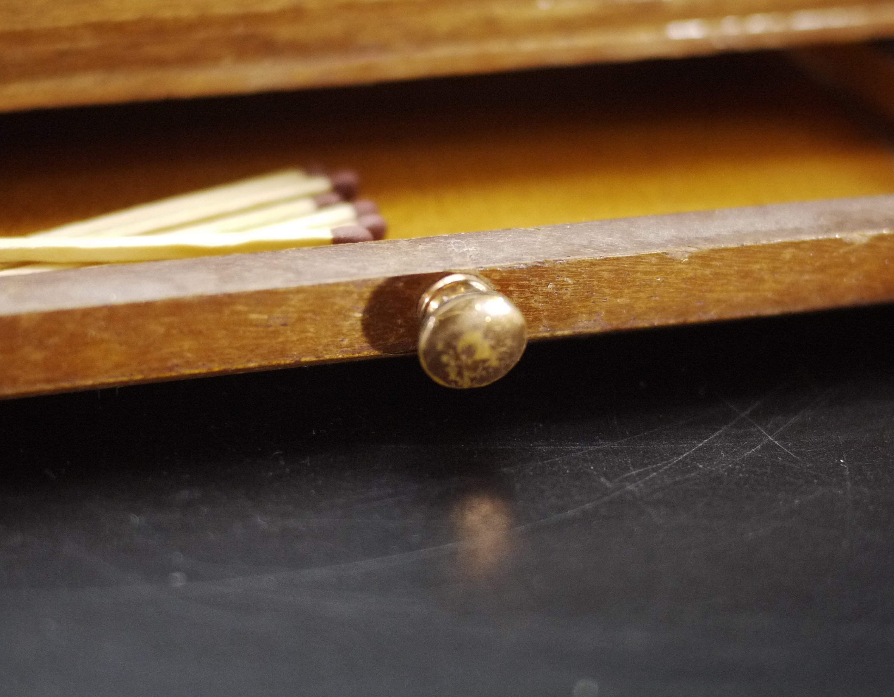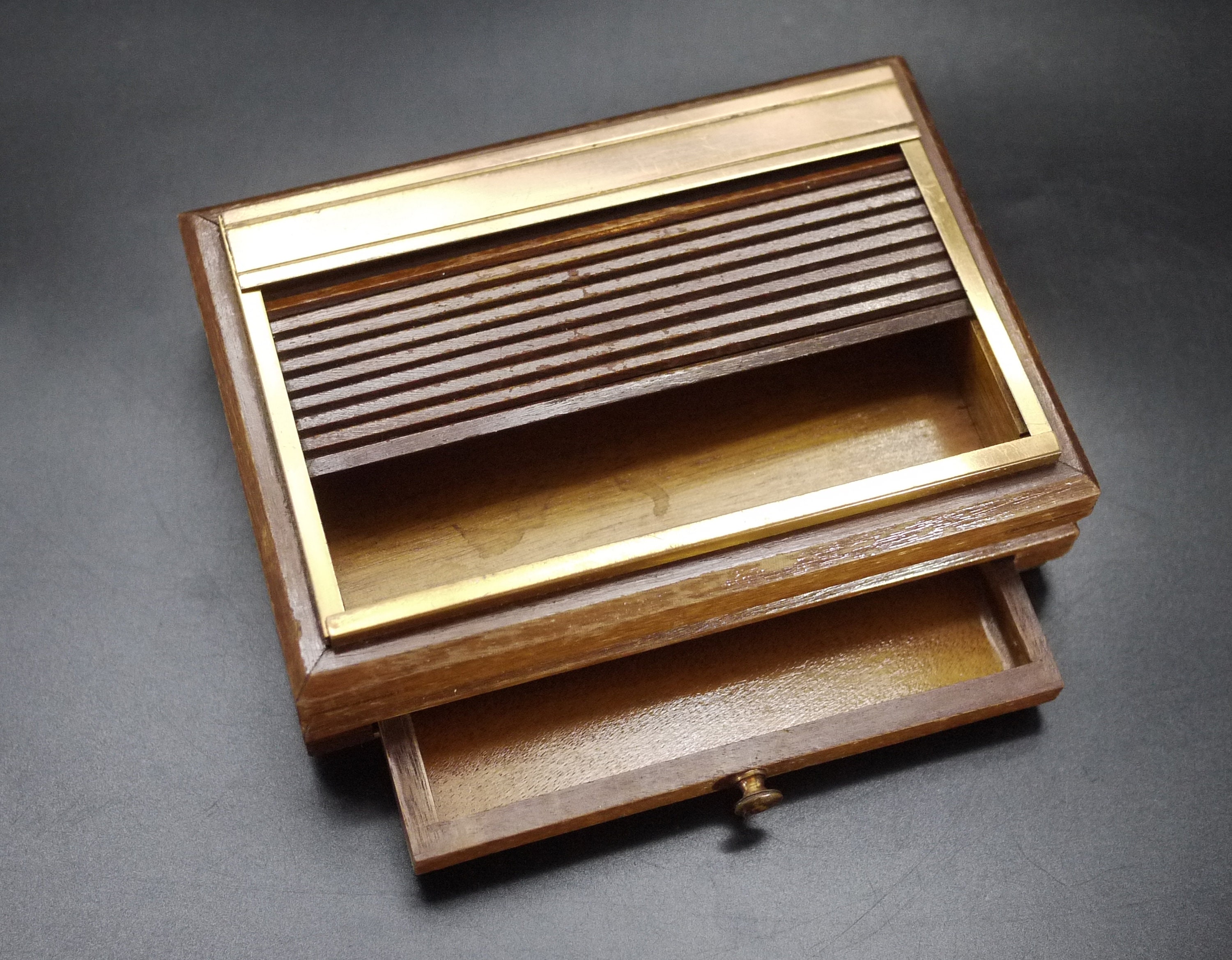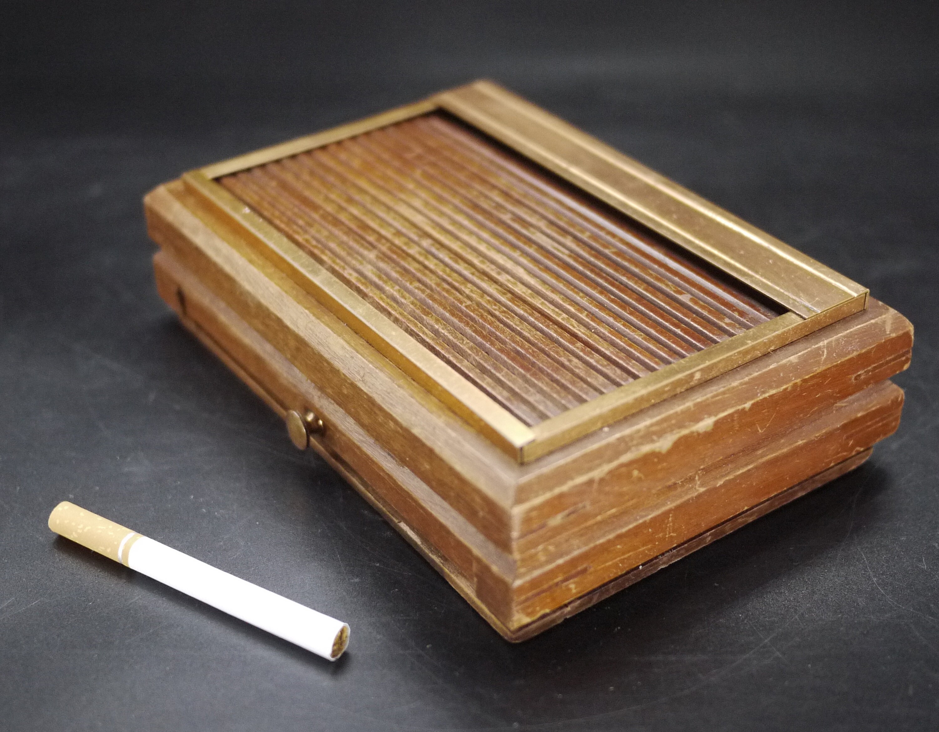 la boîte des cigarettes ou cigares. Le bouton du tiroir ainsi que le haut de la boîte sont décorés de laiton.