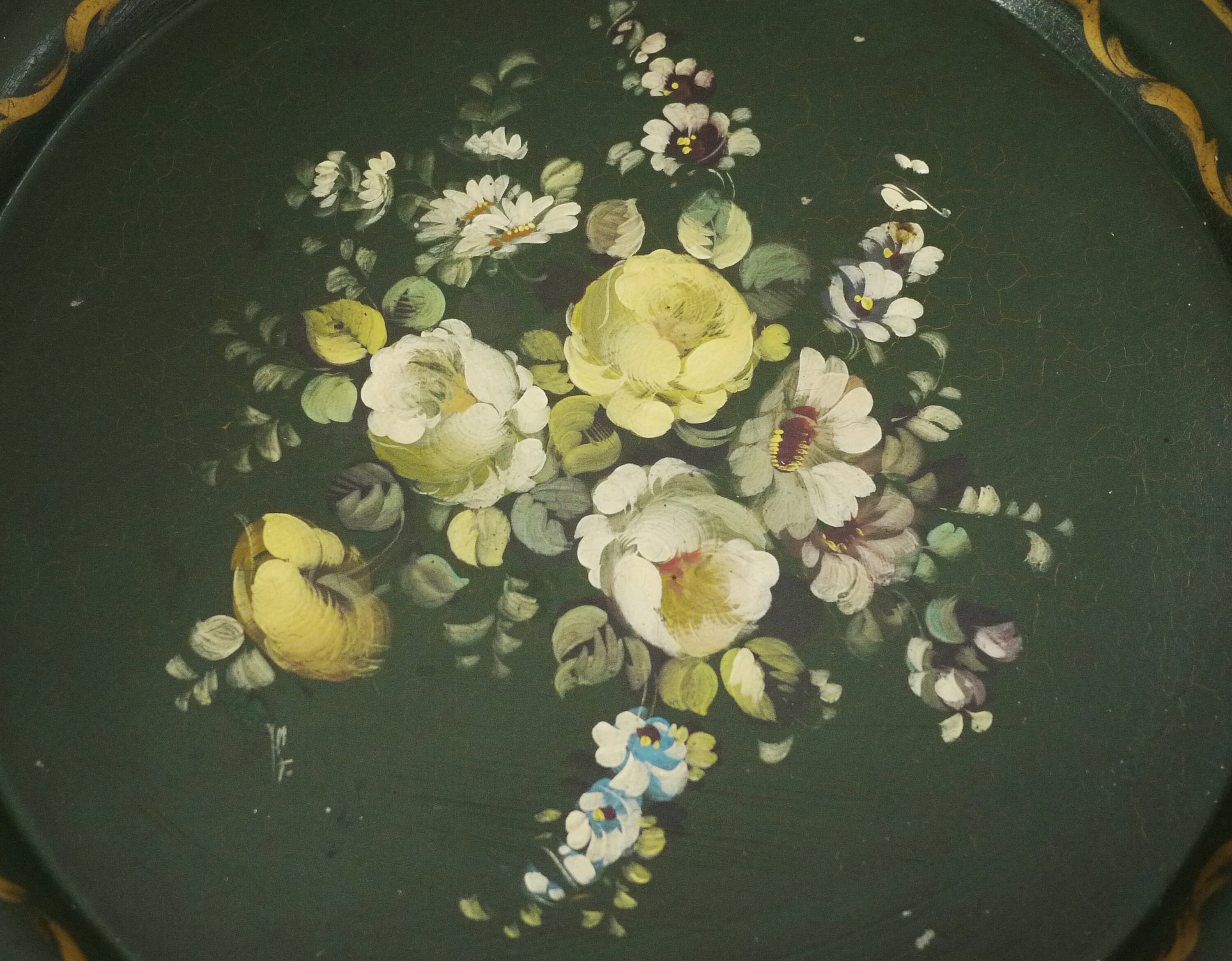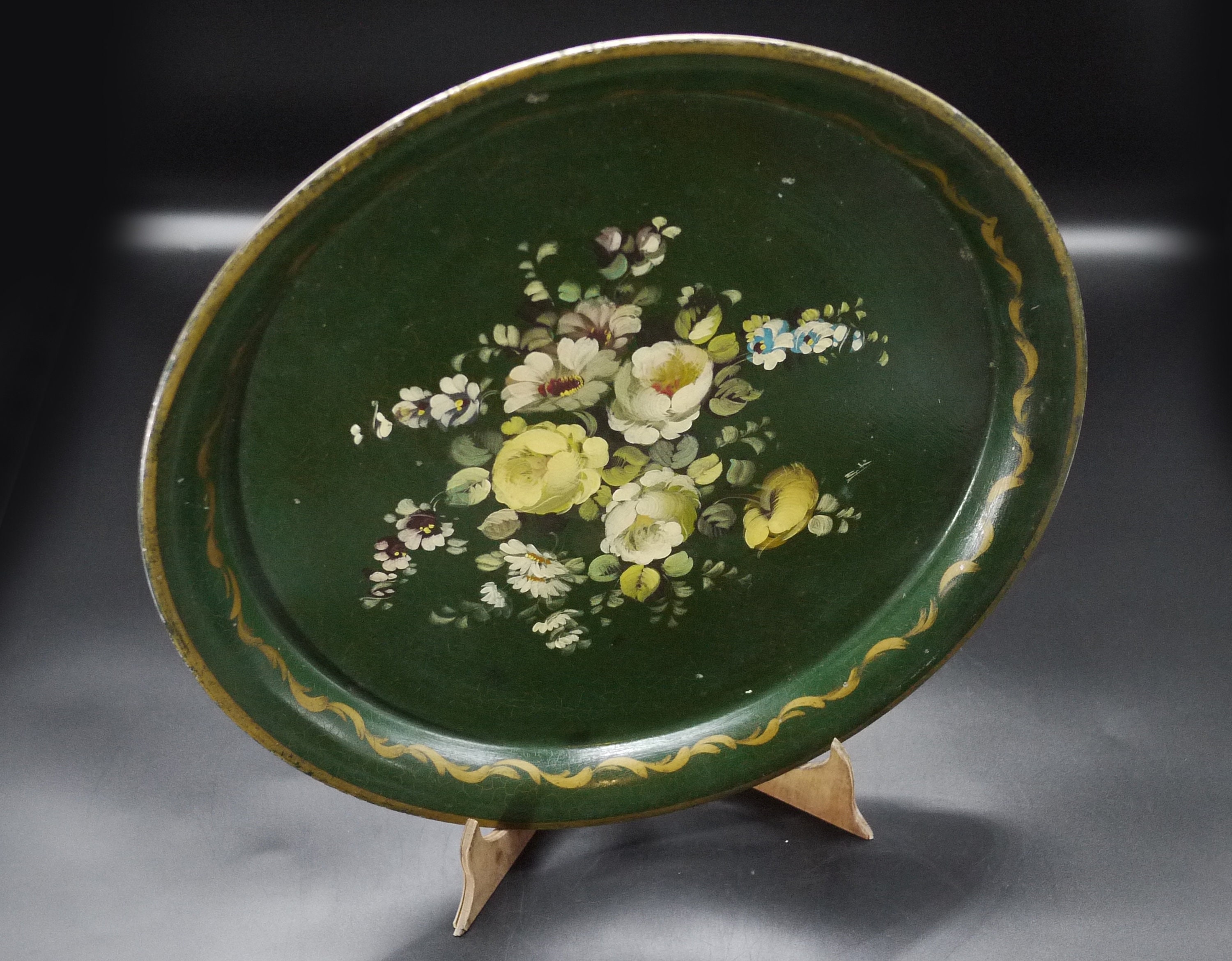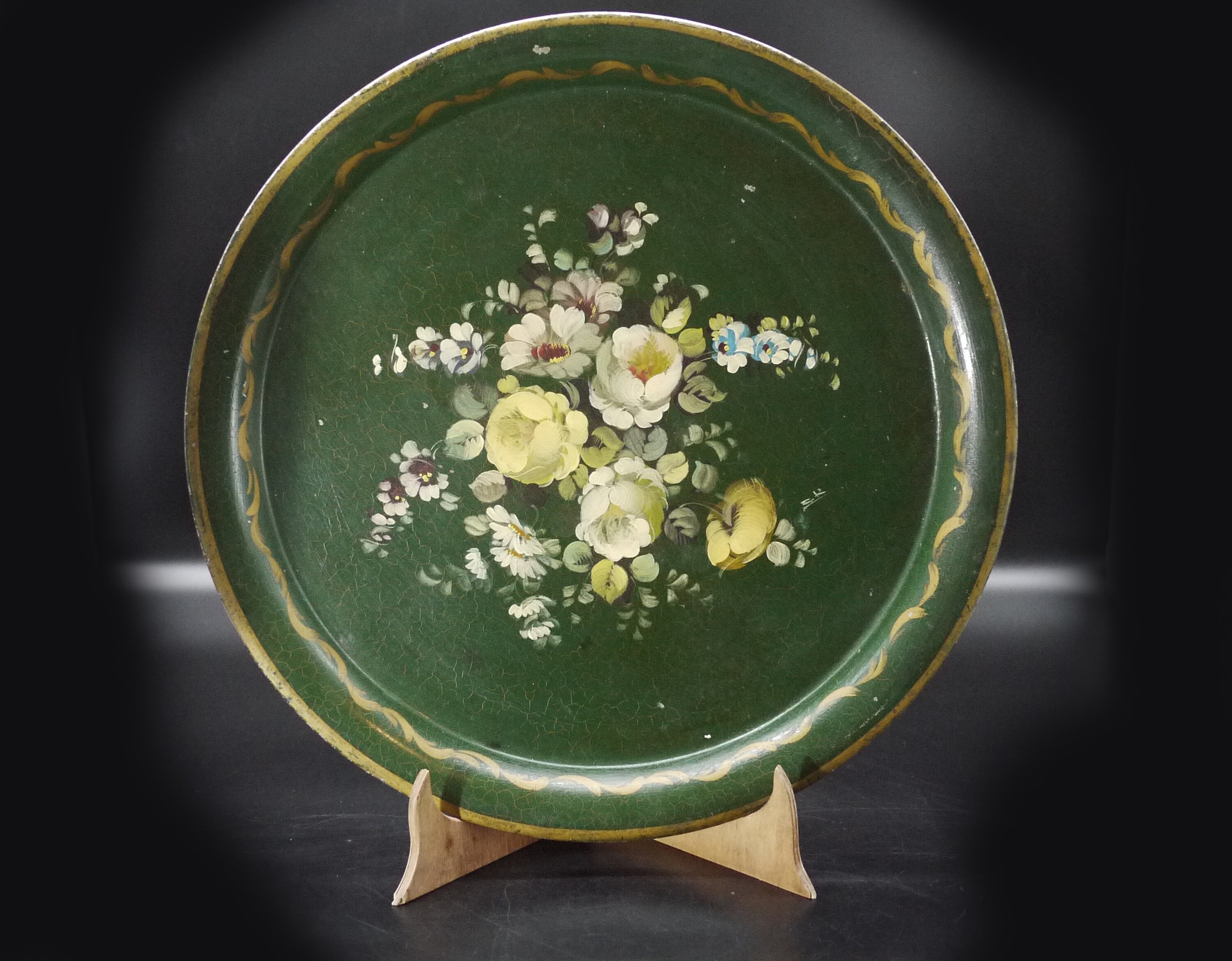 Large hand-painted antique French sheet metal tray with romantic floral decoration of French roses on a green background from the beginning of the Century in Napoleon III style. This large round shaped tray is a wonderful, highly decorative antique piece