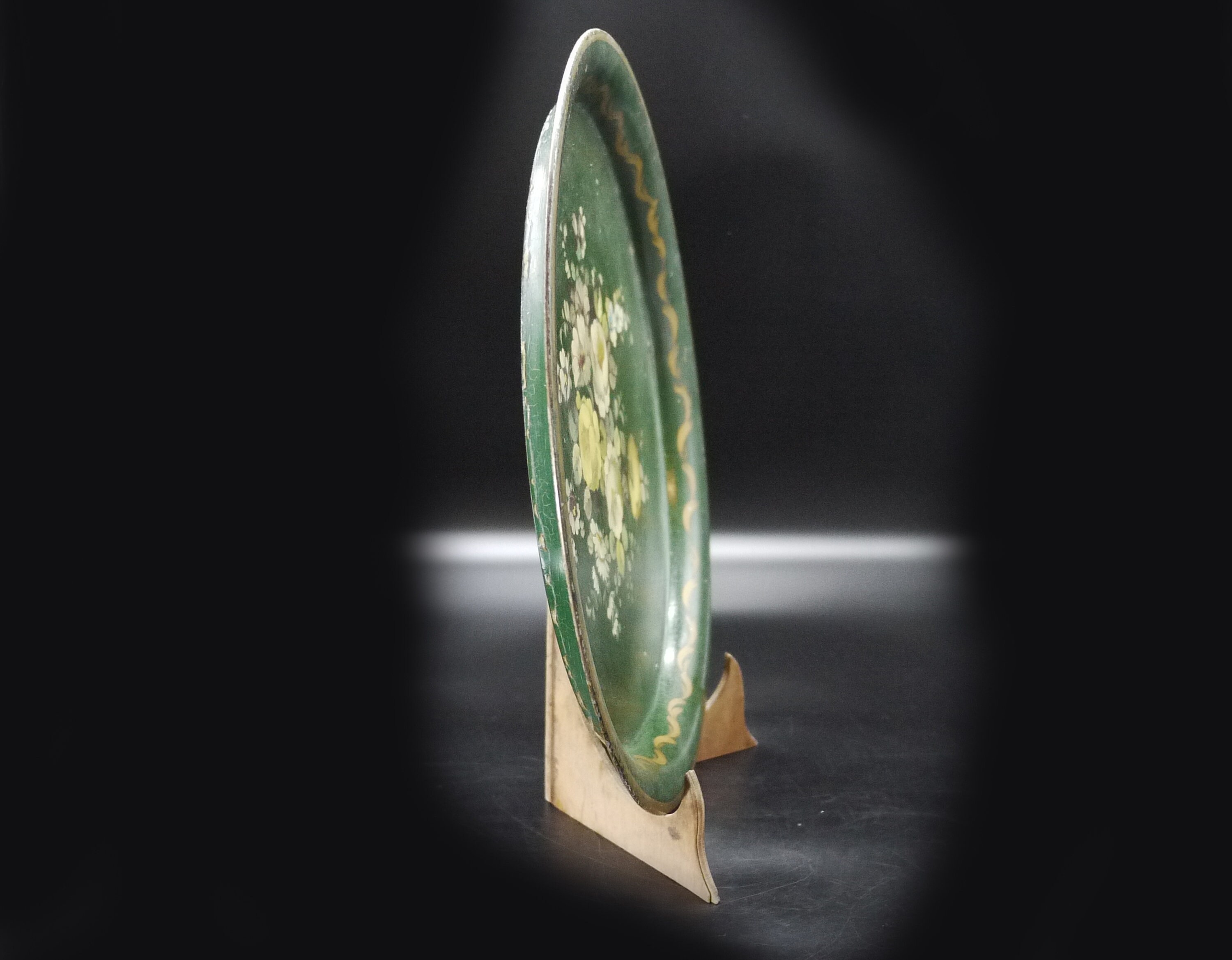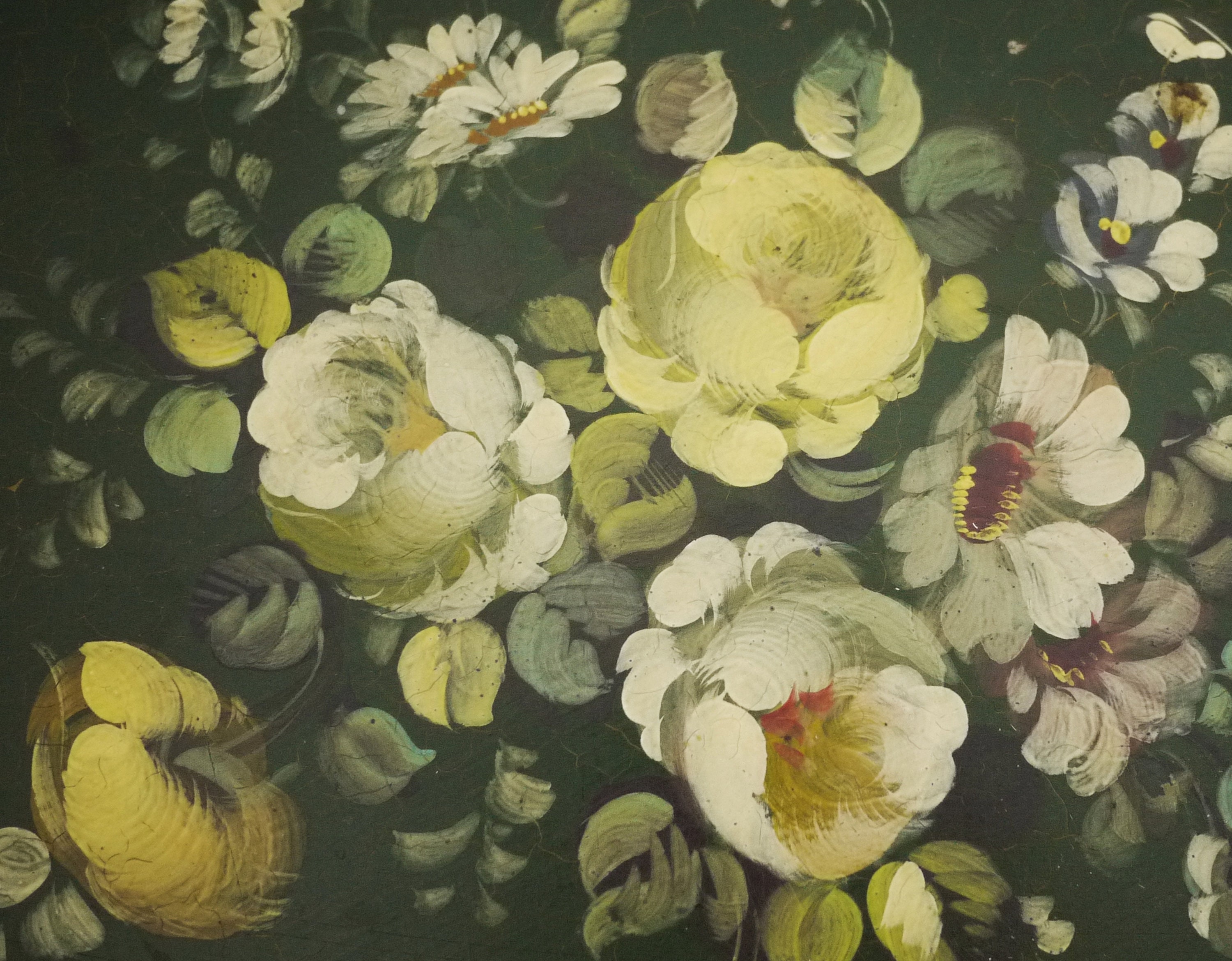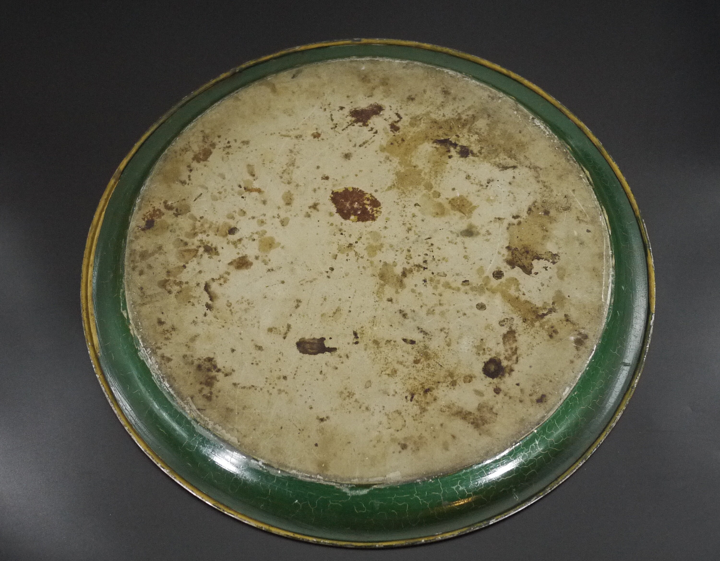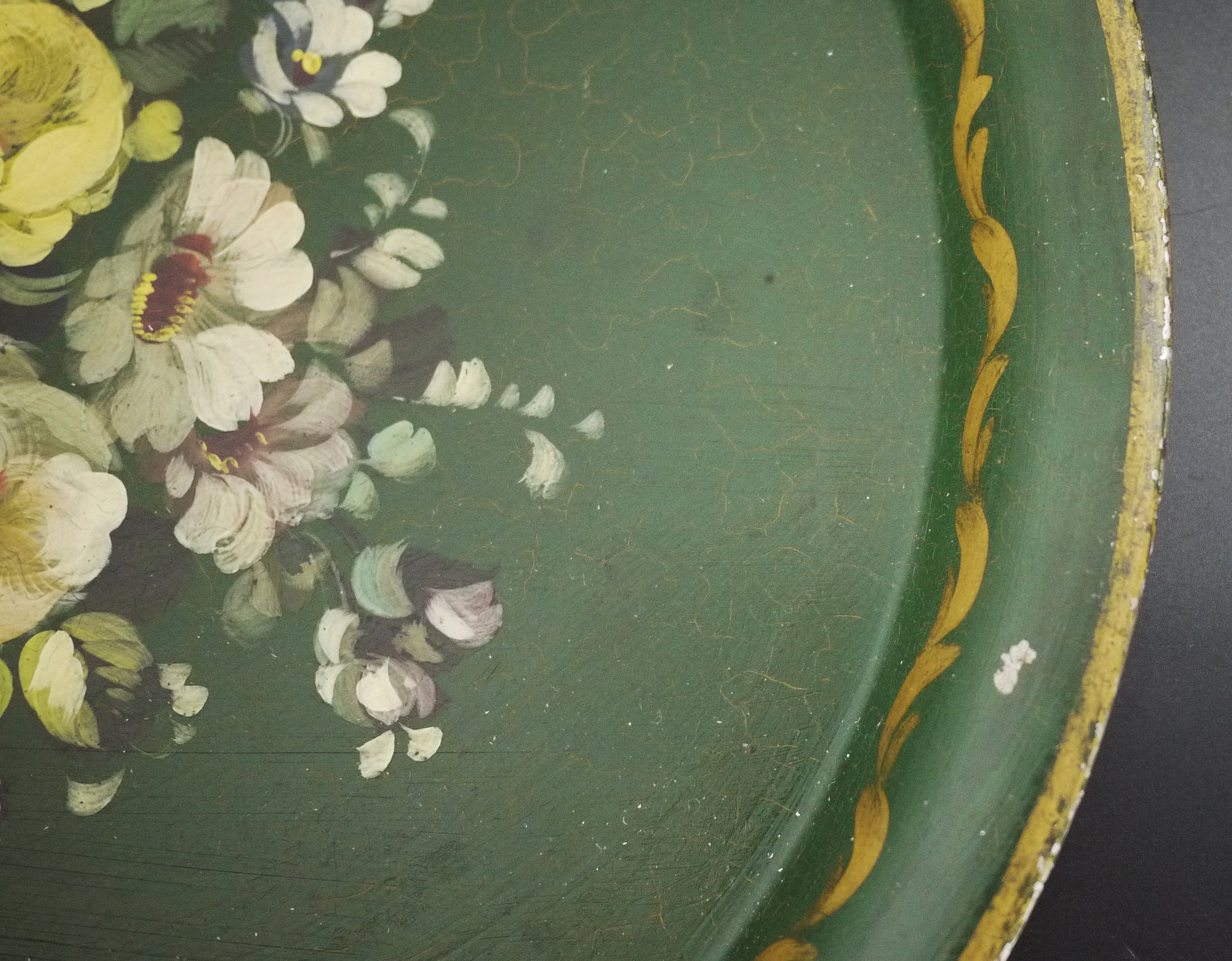 Large hand-painted antique French sheet metal tray with romantic floral decoration of French roses on a green background from the beginning of the Century in Napoleon III style. This large round shaped tray is a wonderful, highly decorative antique piece